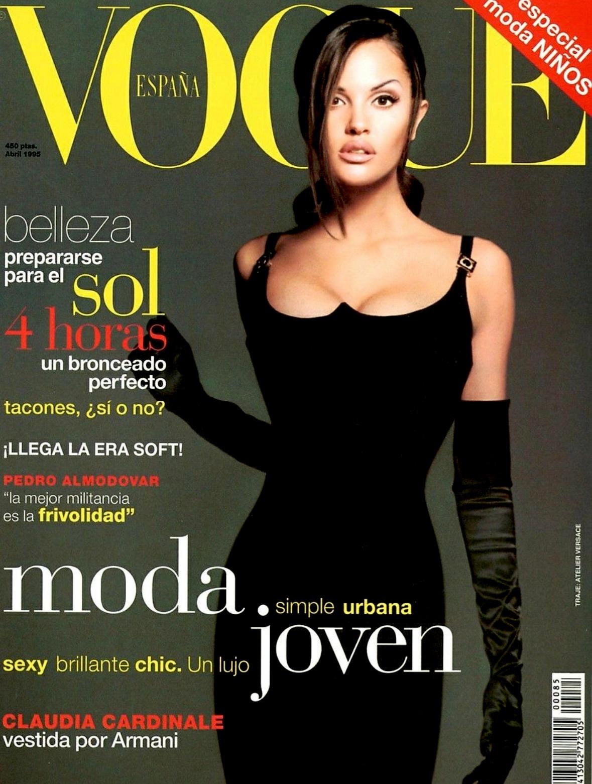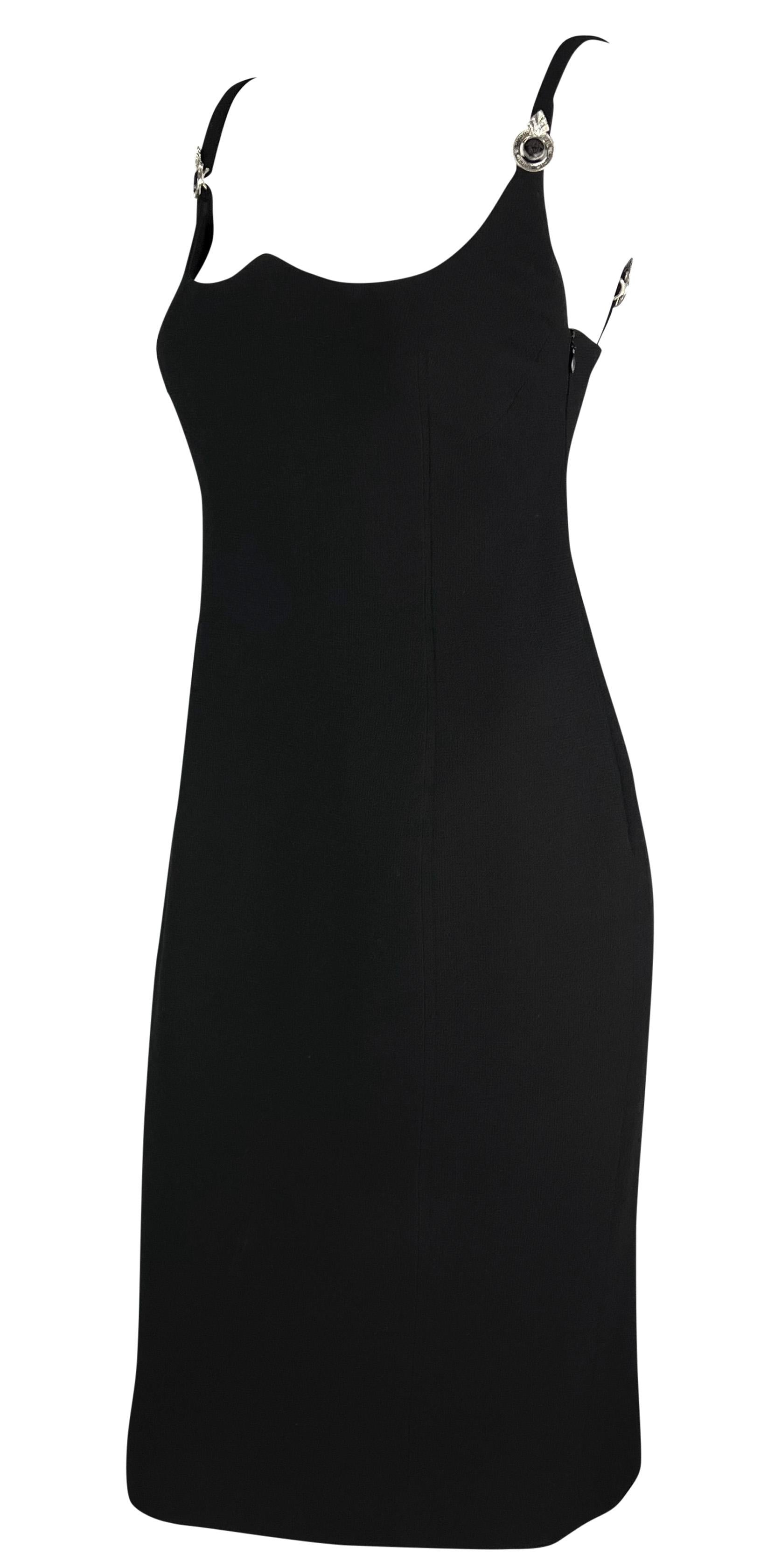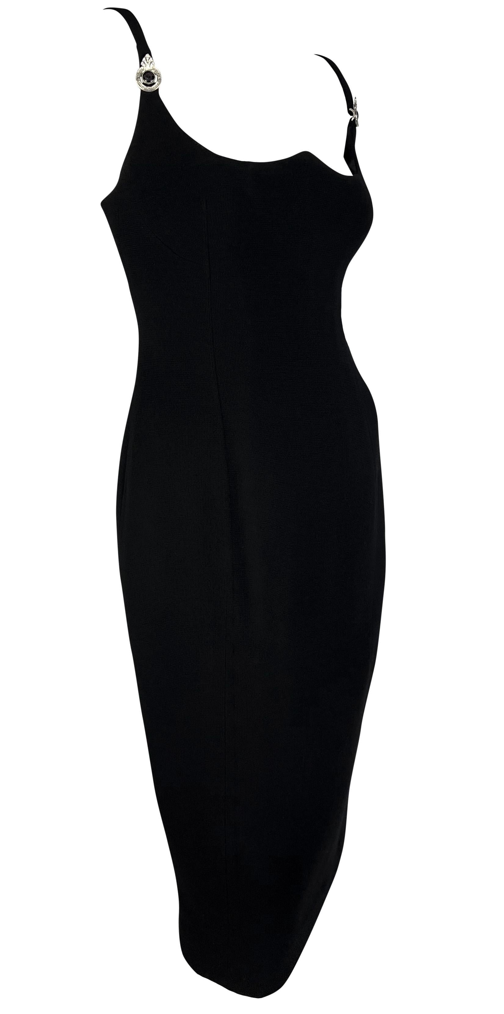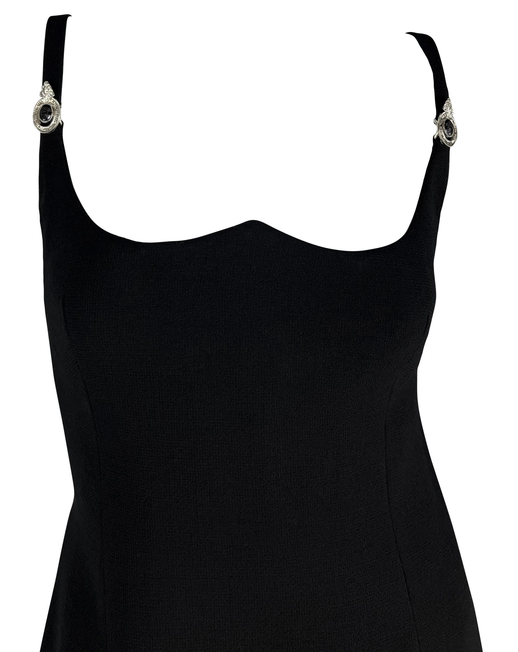 From 1995, this fitted black Gianni Versace dress debuted on the Spring season's Atelier Versace runway, modeled by Shalom Harlow. This dress was further highlighted by model Claudia Mason on the April 1995 cover of Vogue España, captured by Steven Meisel. Also captured by Ellen von Unworthy for the March 1995 issue of Vogue Italia on Bridget Hall. This sexy little black dress features silver-tone Versace Medusa emblems on the front and back of either strap and is made complete with a peaked neckline.