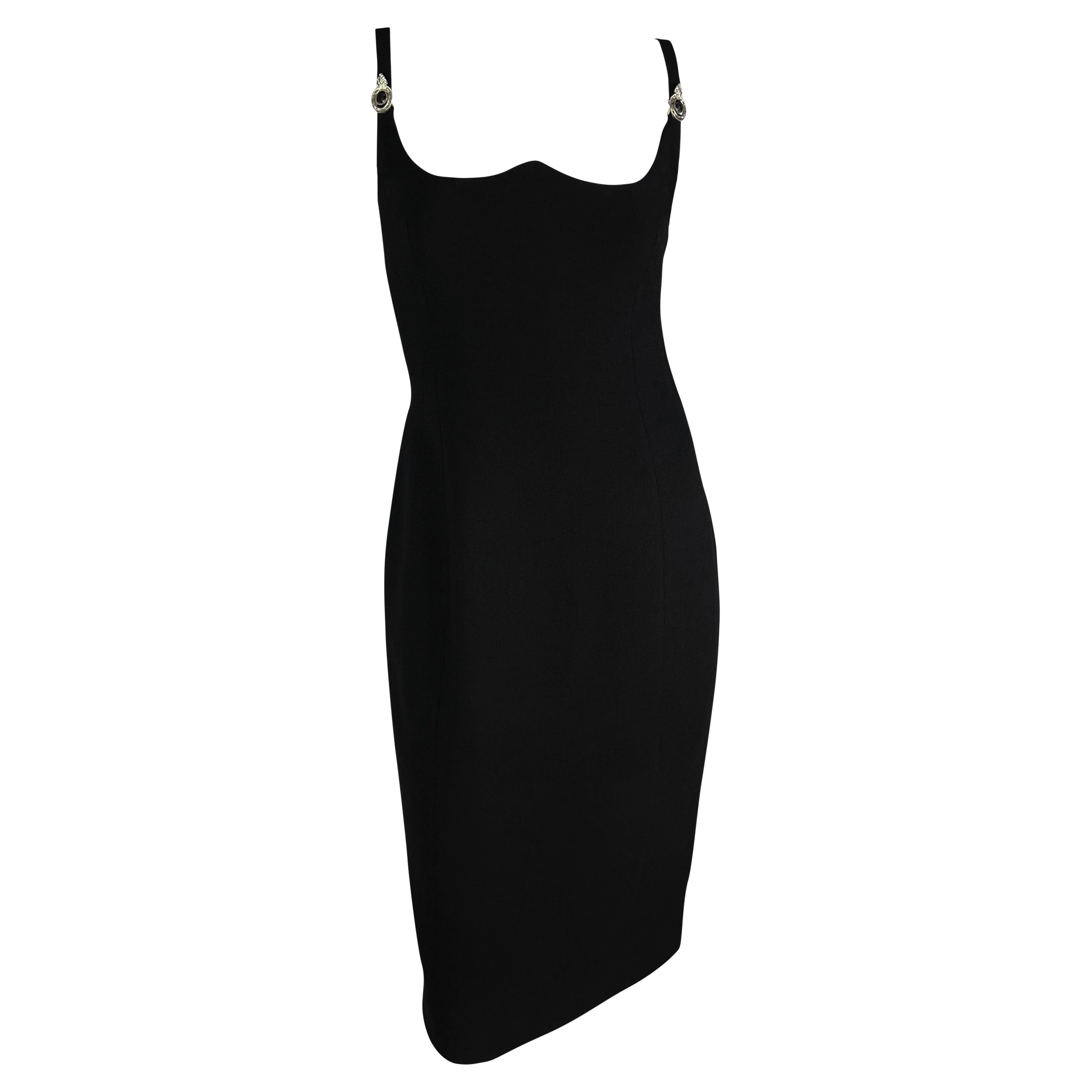 1995 Gianni Versace Black Sweetheart Neckline Rhinestone Medusa Black Dress