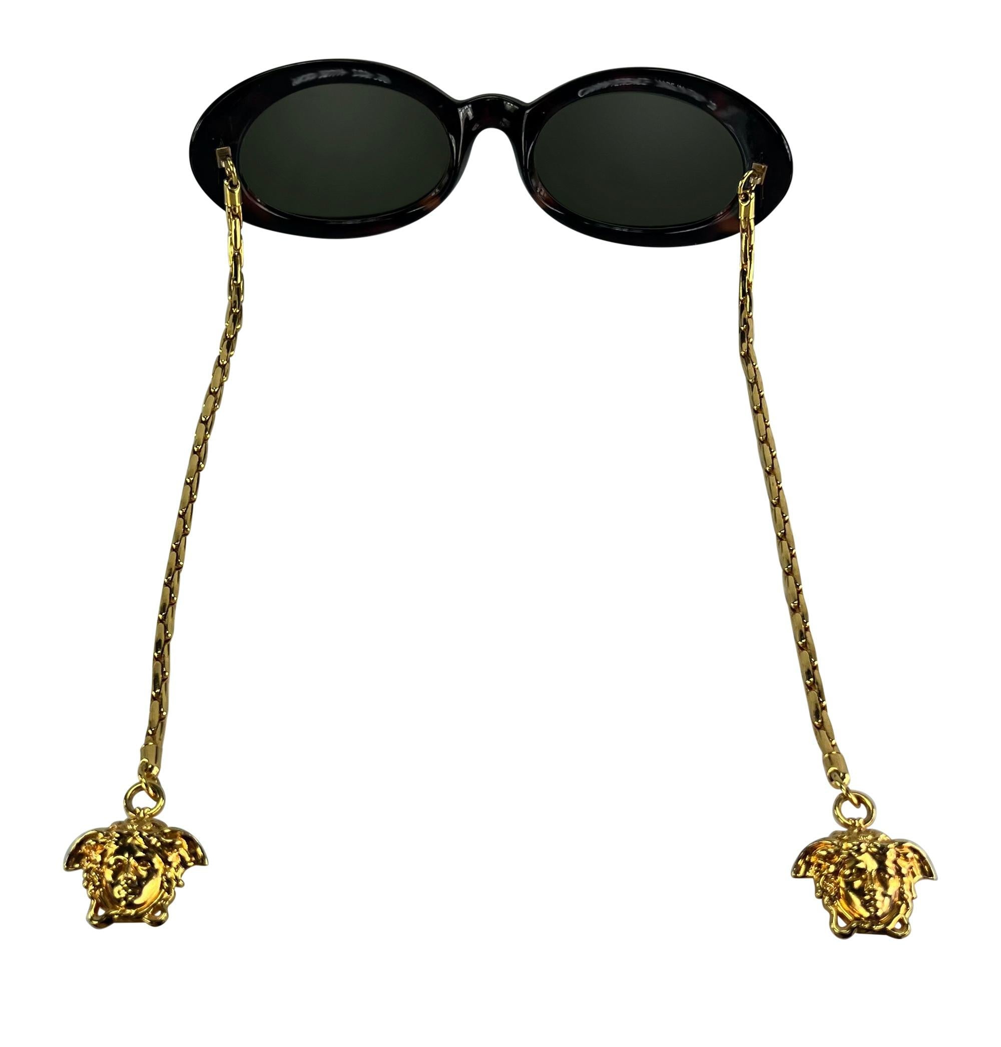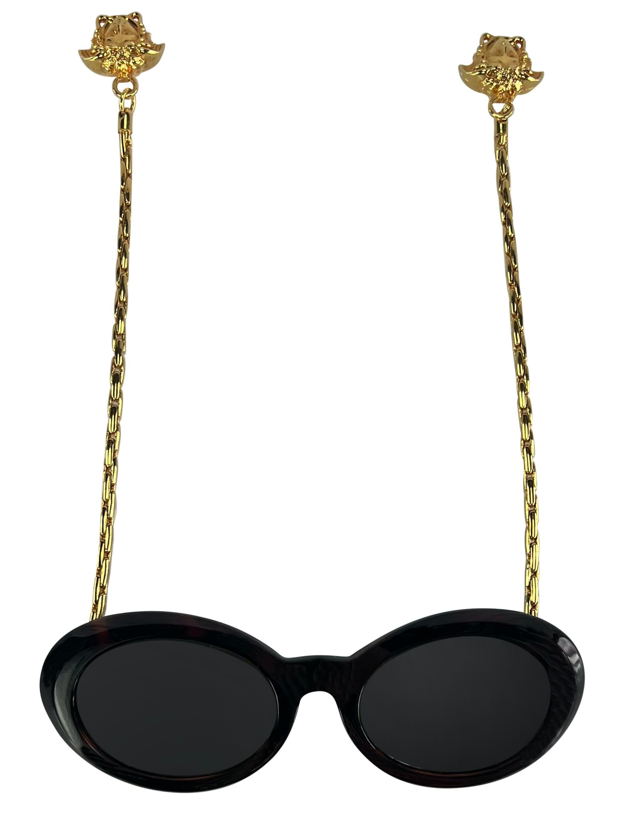 Presenting a fabulous pair of faux tortise steel round silver tone chain arm Gianni Versace sunglasses, designed by Gianni Versace. These ultra-rare sunglasses from 1996 are elevated with gold-tone link chains that function as arms. The sunglasses are secured with weighted Versace Medusa emblems at the end of each chain that perfectly fall below each ear. Add these incredibly terrific and rare sunnies to your collection!