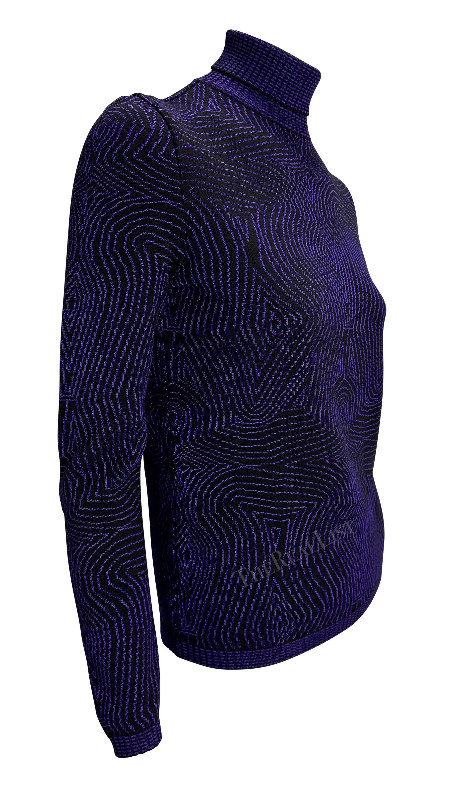 Presenting a chic purple and black Gianni Versace turtleneck sweater designed by Gianni Versace. From 1996, this fabulous knit sweater features an abstract linear pattern and is the perfect vintage Gianni Versace closet staple. Similar patterns debuted on the Spring/Summer 1996 Atelier Versace Haute Couture runway.