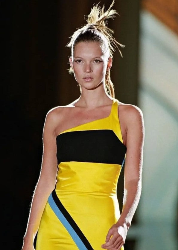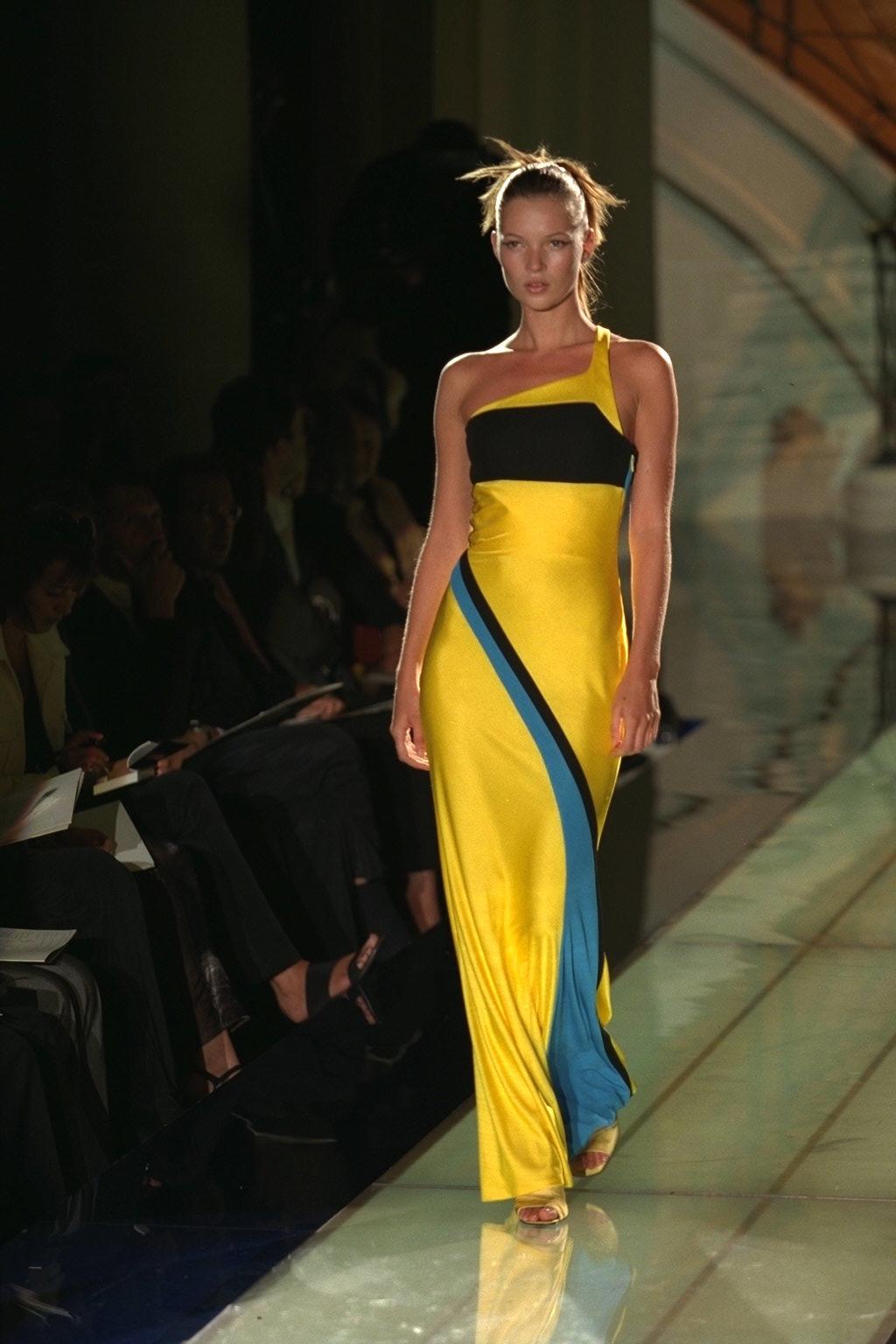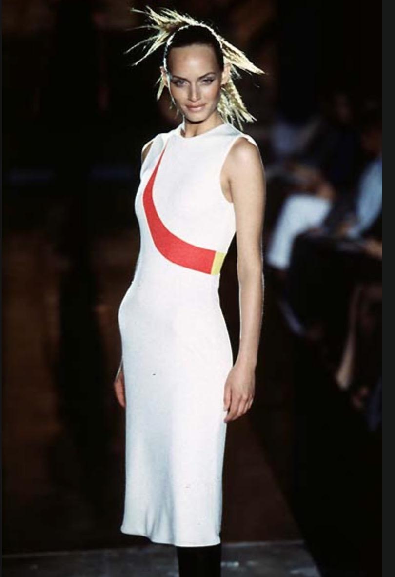 Presenting a beautiful Gianni Versace Couture knit dress designed by Gianni Versace. From 1997, this knit dress features a yellow detail at the front that connects to an identically shaped blue detail at the back. Chic and simple, this dress' classic silhouette allows it to be easily dressed up or down. Similar abstract color blocking debuted on the Atelier Versace Fall/Winter 1996 Haute Couture runway.