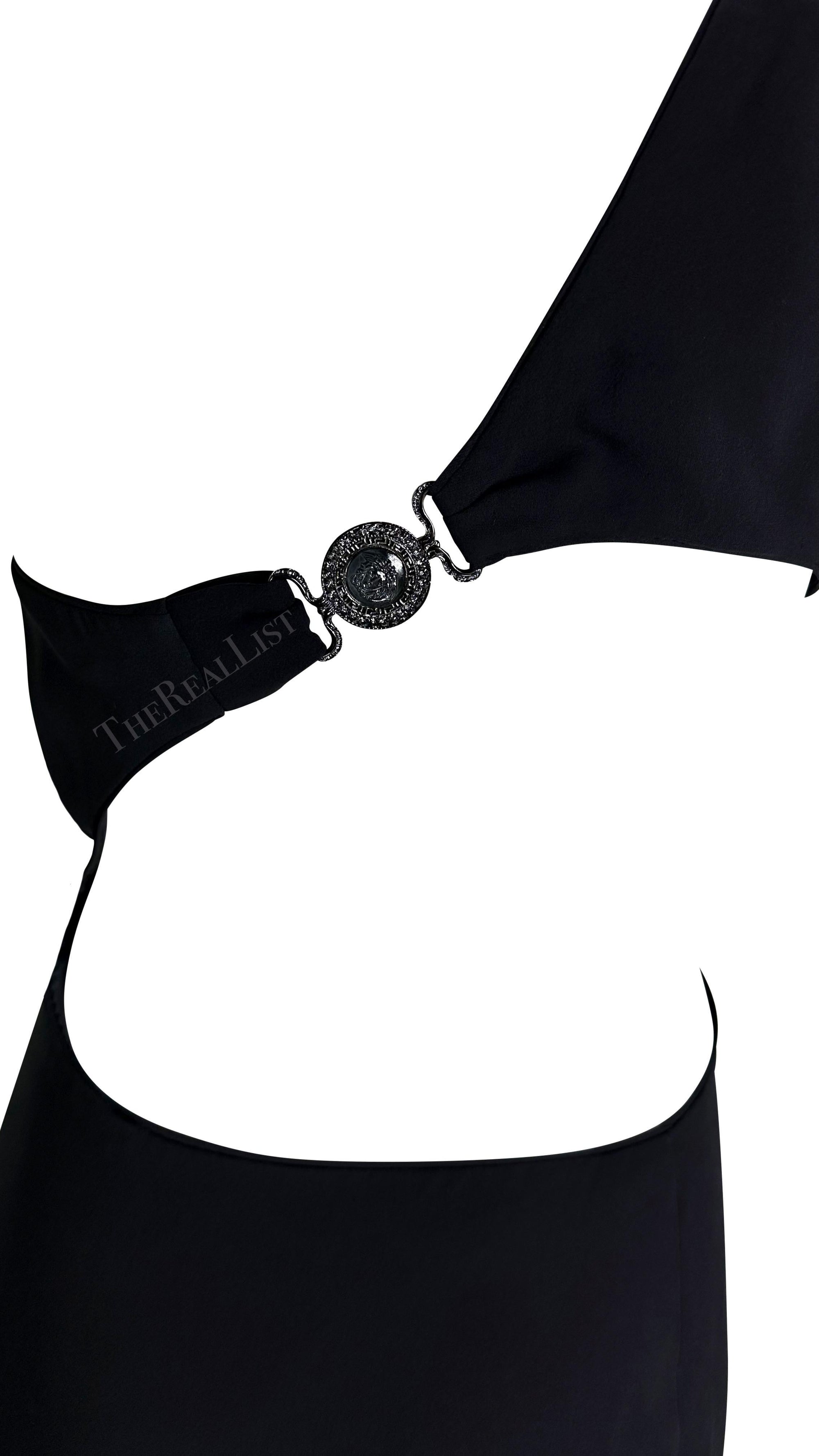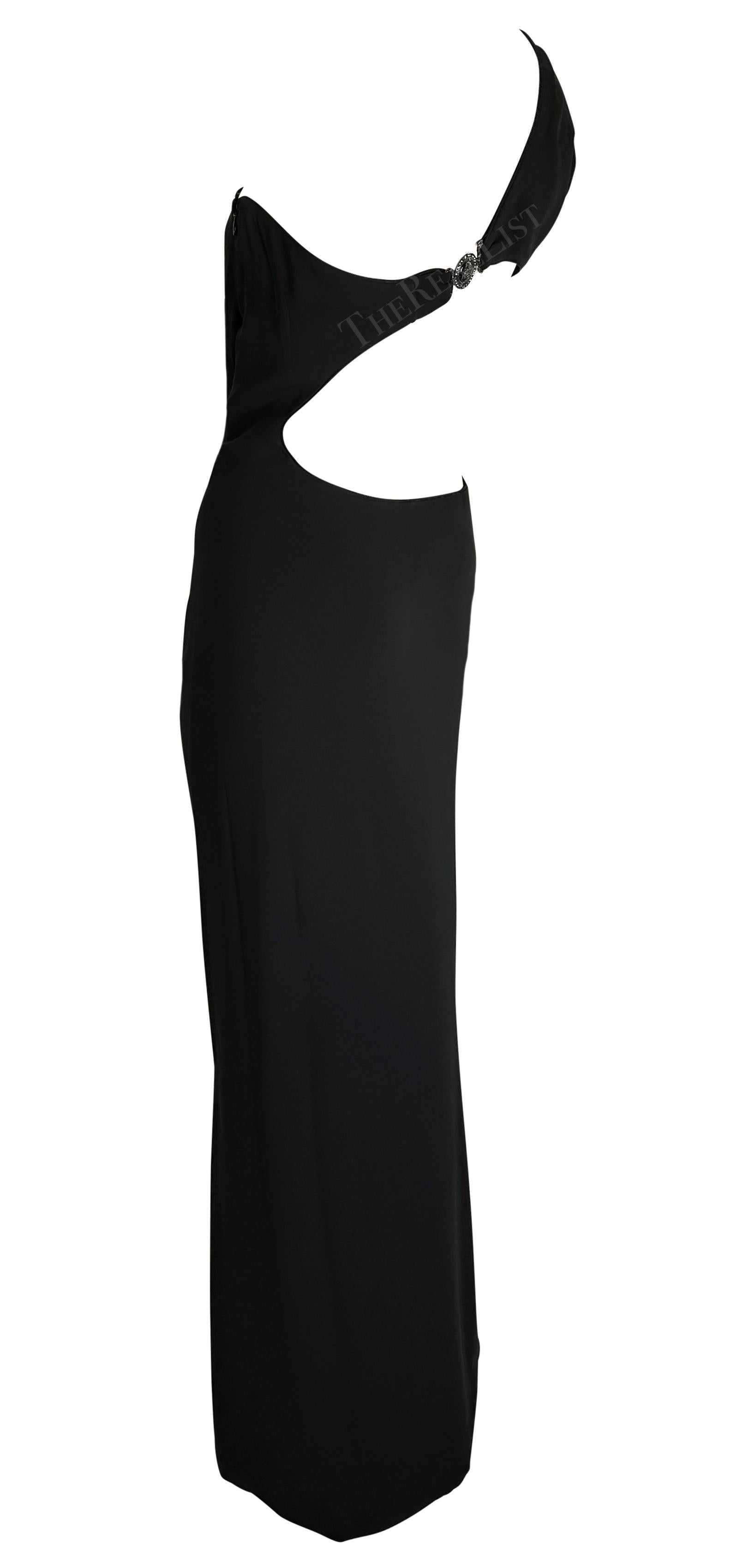 1998 Gianni Versace by Donatella Black Medusa Medallion Asymmetric Cutout Gown