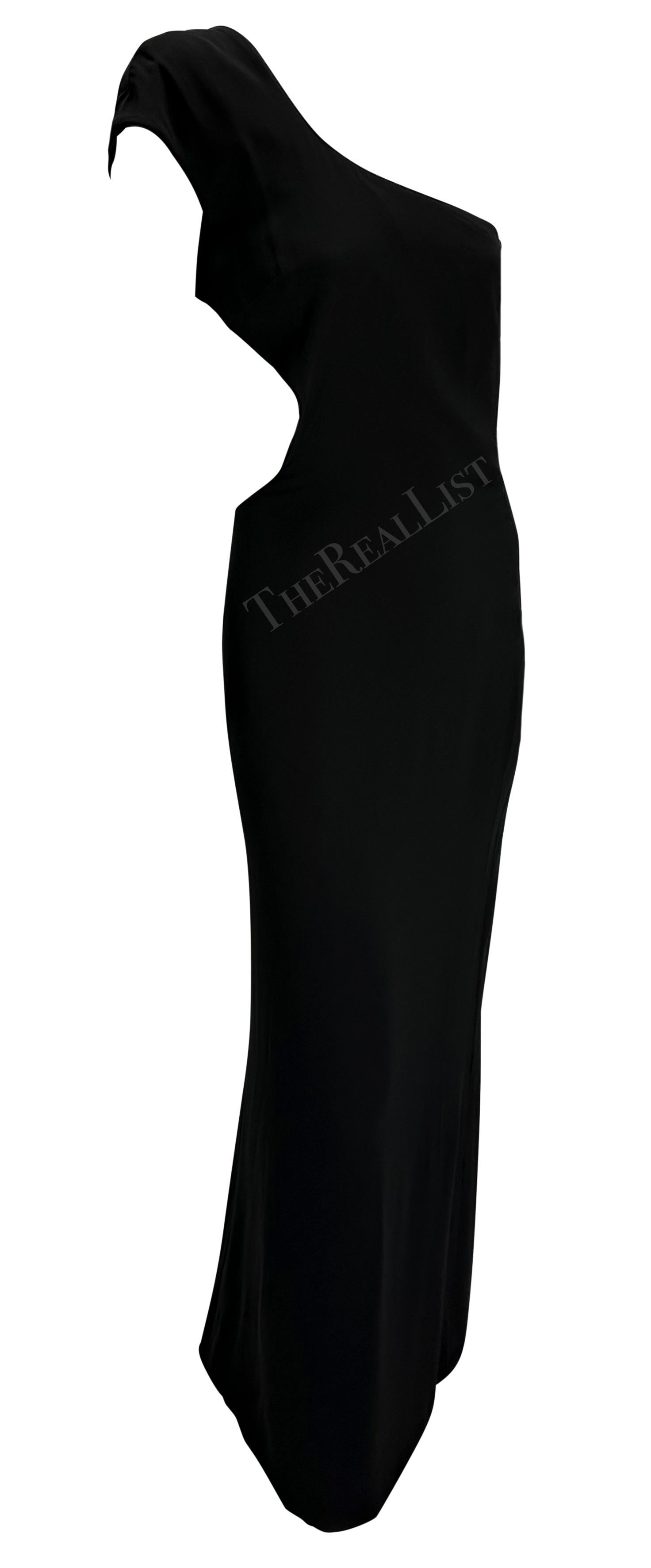 Presenting a gorgeous black Gianni Versace cutout gown designed by Donatella Versace. From 1998, this fabulous asymmetric single-shoulder gown features a single petal sleeve, mostly exposed back, and is made complete with a gunmetal rhinestone accented Versace Medusa relief at the back. A genuinely incredible gown, this sexy Gianni Versace dress by Donatella is a must-have addition to any wardrobe!