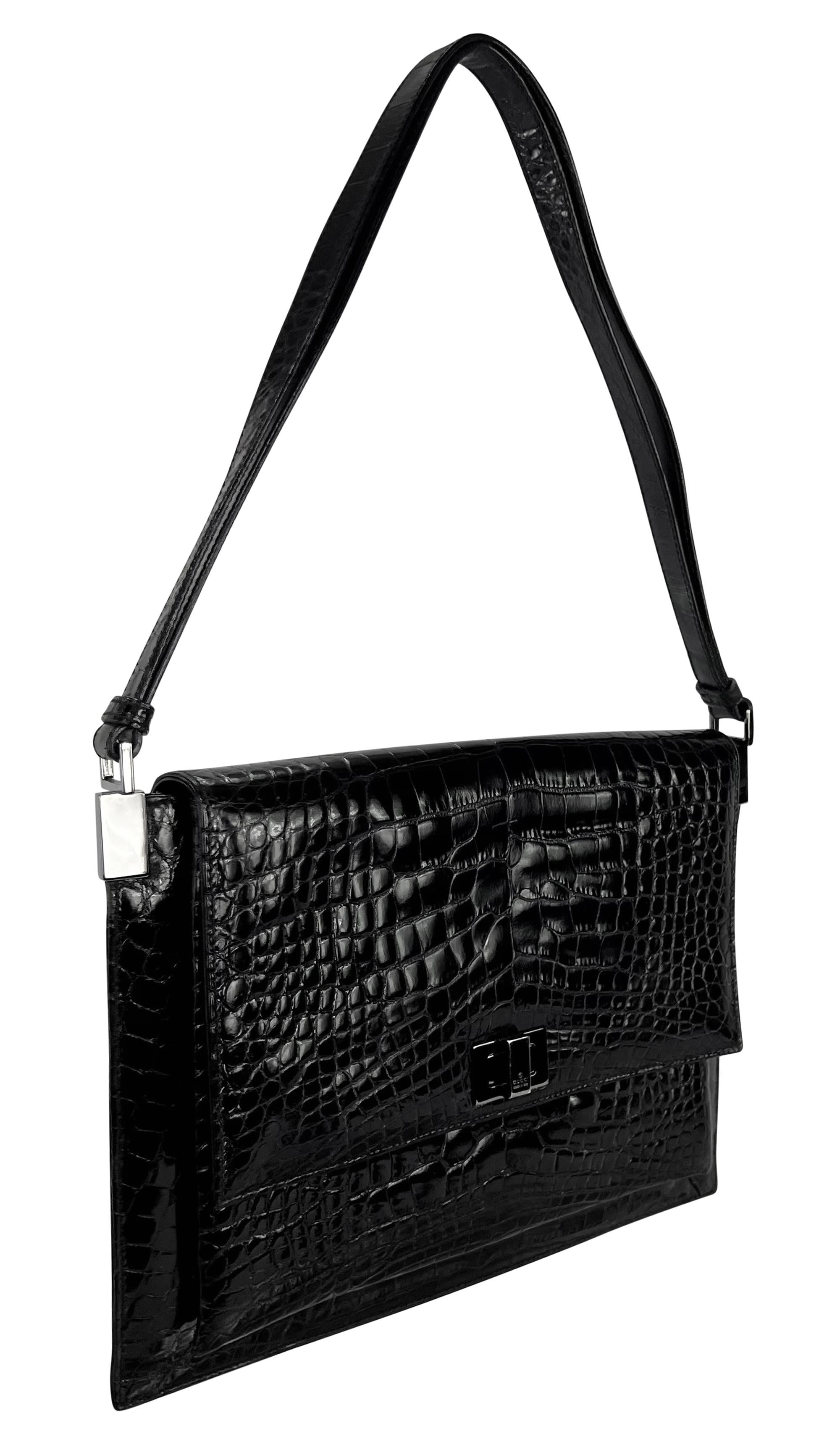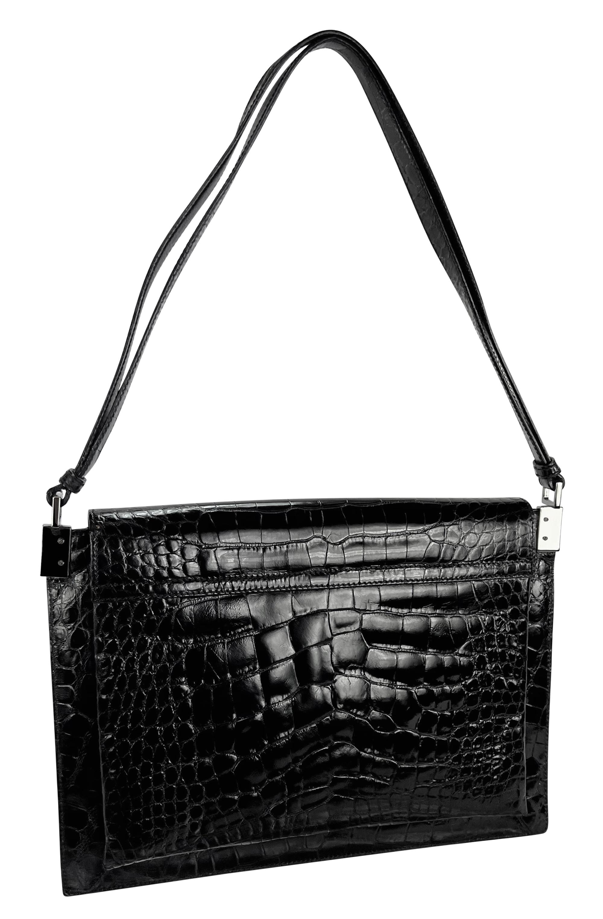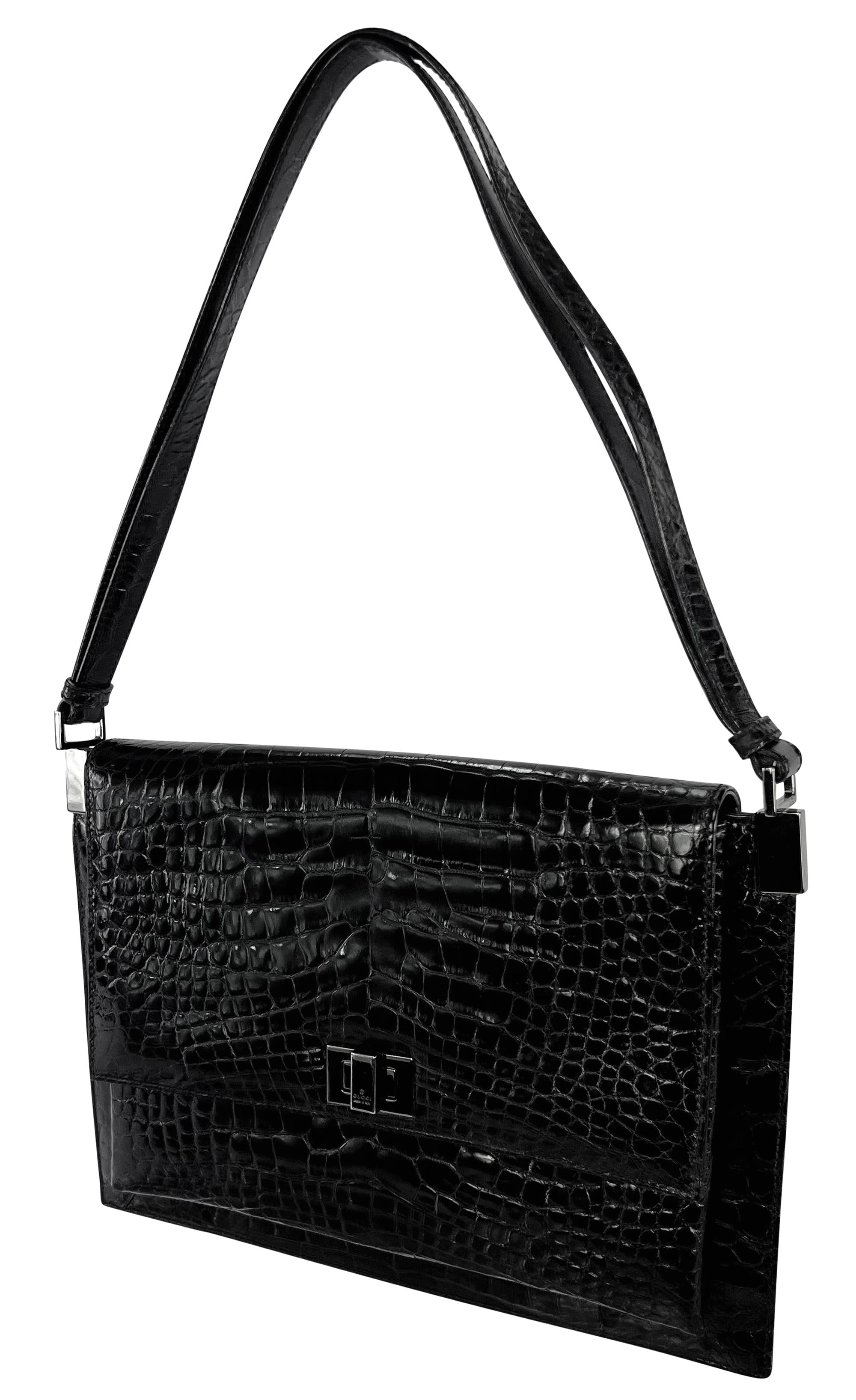 1998 Gucci by Tom Ford Genuine Alligator Skin Glossy Black Flat Shoulder Bag