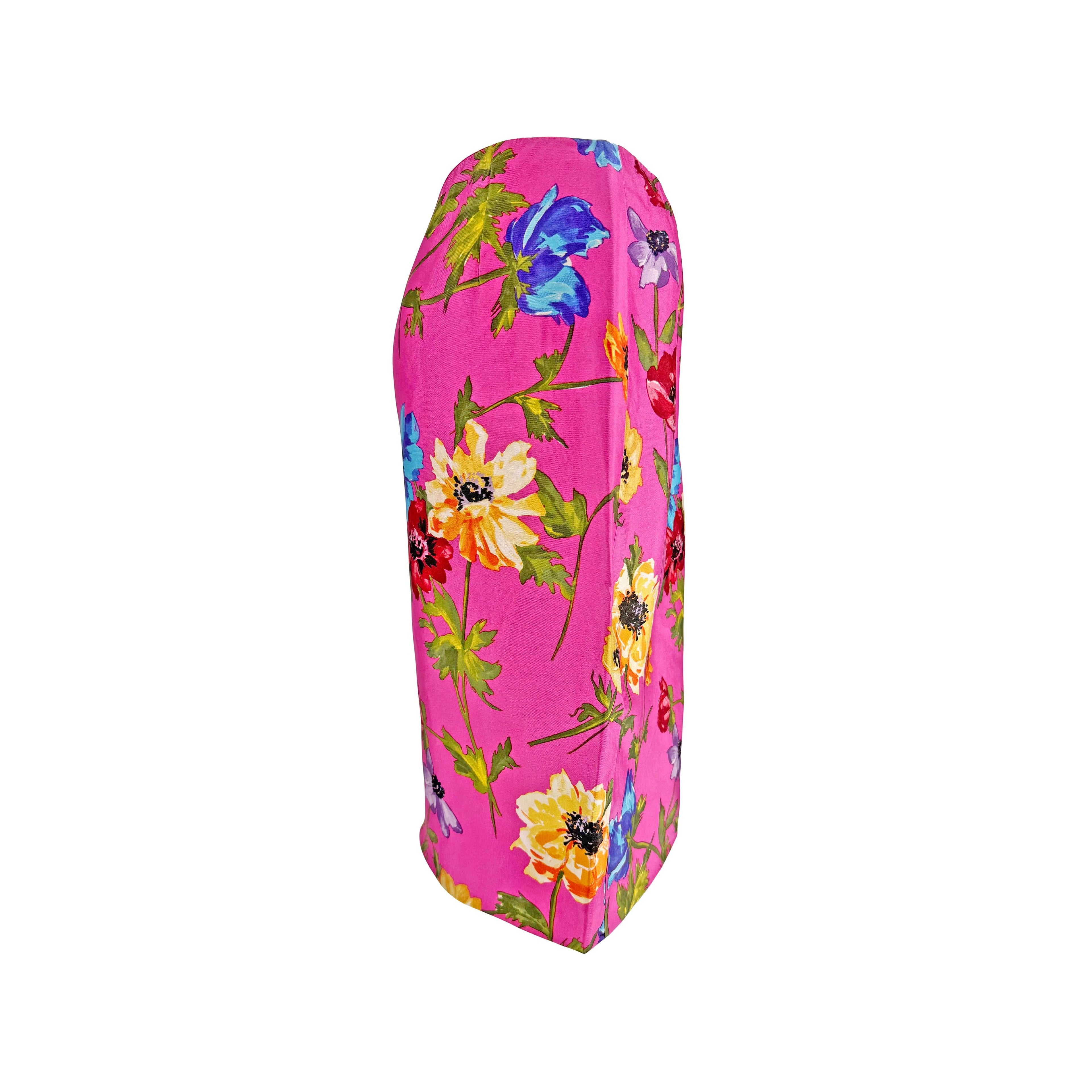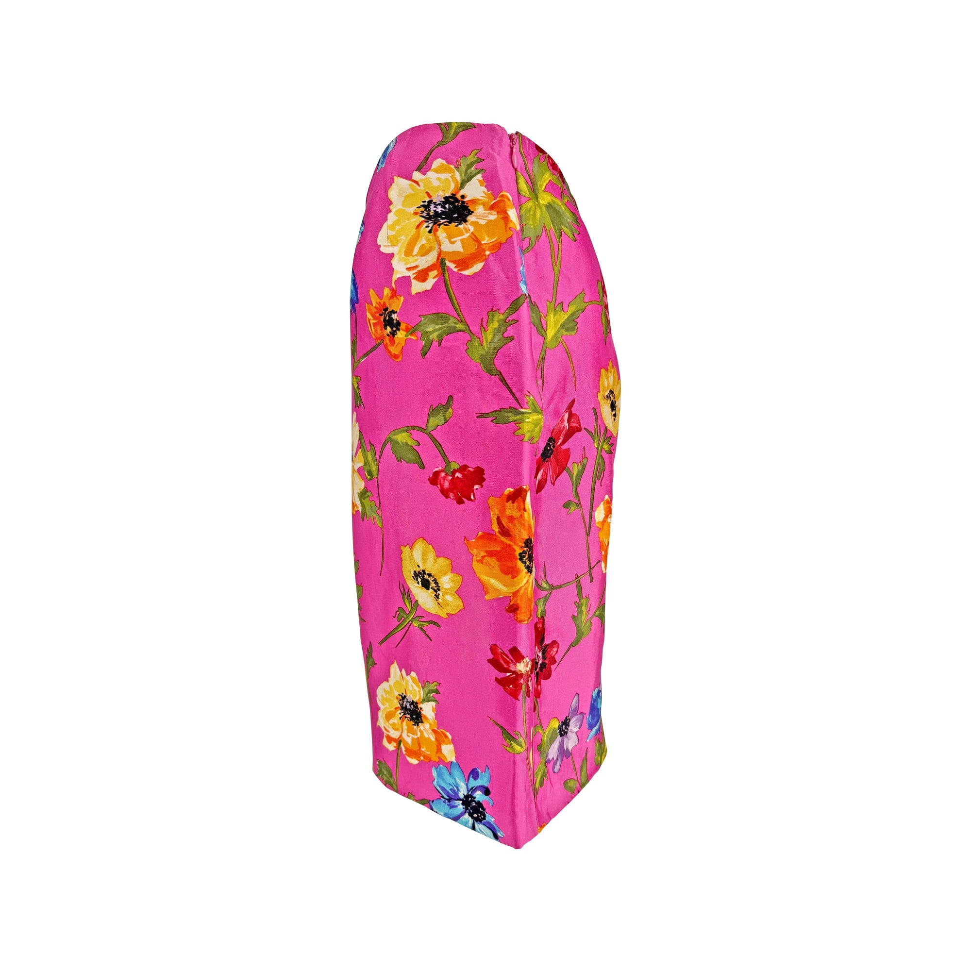 From Dolce & Gabbana's late 1990s collections, this silk satin pencil skirt features a vivid hot pink base adorned with a multicolor floral print of anemones in bold shades of red, yellow, blue, and purple.