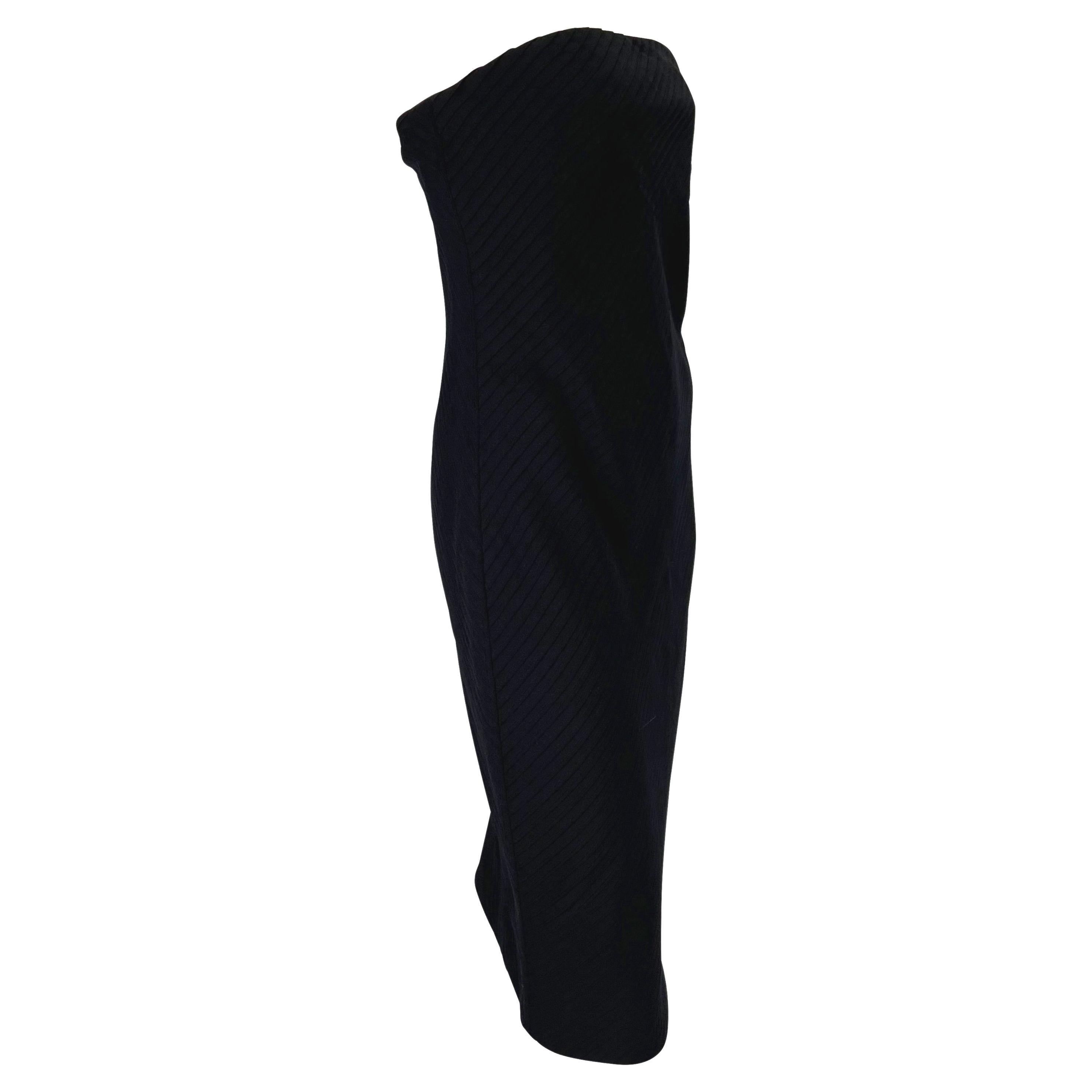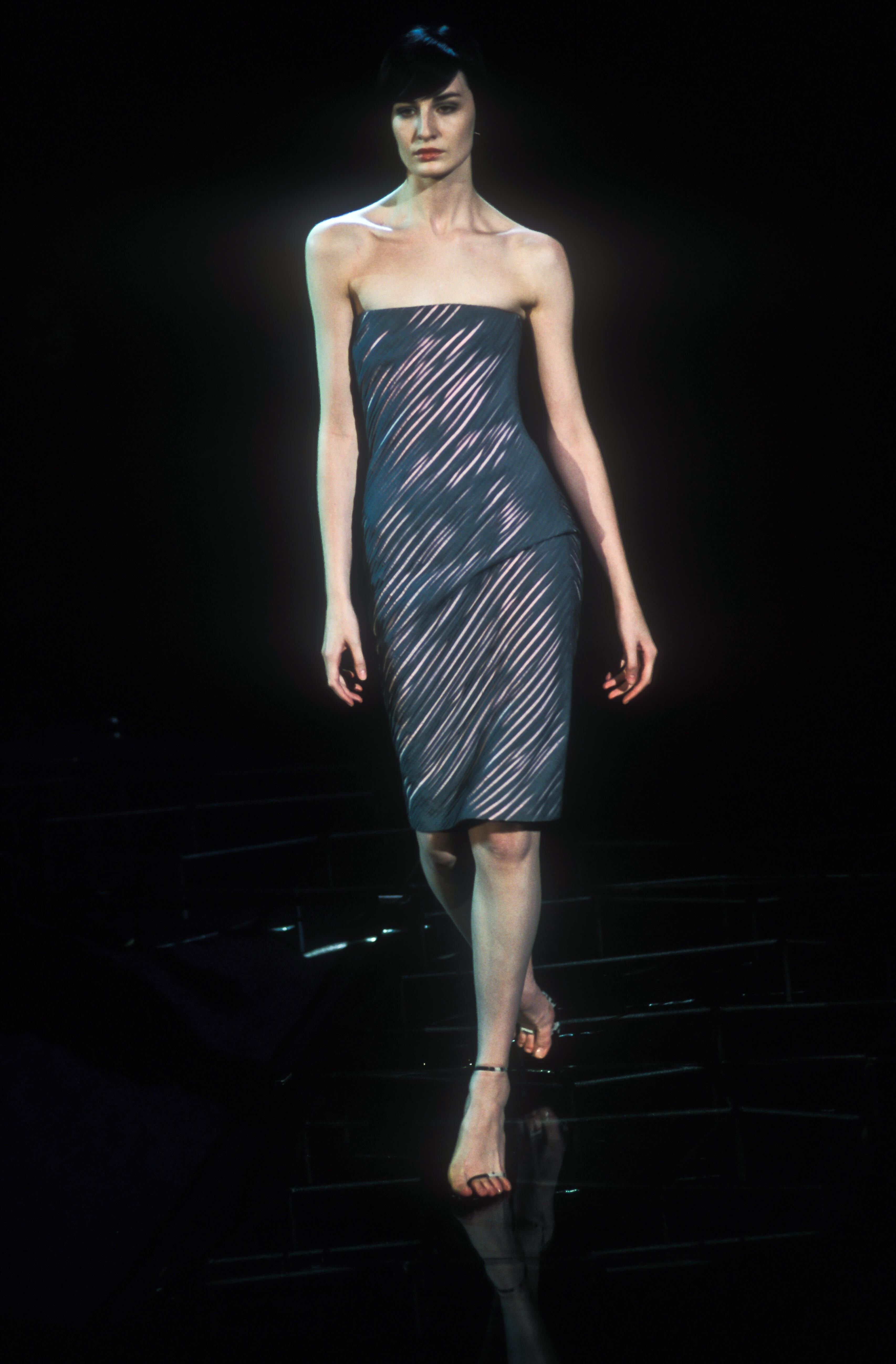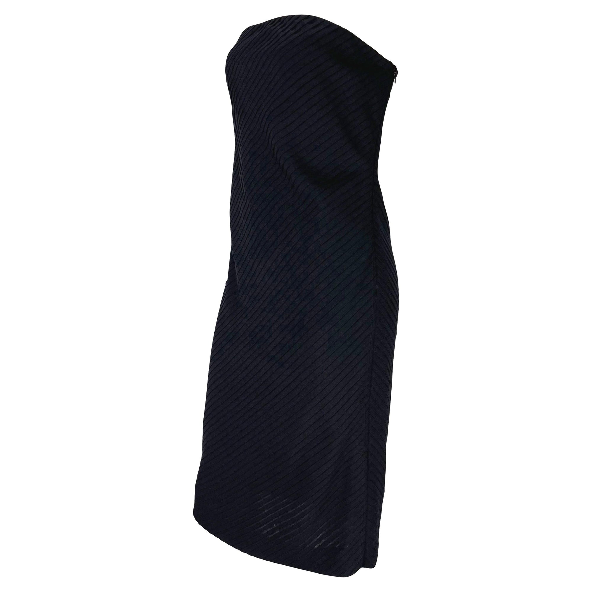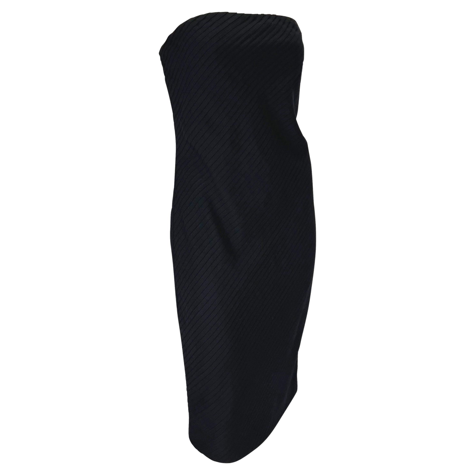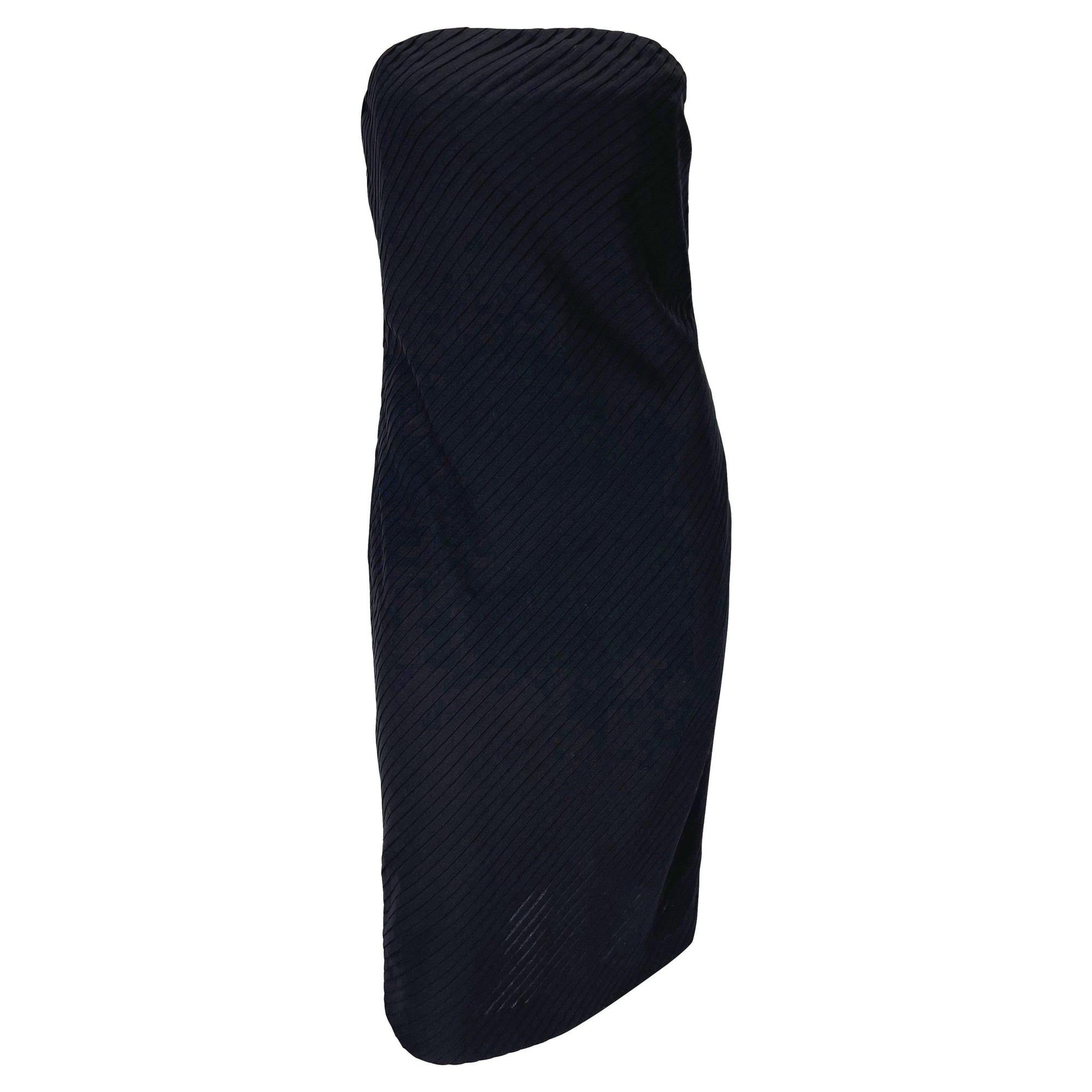 This strapless tube dress from Gianni Versace’s Spring/Summer 1999 collection, designed by Donatella Versace, is crafted in black with asymmetric ribbon pleats throughout. A two-tone pink variation debuted on the runway, modeled by Erin O’Connor. The design is finished with an internal corset at the bust, ensuring structure beneath the fluid surface detail.
