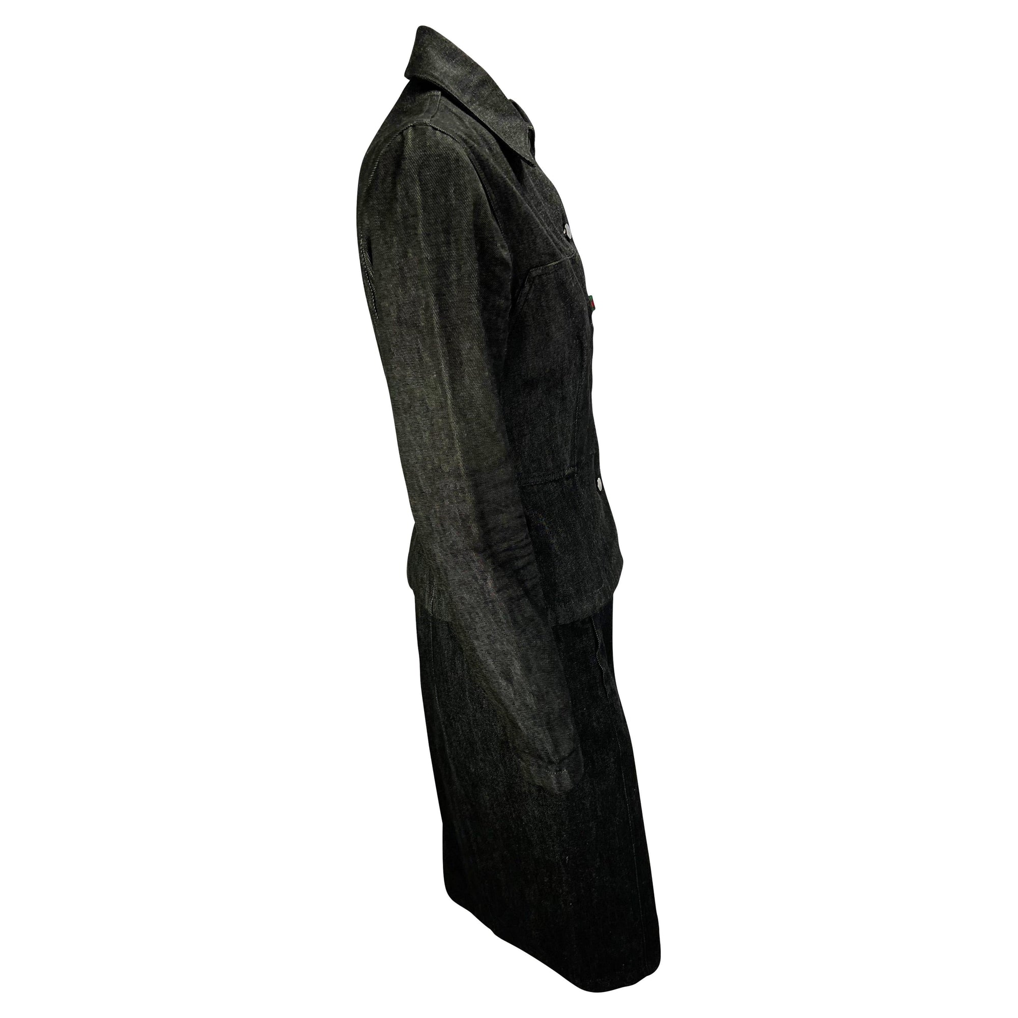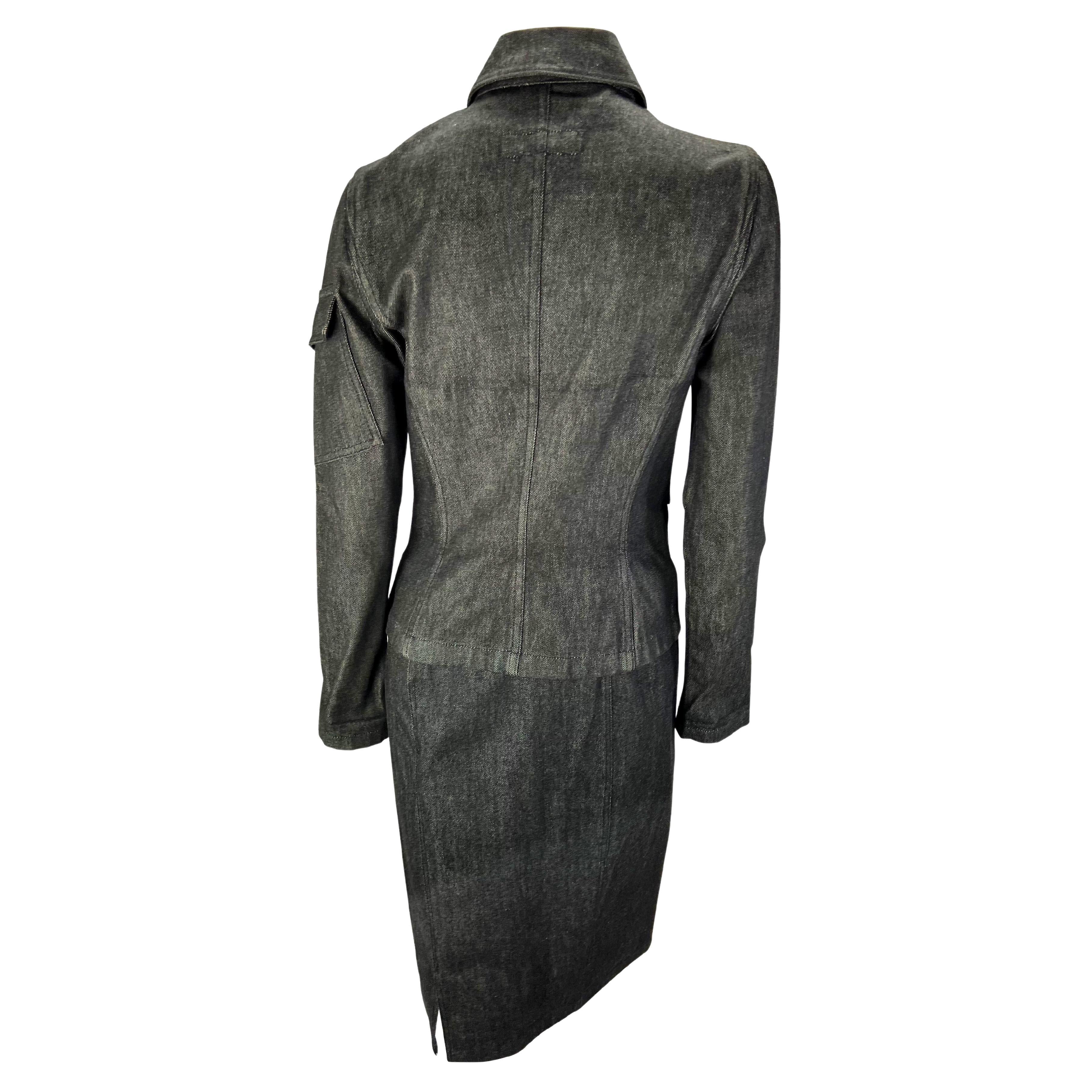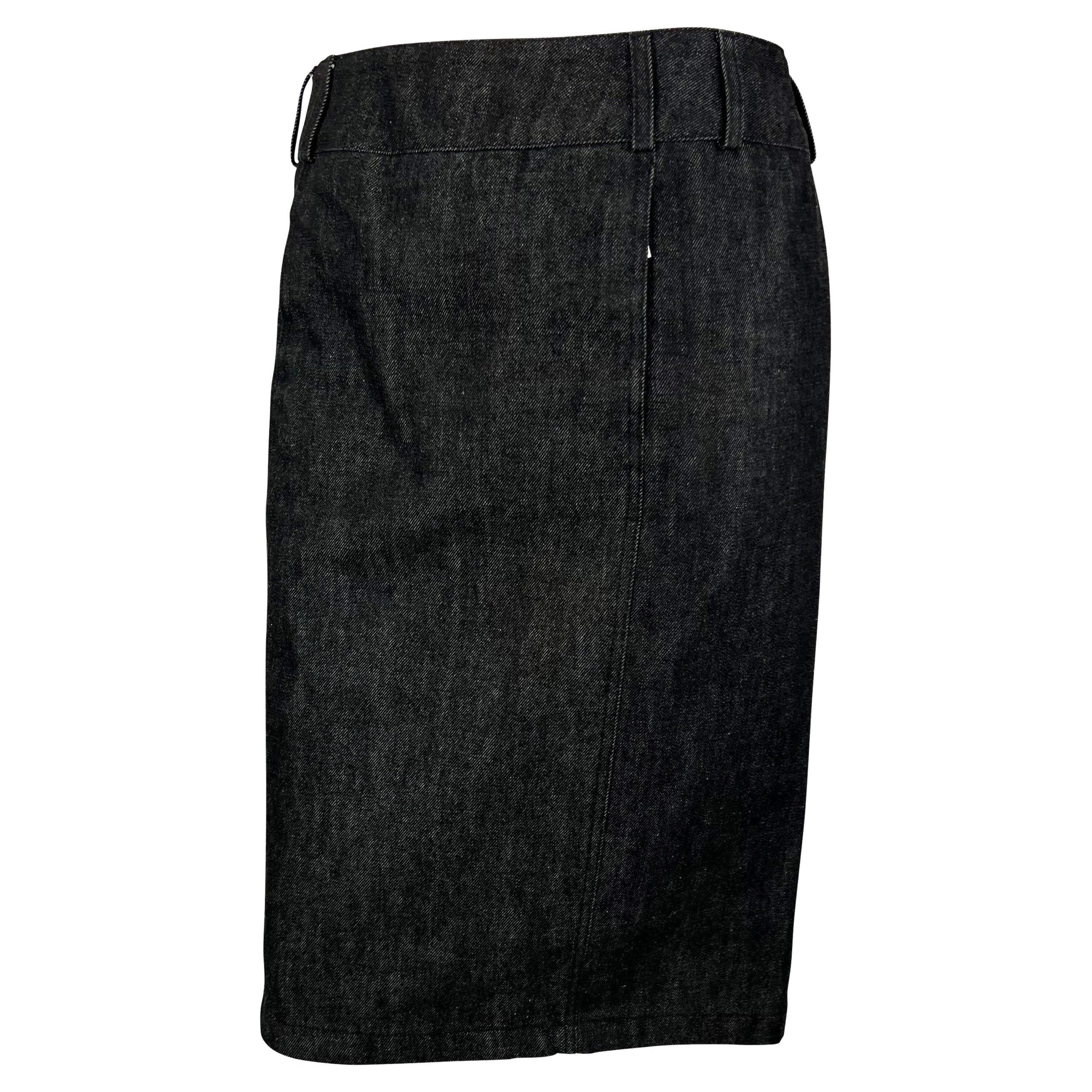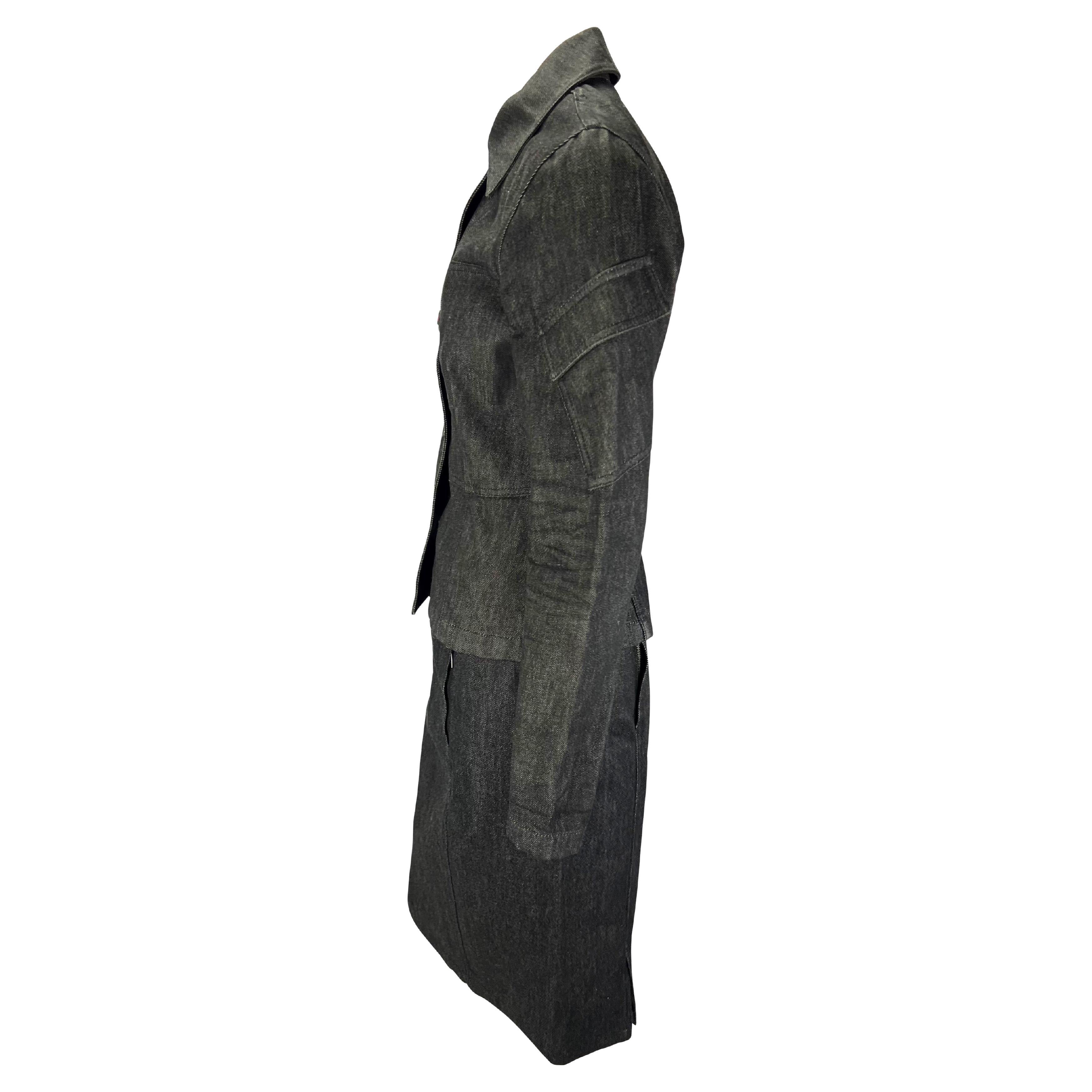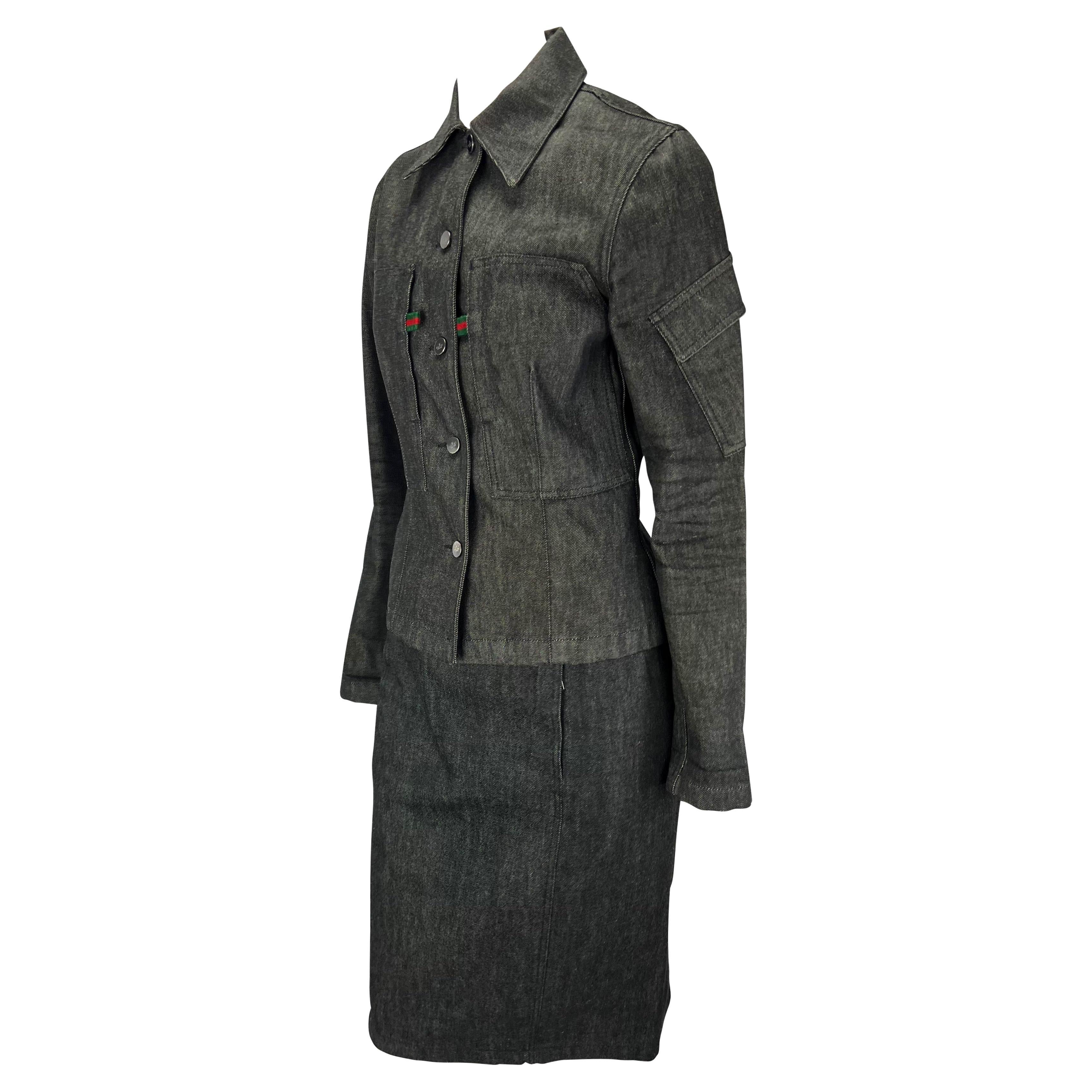 Presenting a fabulous Gucci black denim skirt set, designed by Tom Ford. From 1999, this two-piece set is made up of a denim jacket with a matching skirt. The skirt features front hidden pockets, slits at the back, and belt loops. The matching jean jacket features a collar, metal 'Gucci' stamped button closures at the front closure, breast pockets with web accents, and pockets at the arms.