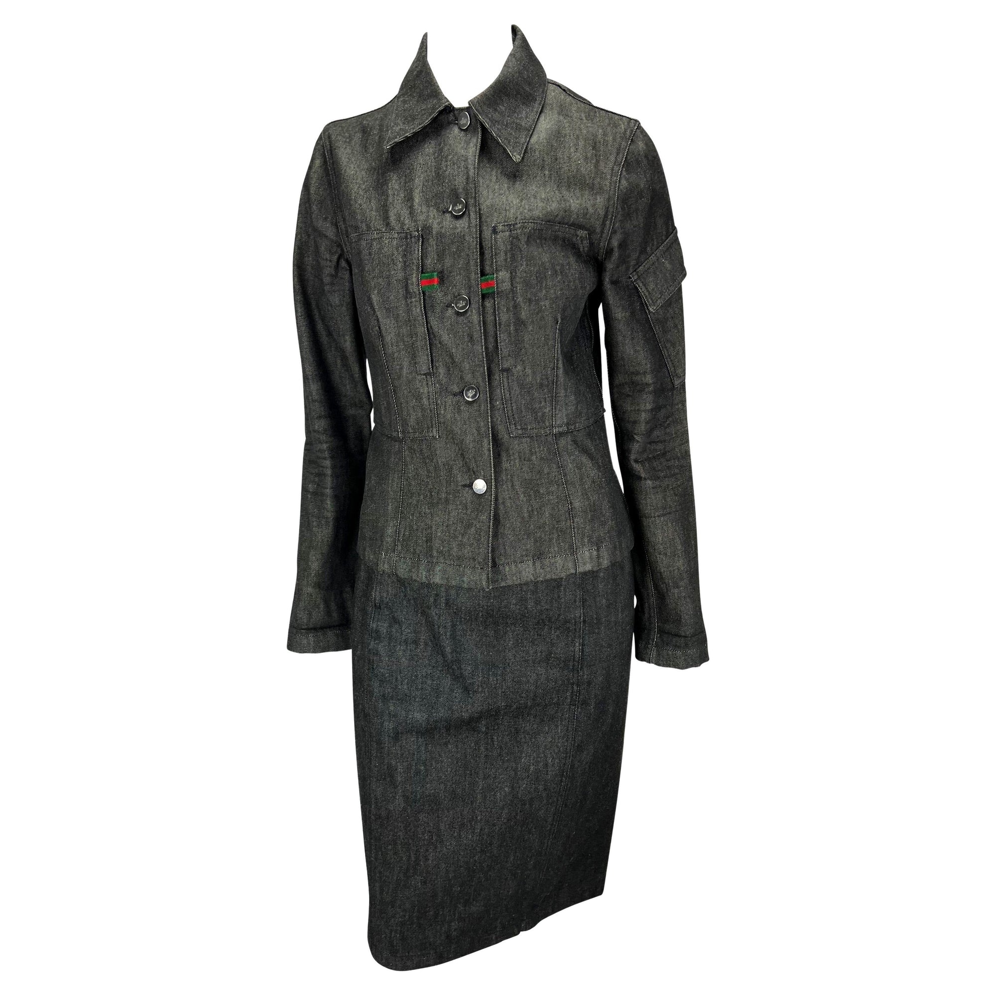 1999 Gucci by Tom Ford Black Denim Web Trim Jacket Skirt Set