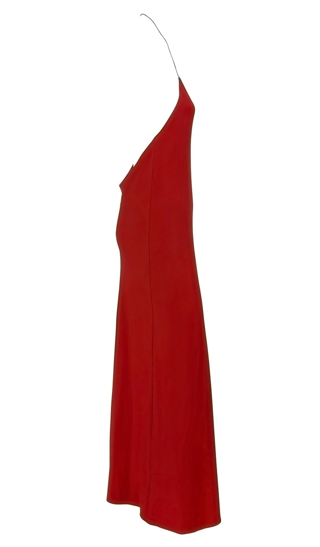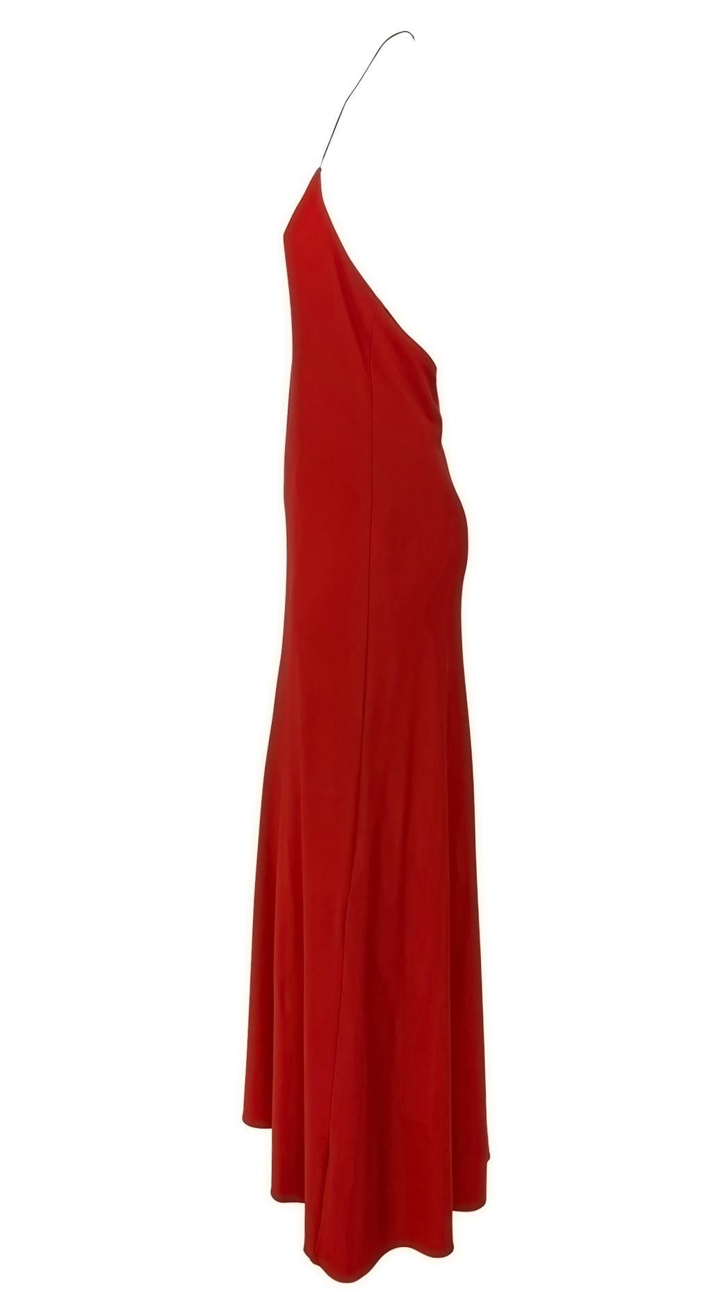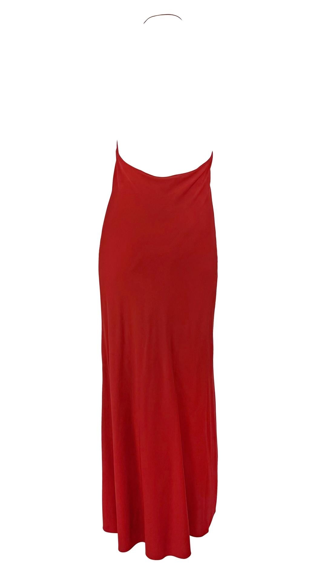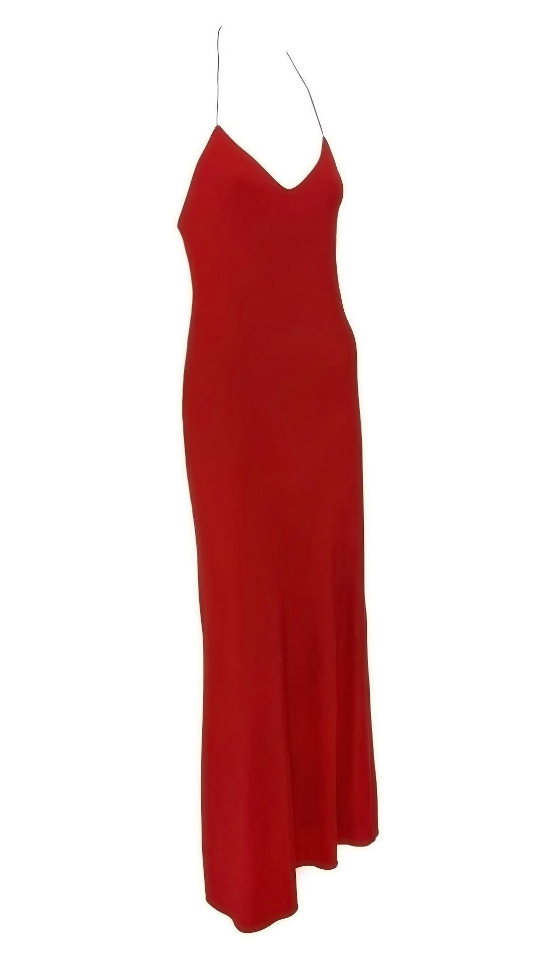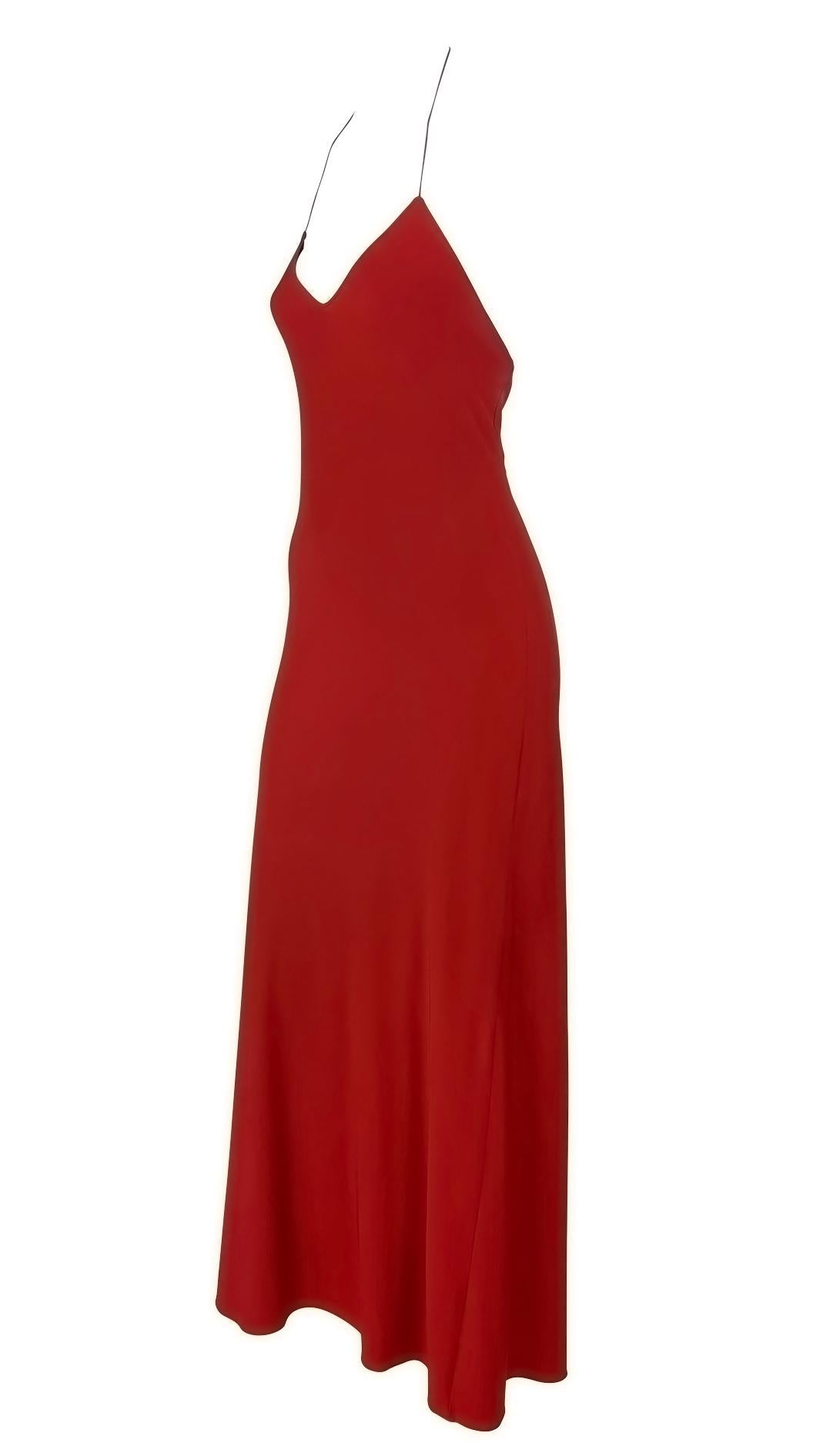 From 2000, this red Calvin Klein halter neck gown embodies the brand's minimalist sensuality. Crafted in Italy from stretch viscose, the bodycon silhouette features a plunging neckline and an open back, falling to a sleek maxi-length hem. A timeless slip dress with effortless allure. An identical gown was worn by Penelope Cruz to the 2000 Palm Springs International Film Festival with Pedro Almodovar for their film "All About My Mother". This sleek look is now considered one of Cruz's most iconic.