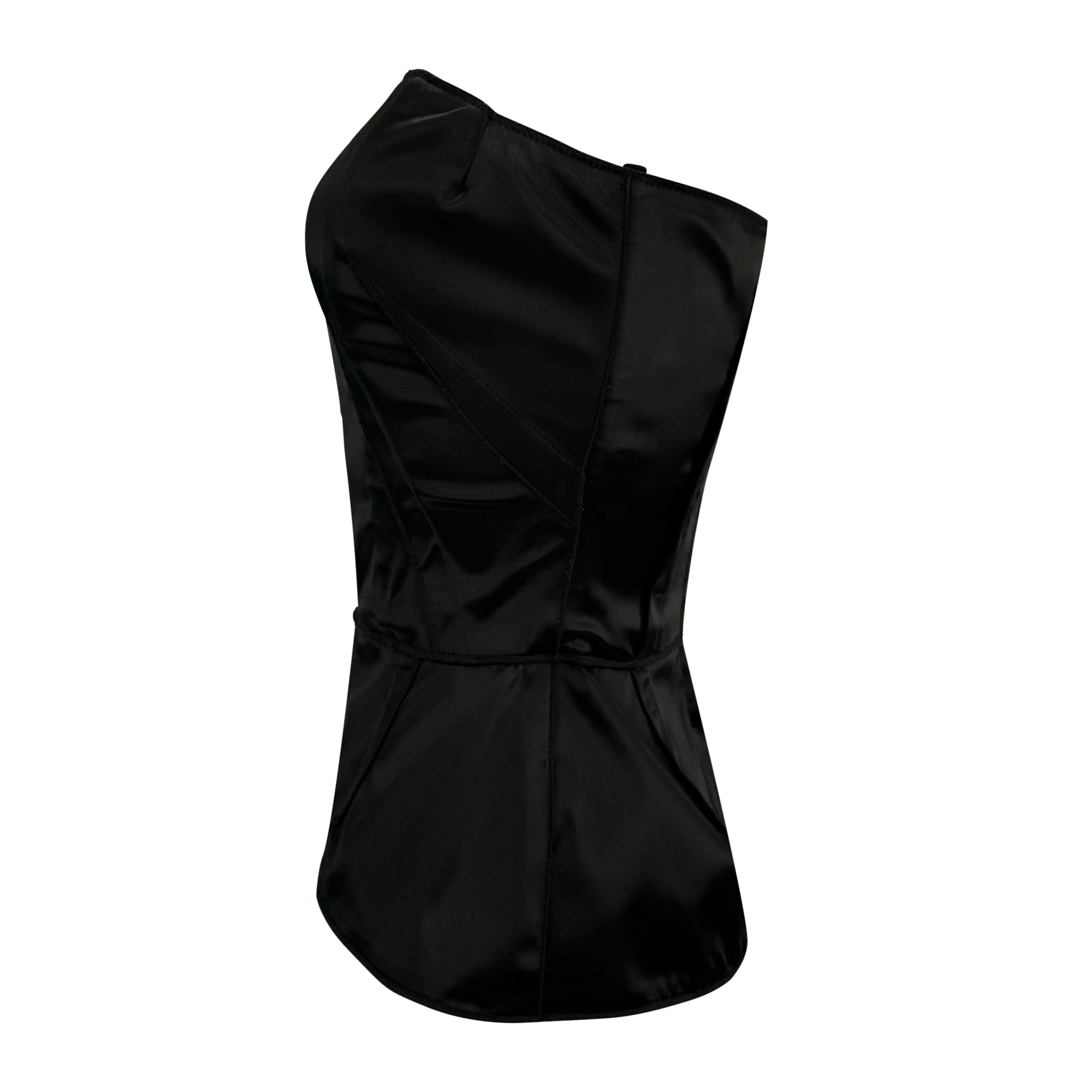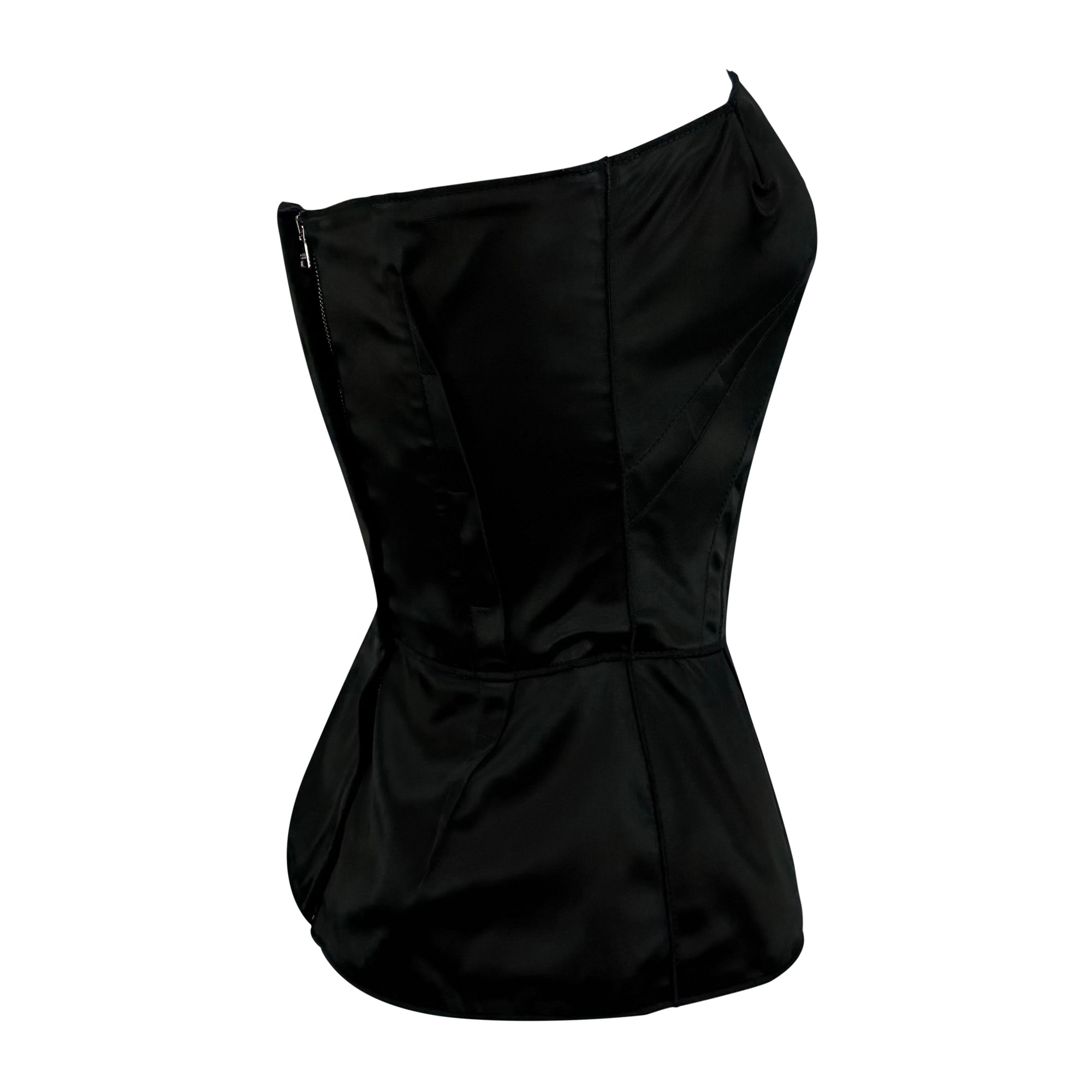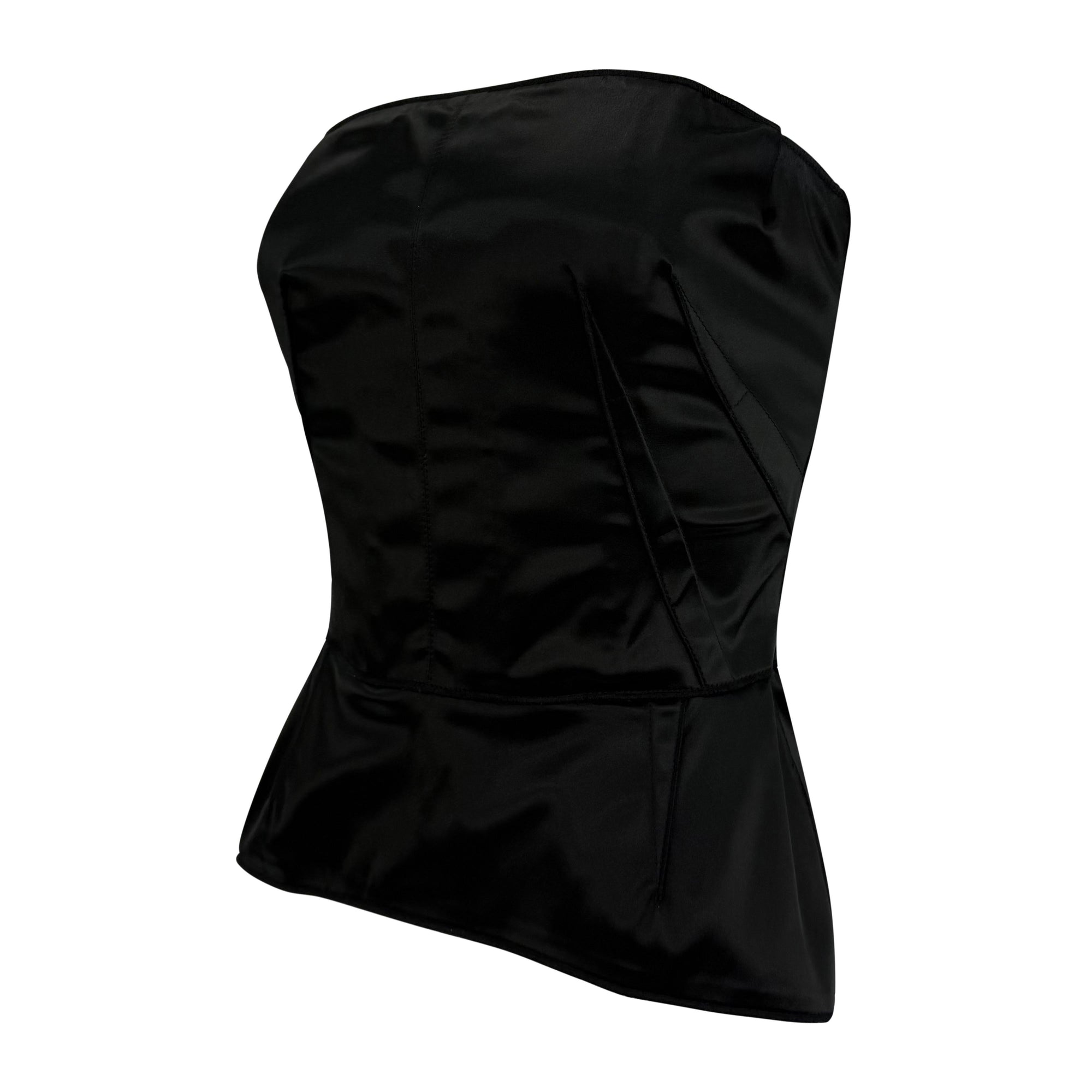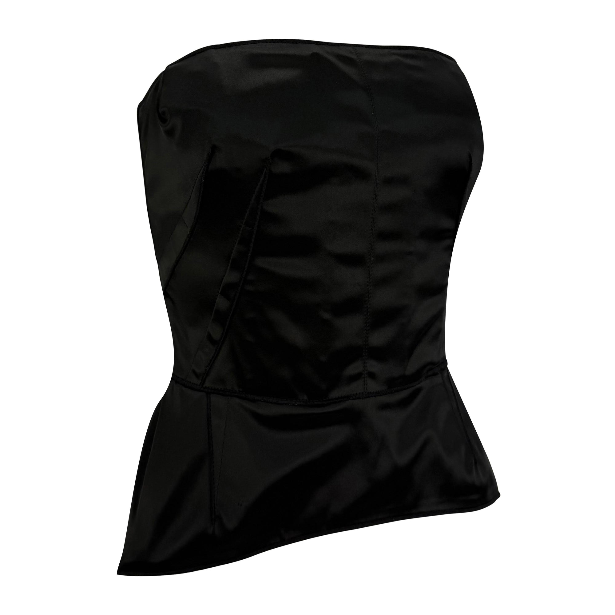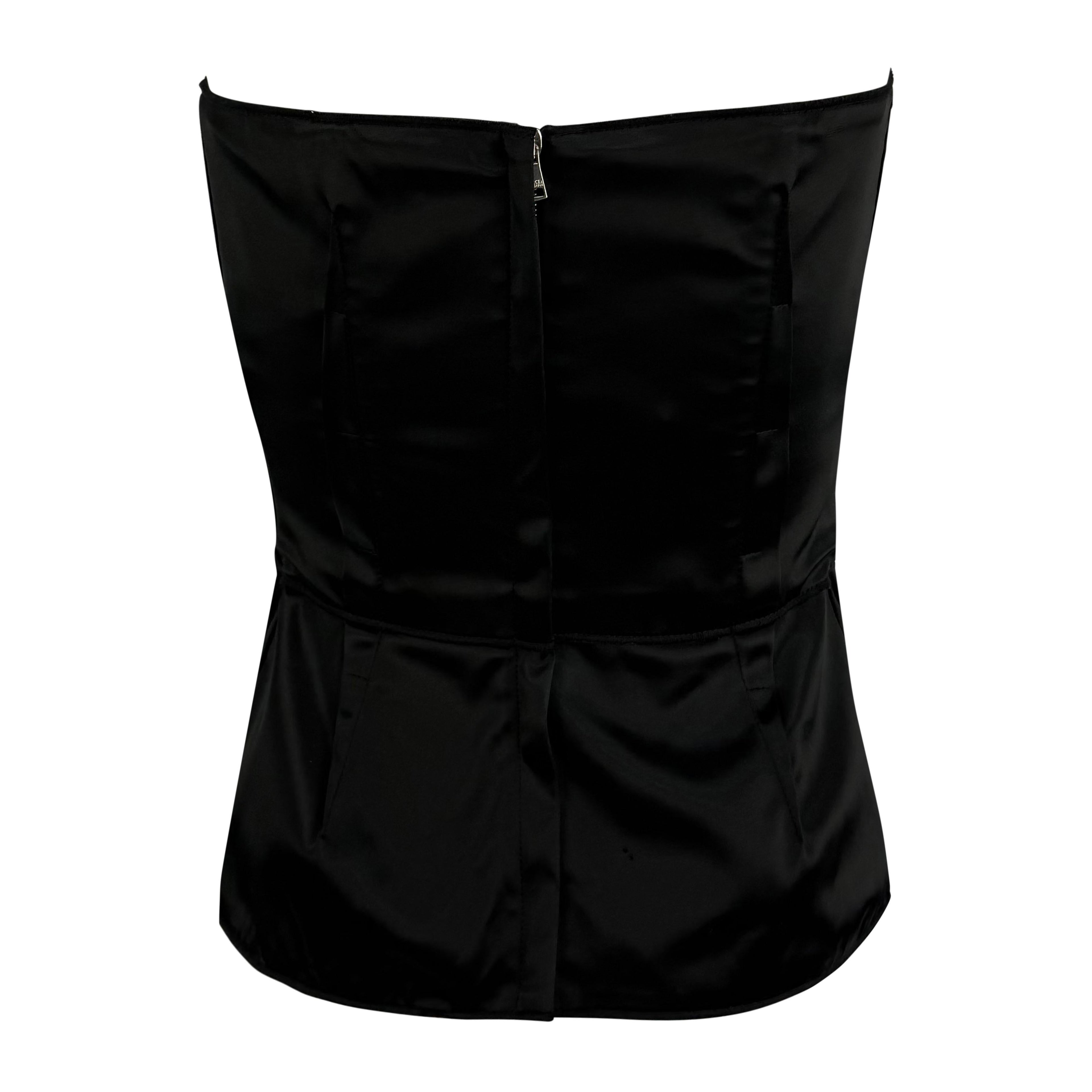 From the 2000s, this Dolce & Gabbana black satin strapless bustier top features internal boning for a sculpted silhouette. The design is finished with subtle peplum shaping at the hem and a concealed back zipper.