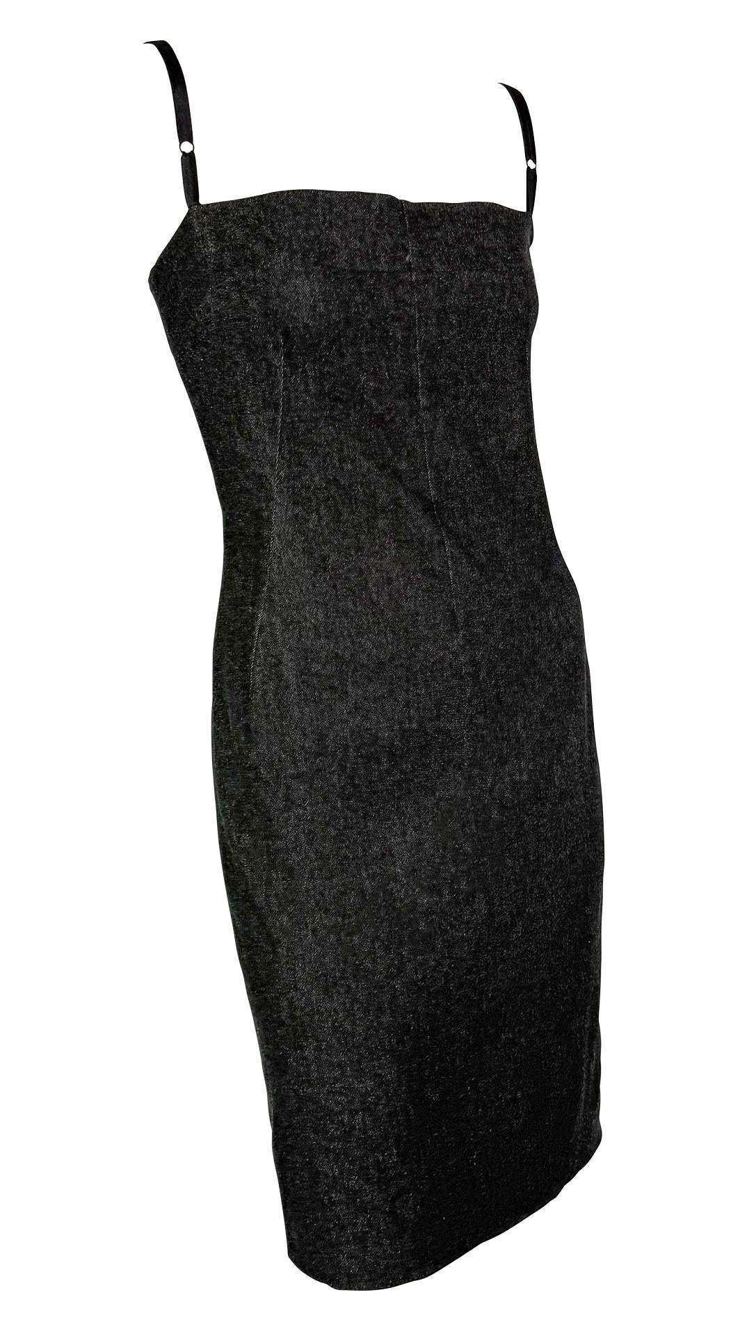 This 2000s Dolce & Gabbana dark wash denim tube dress features a bodycon silhouette with adjustable shoulder straps and a built-in bralette-style bustier.
