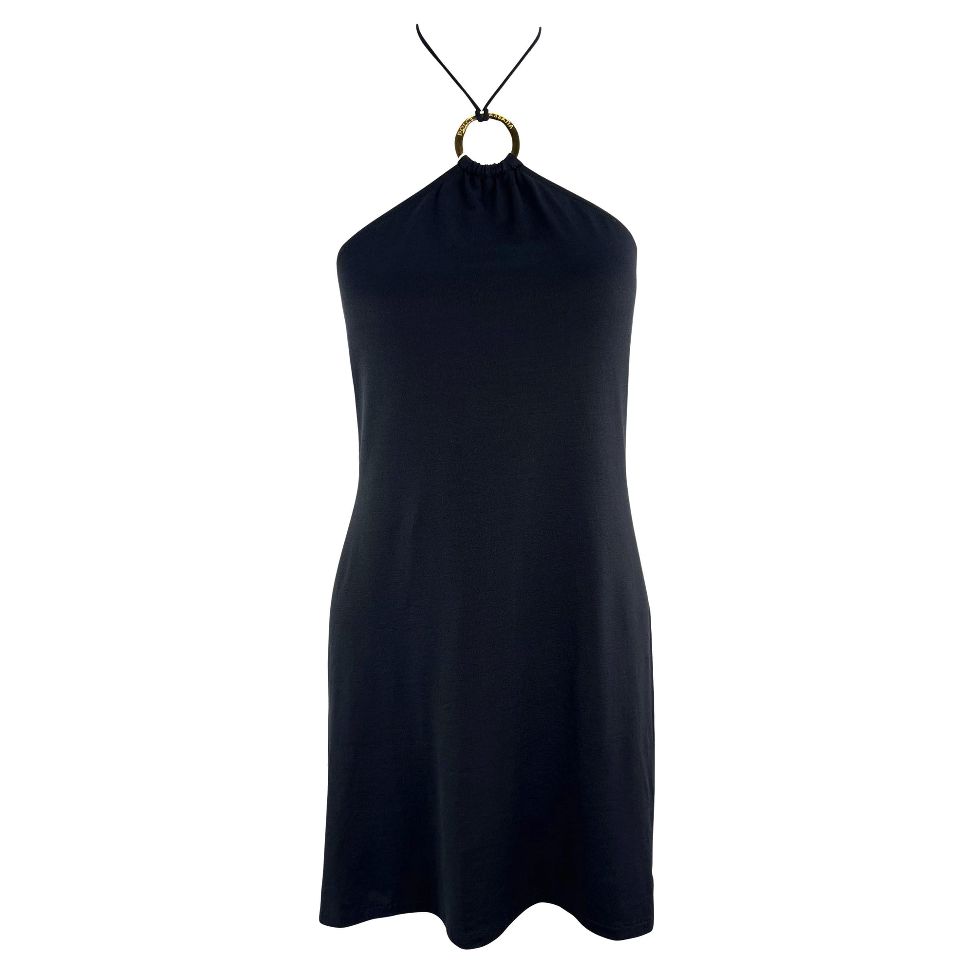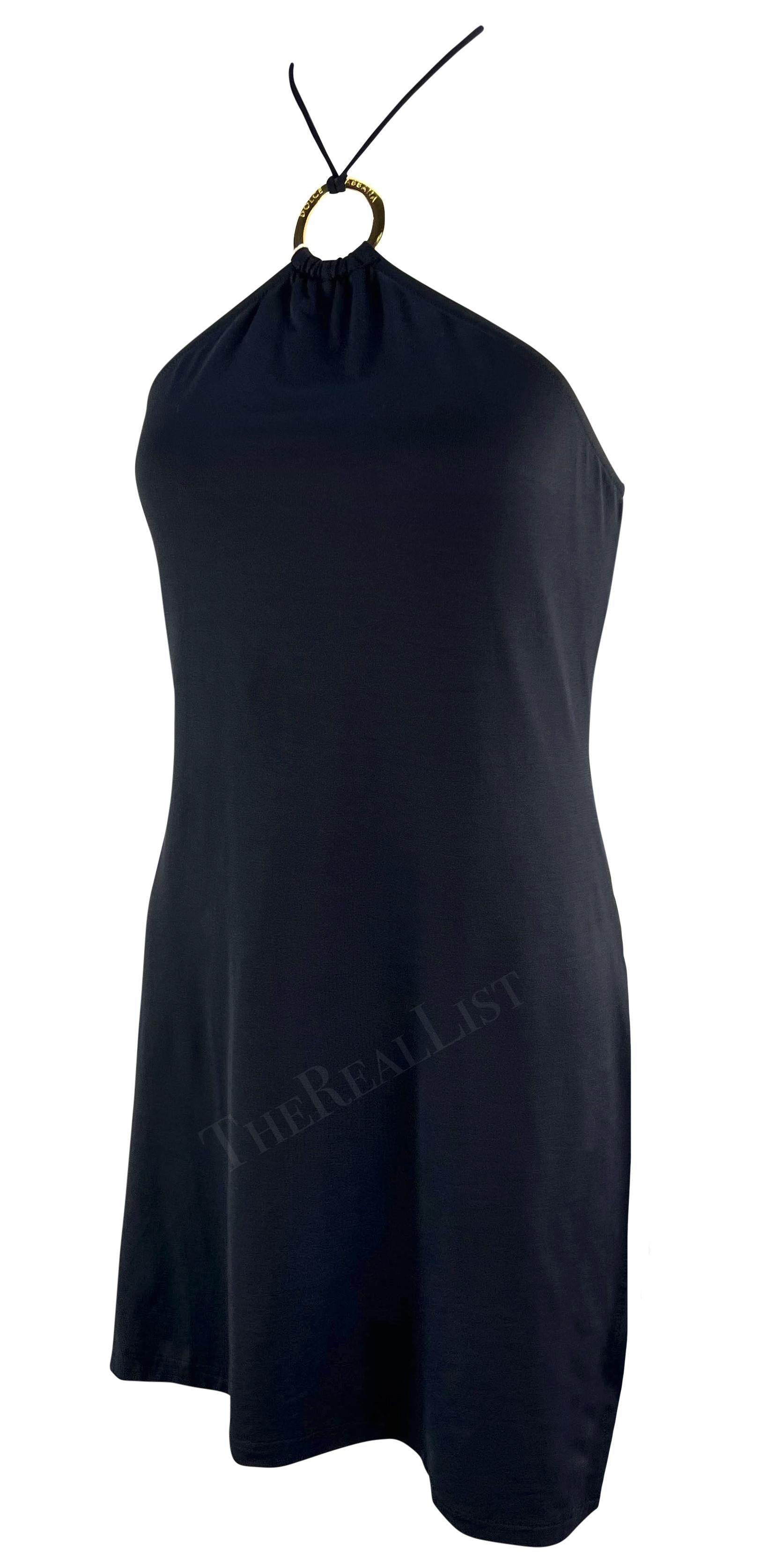 From the early 2000s, this fabulous black stretch Dolce & Gabbana halterneck mini dress prominently features a gold-tone metal ring above the bust. This branded metal accent connects to the halterneck tie. This knock out Dolce & Gabbana Mare dress is complete with slits on either side.