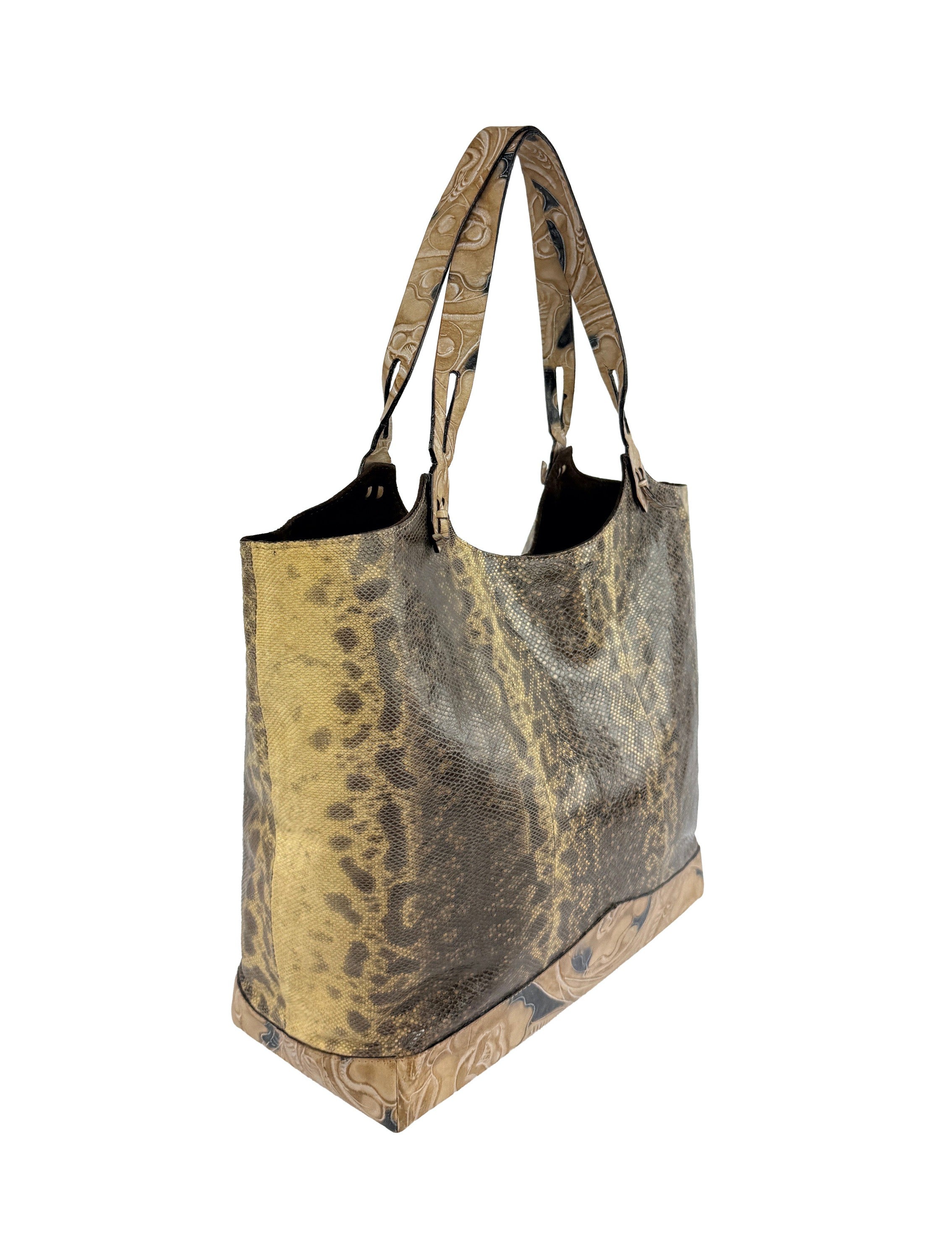2000s Emanuel Ungaro Genuine Snakeskin Tan Carved Floral Leather Shoulder Bag