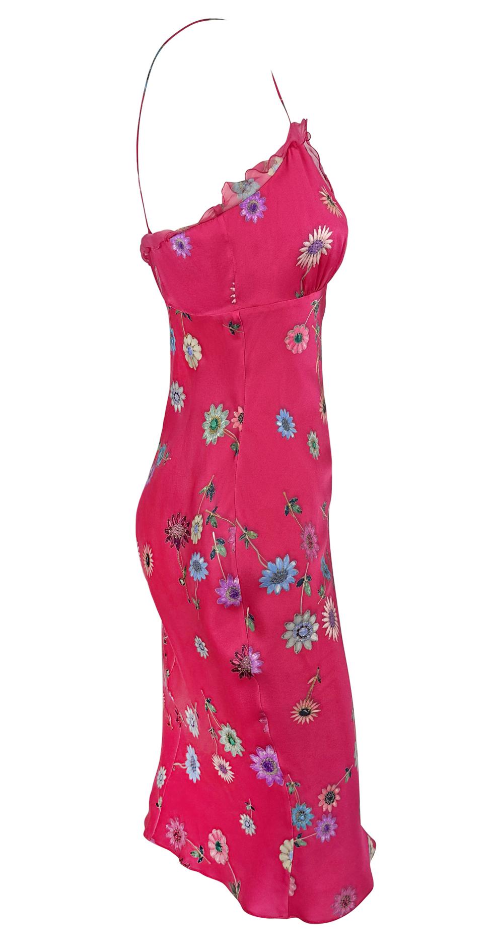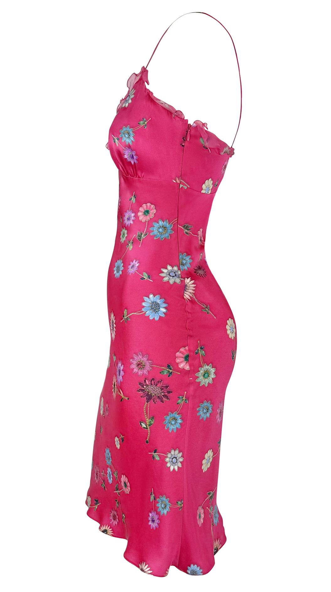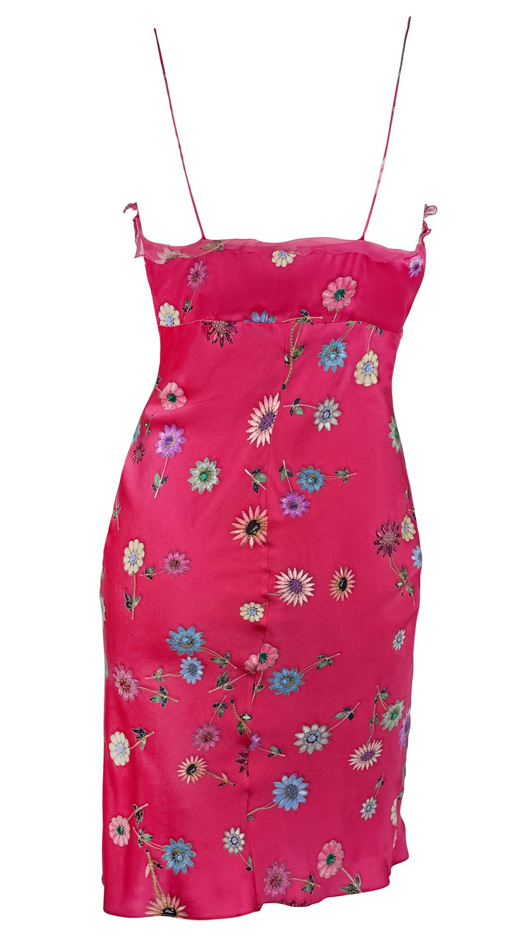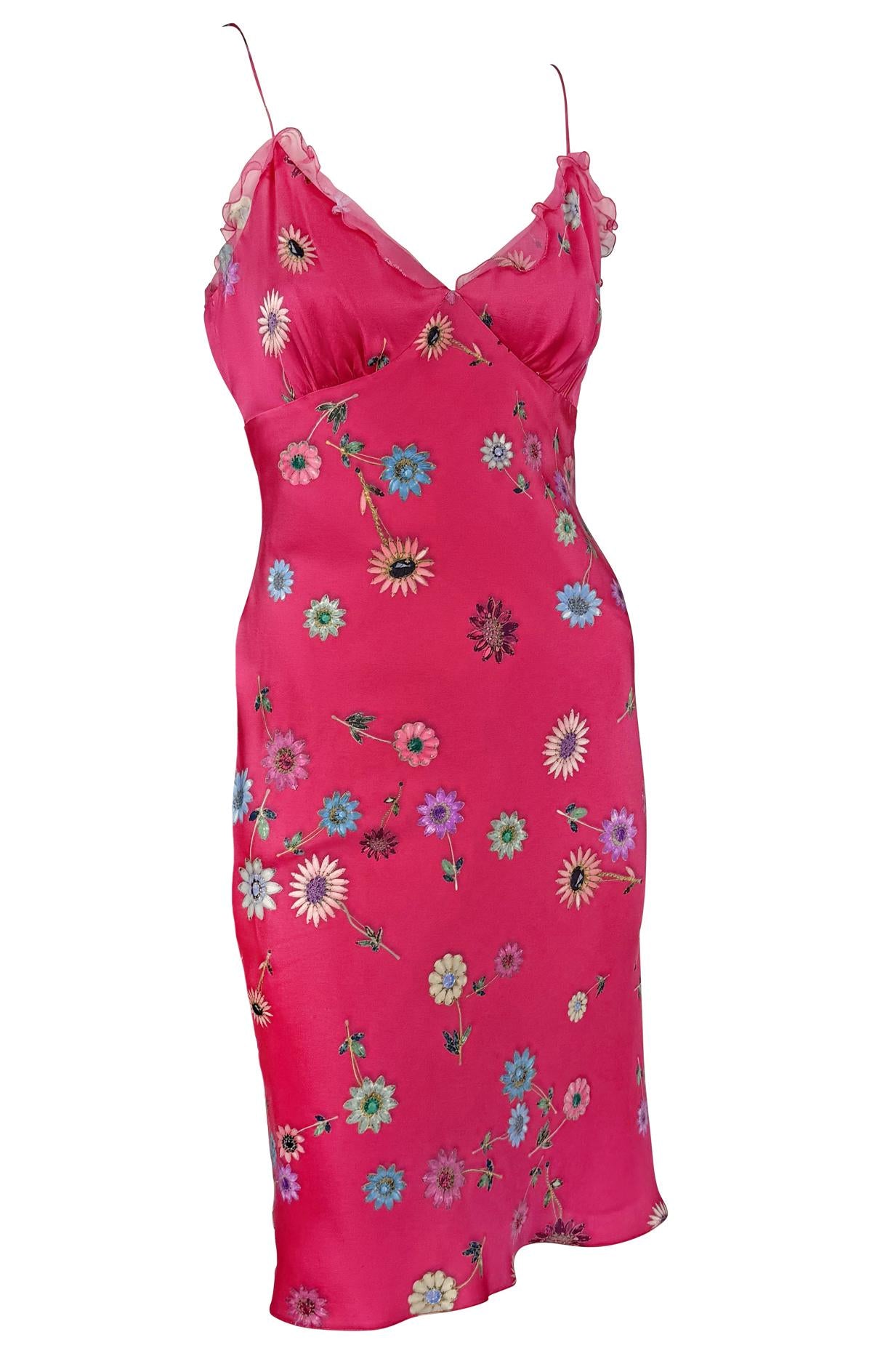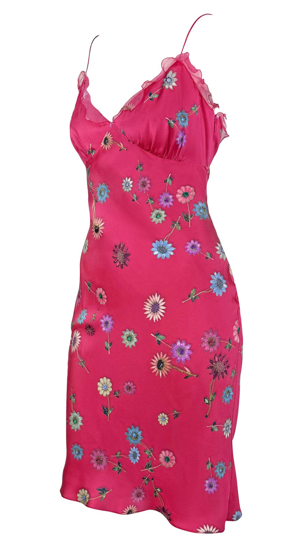 From the 2000s, this Emanuel Ungaro slip dress is crafted from vibrant hot pink satin and printed with a whimsical floral motif comprised of printed gemstones. Designed with delicate spaghetti straps and soft ruffle trim at the neckline.