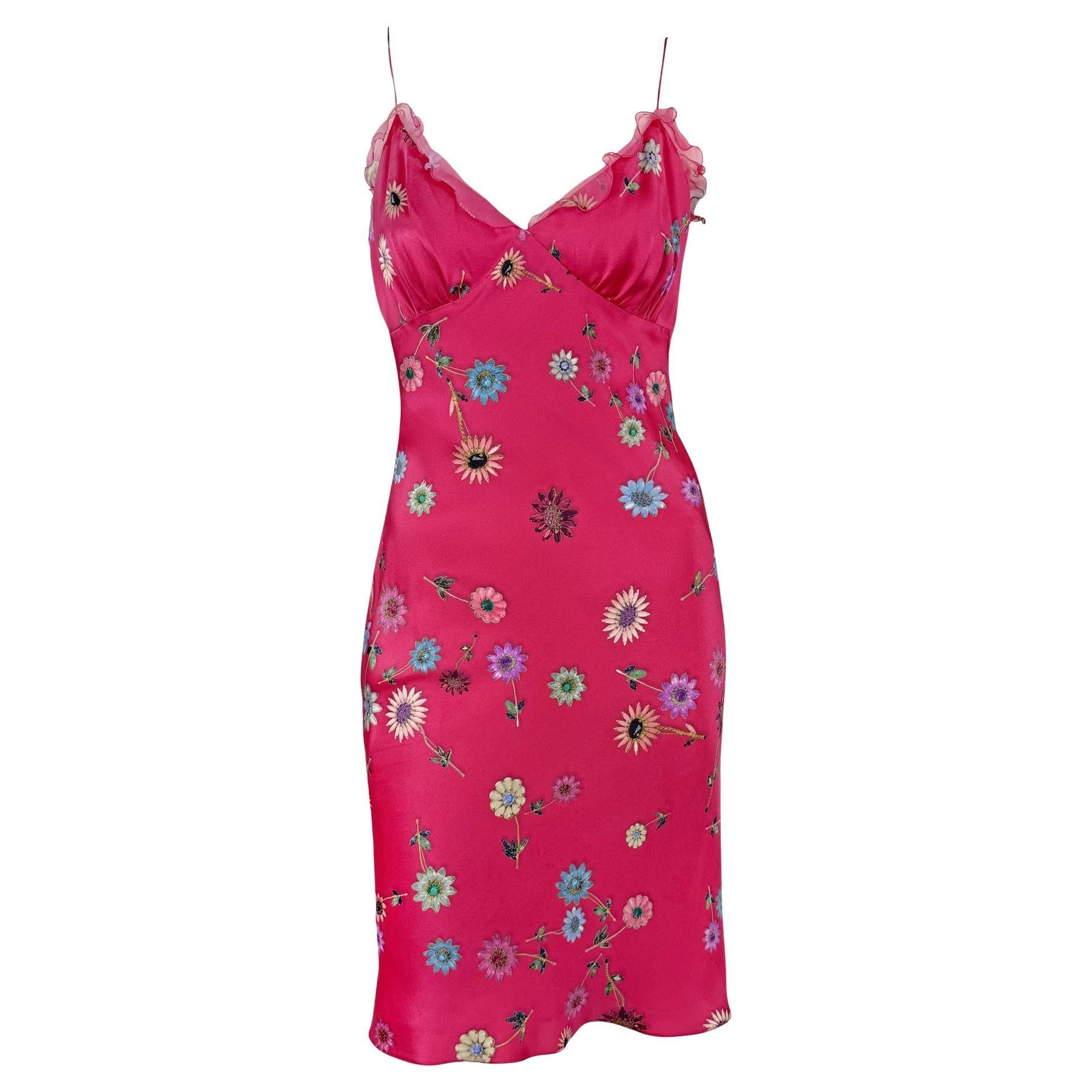 2000s Emanuel Ungaro Hot Pink Satin Flower Jewels Print Slip Dress