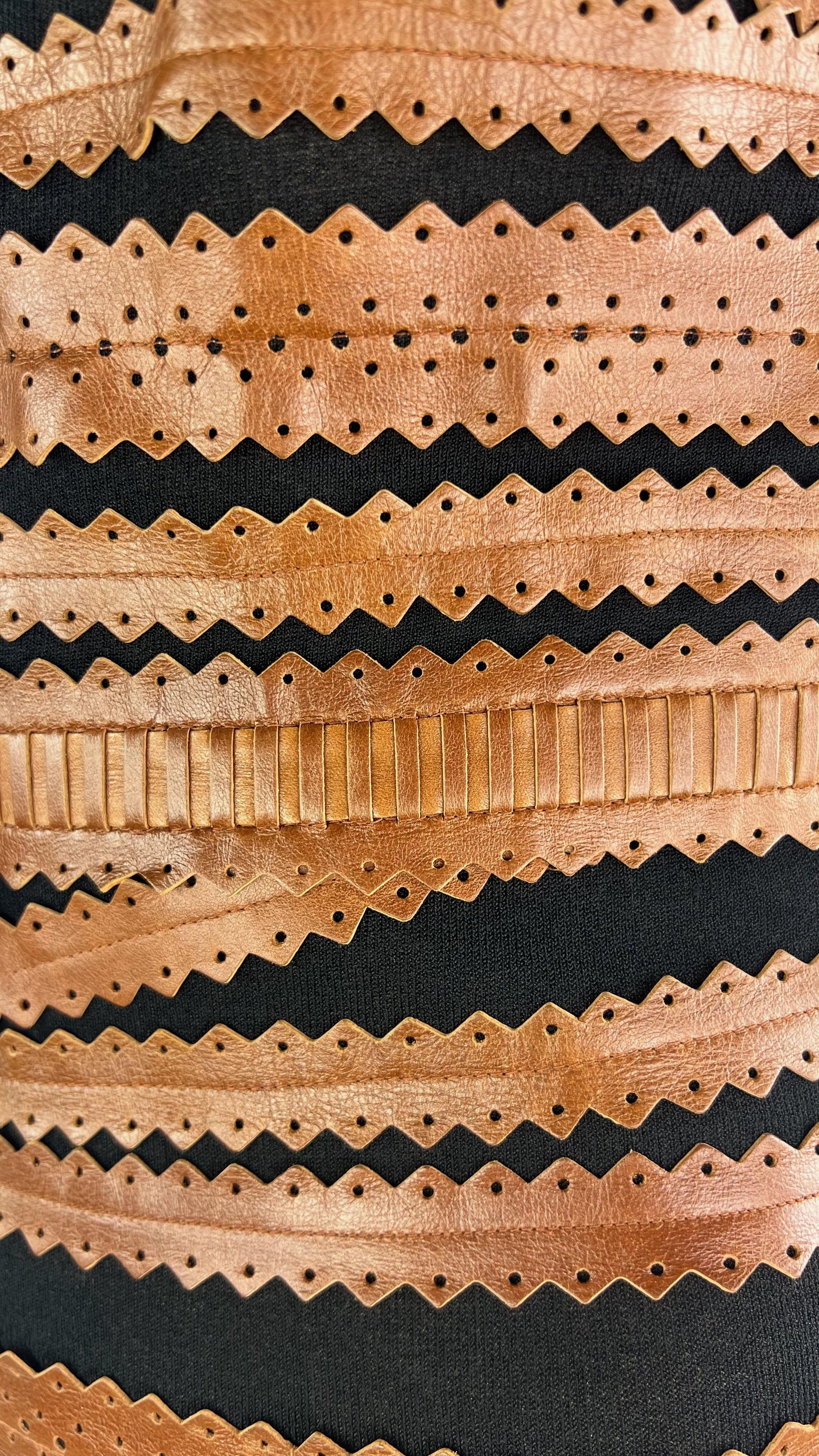 Presenting an incredible black Gianfranco Ferre faux leather accented top. From the 2000s, this chic black knit top features short sleeves, a mock neck, and is made complete with a laser-cut brown leather accent at the bust/waist. The leather strap accent features a jagged cut and perforations throughout. The leather straps wrap around to the back leading to an exposed back and faux lace-up detail. Created to stand out, add this incredible and unique top to your fashion arsenal.