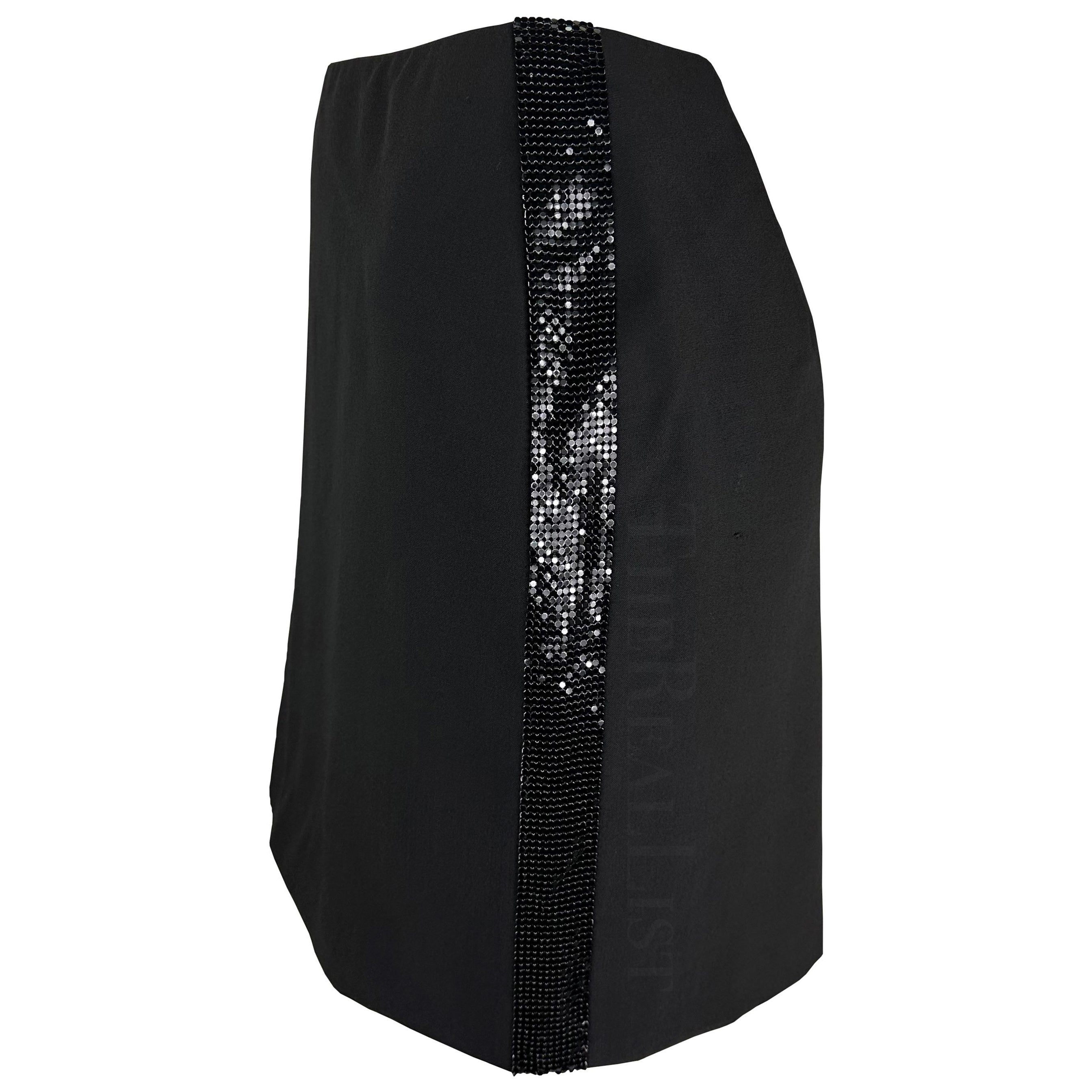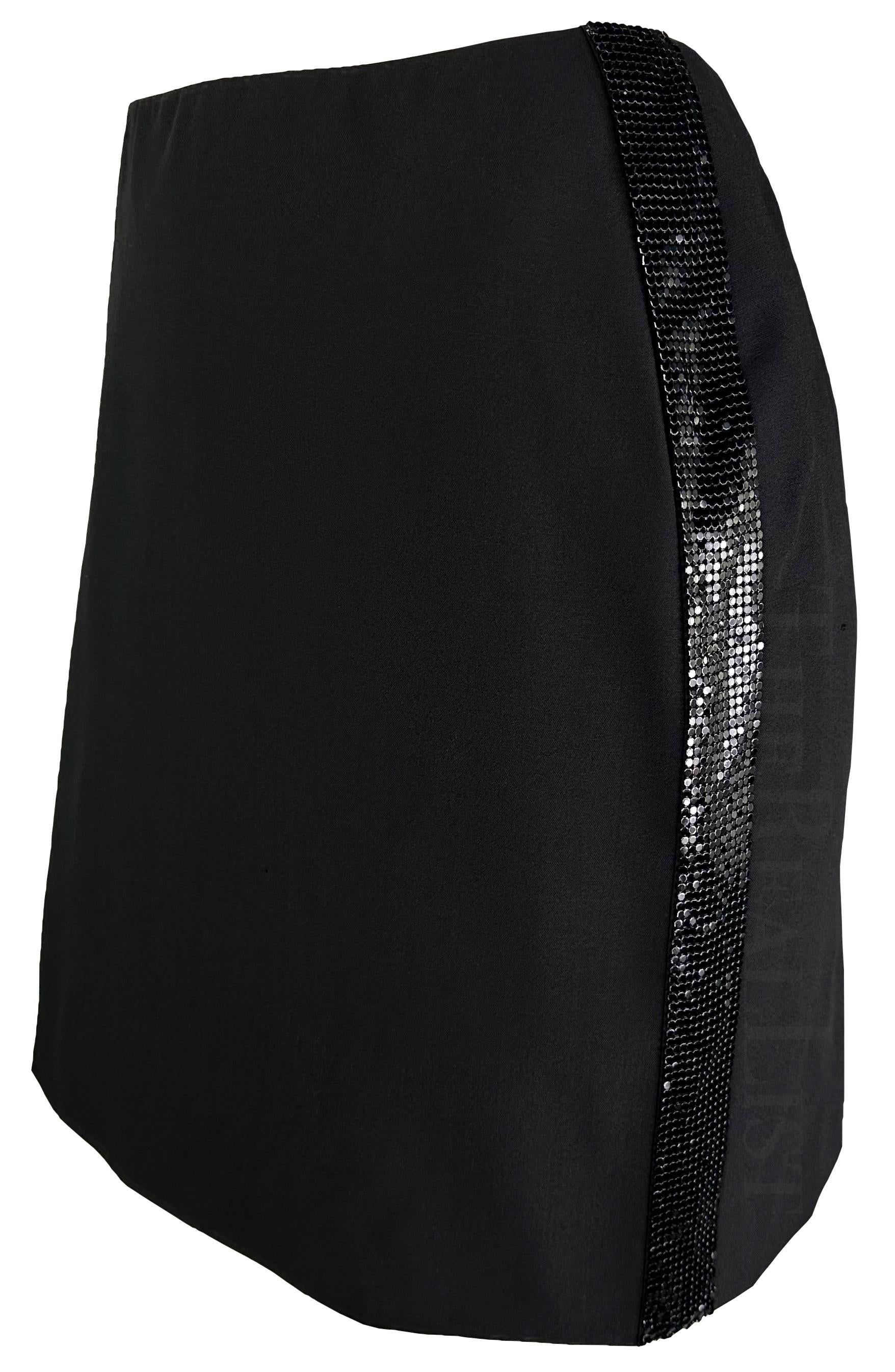 Presenting a chic black Gianni Versace mini skirt, designed by Donatella Versace. From the late 1990s / early 2000s, this skirt features the house's iconic oroton chainmail, which was patented by Gianni in 1982. The black reflective metal detail adds an intriguing edge to this sleek silhouette.