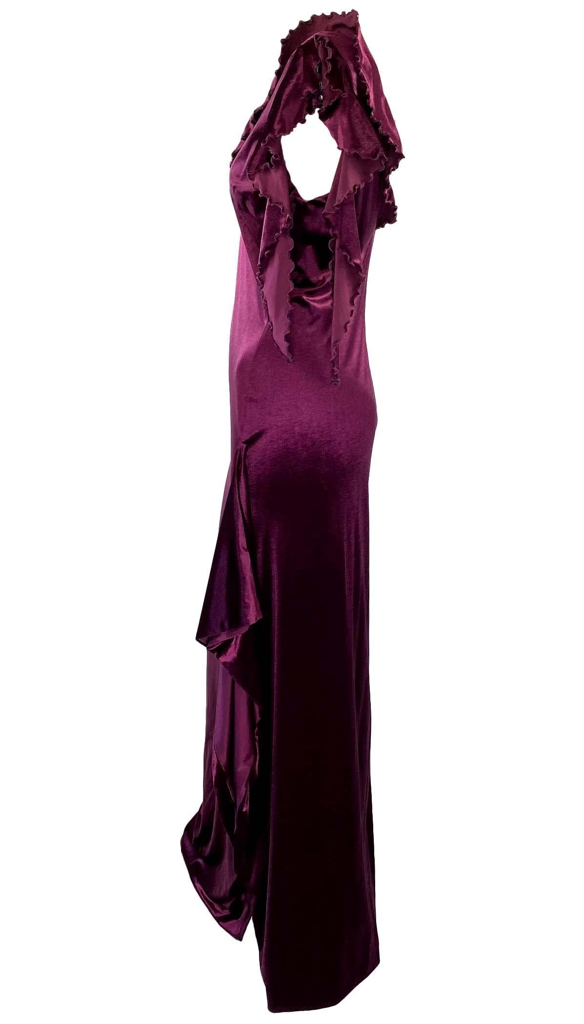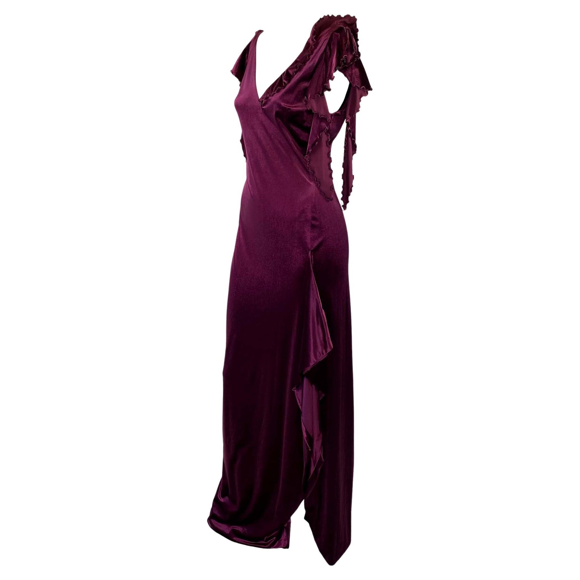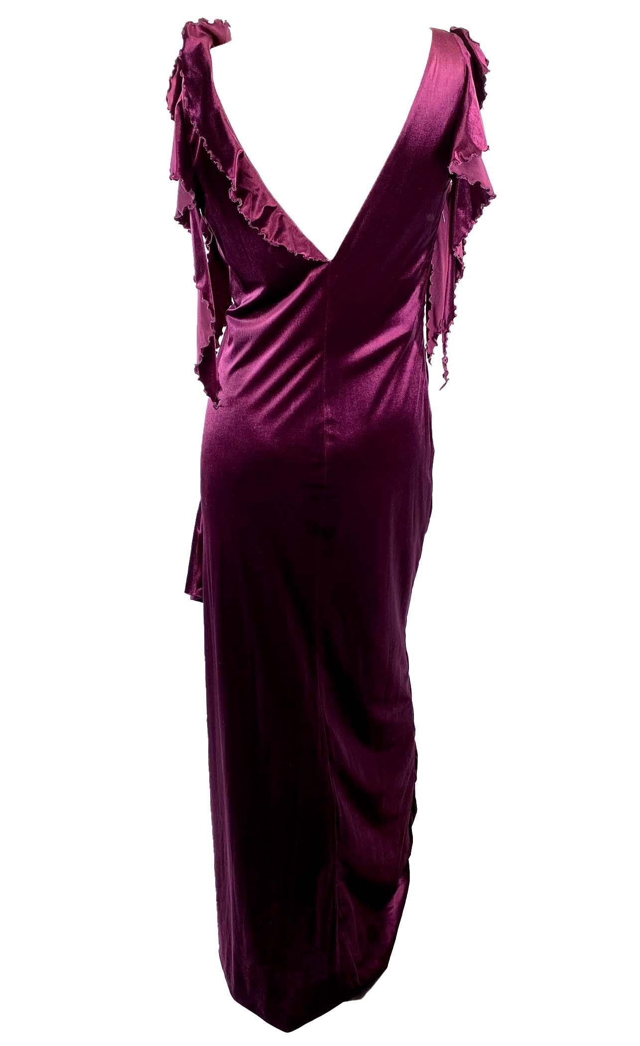 2000s Gianni Versace by Donatella Purple Velvet Beaded Ruffle Gown with Tags