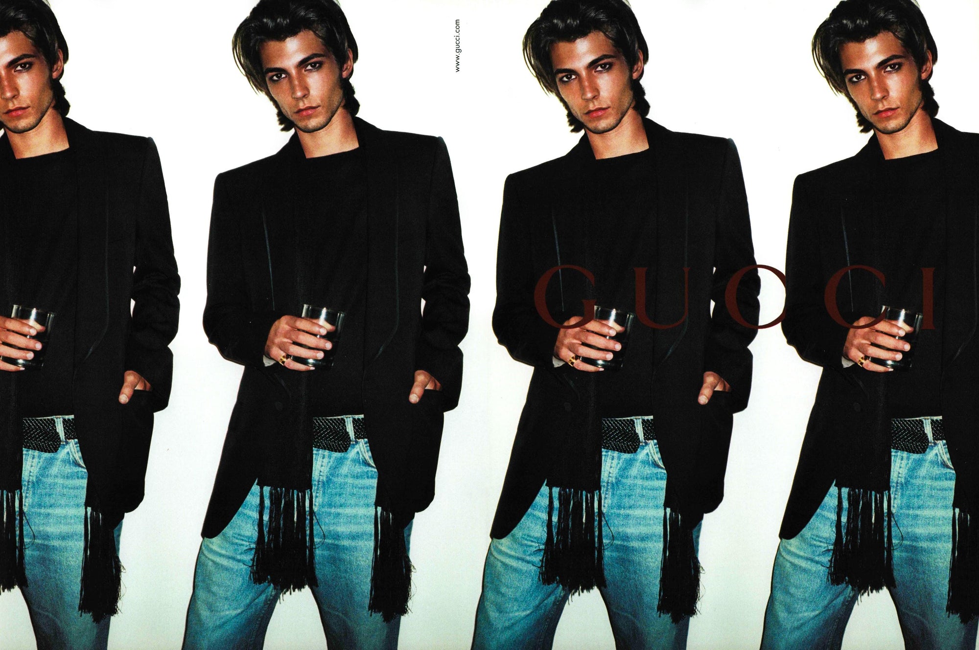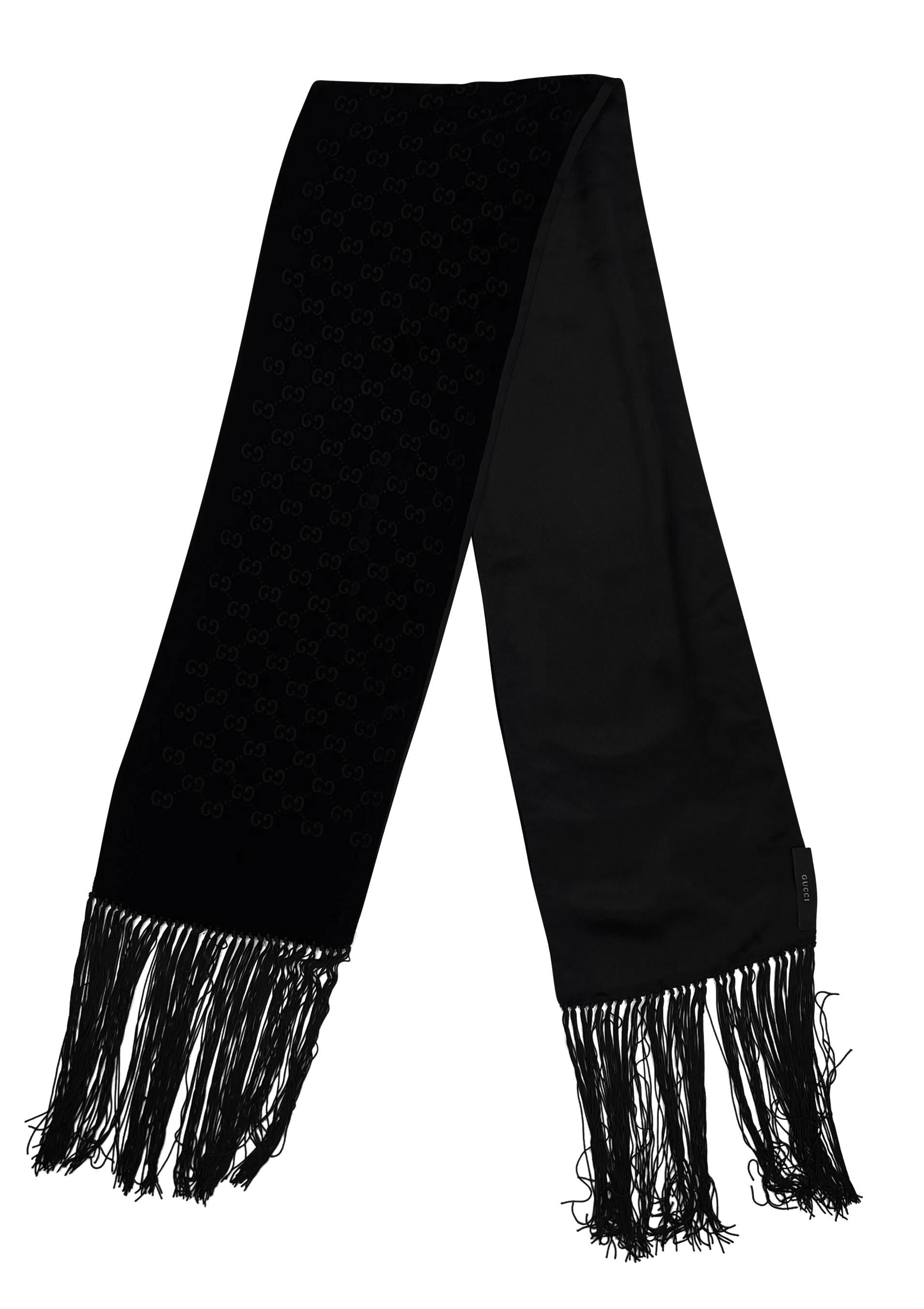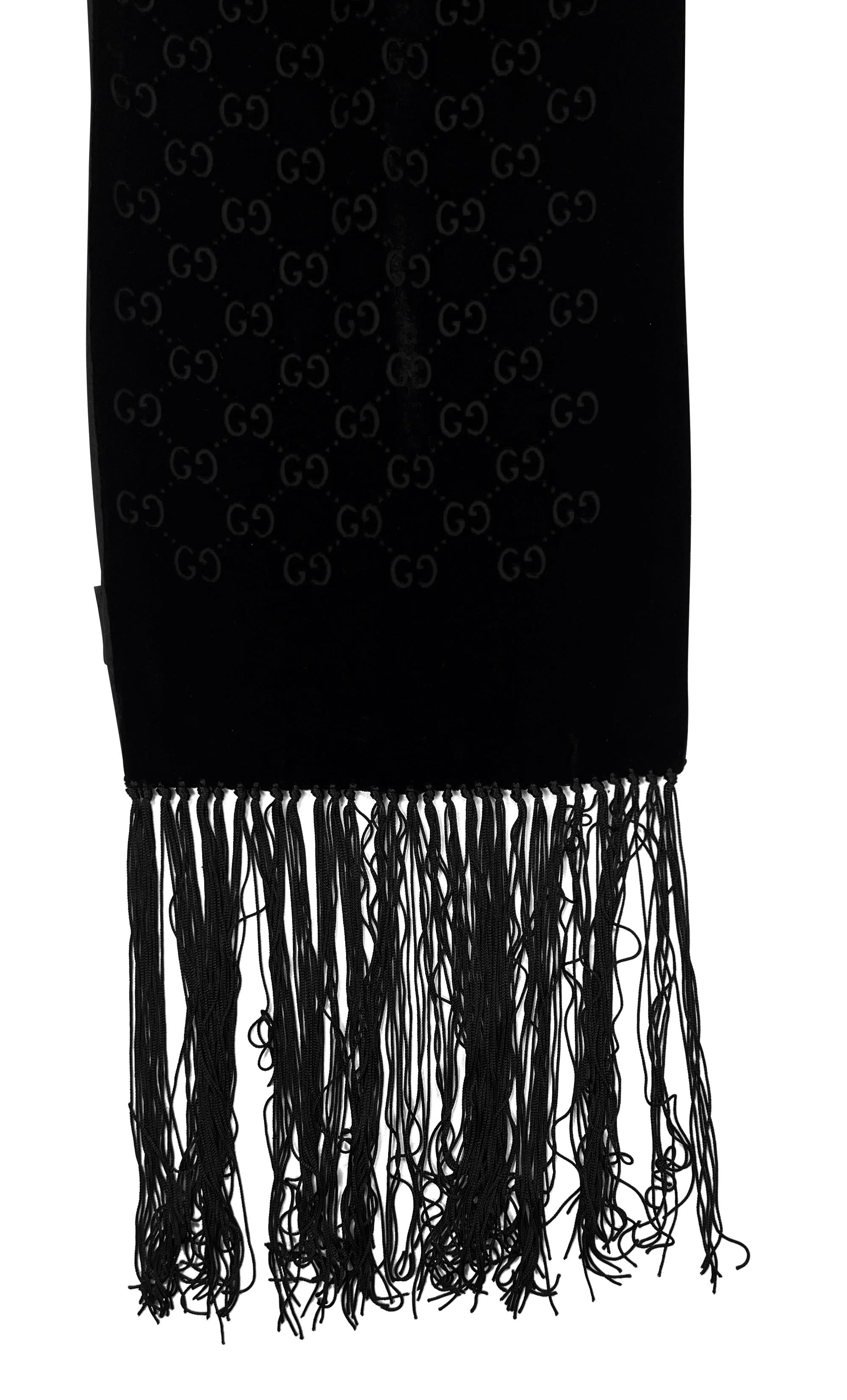 This Gucci scarf by Tom Ford from the 2000s showcases a luxurious black velvet GG devoré fabric. The rectangular design is adorned with a subtle 'GG' logo pattern and finished with long fringe on both ends. Similar to the scarf featured in the Fall/Winter 2001 ad campaign on JR Gallison, captured by Terry Richardson.