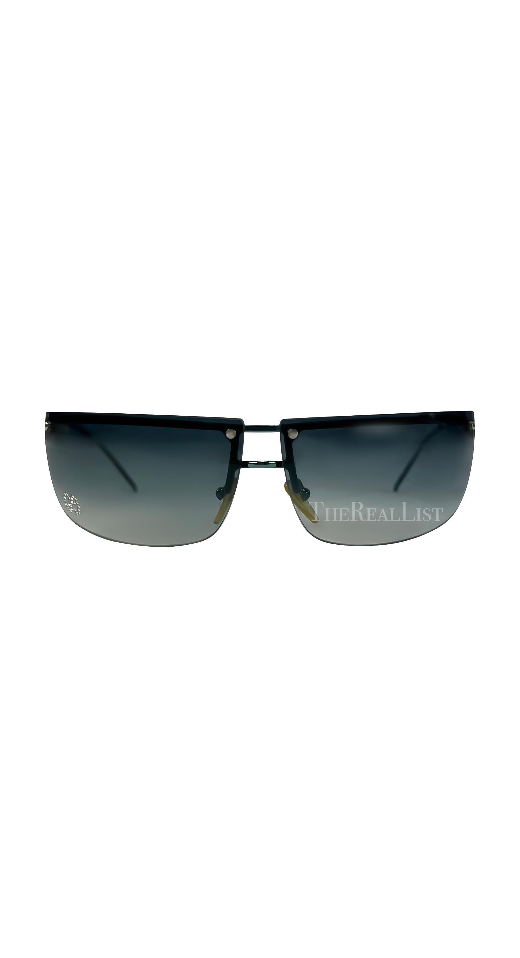 These Gucci sunglasses from the early 2000s by Tom Ford are crafted in a rimless silhouette with metallic blue-tone hardware. The design is accented by a rhinestone “GG” logo at the lens.