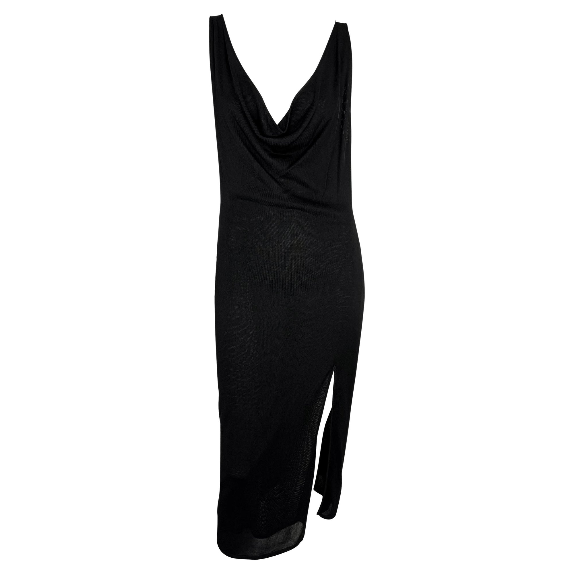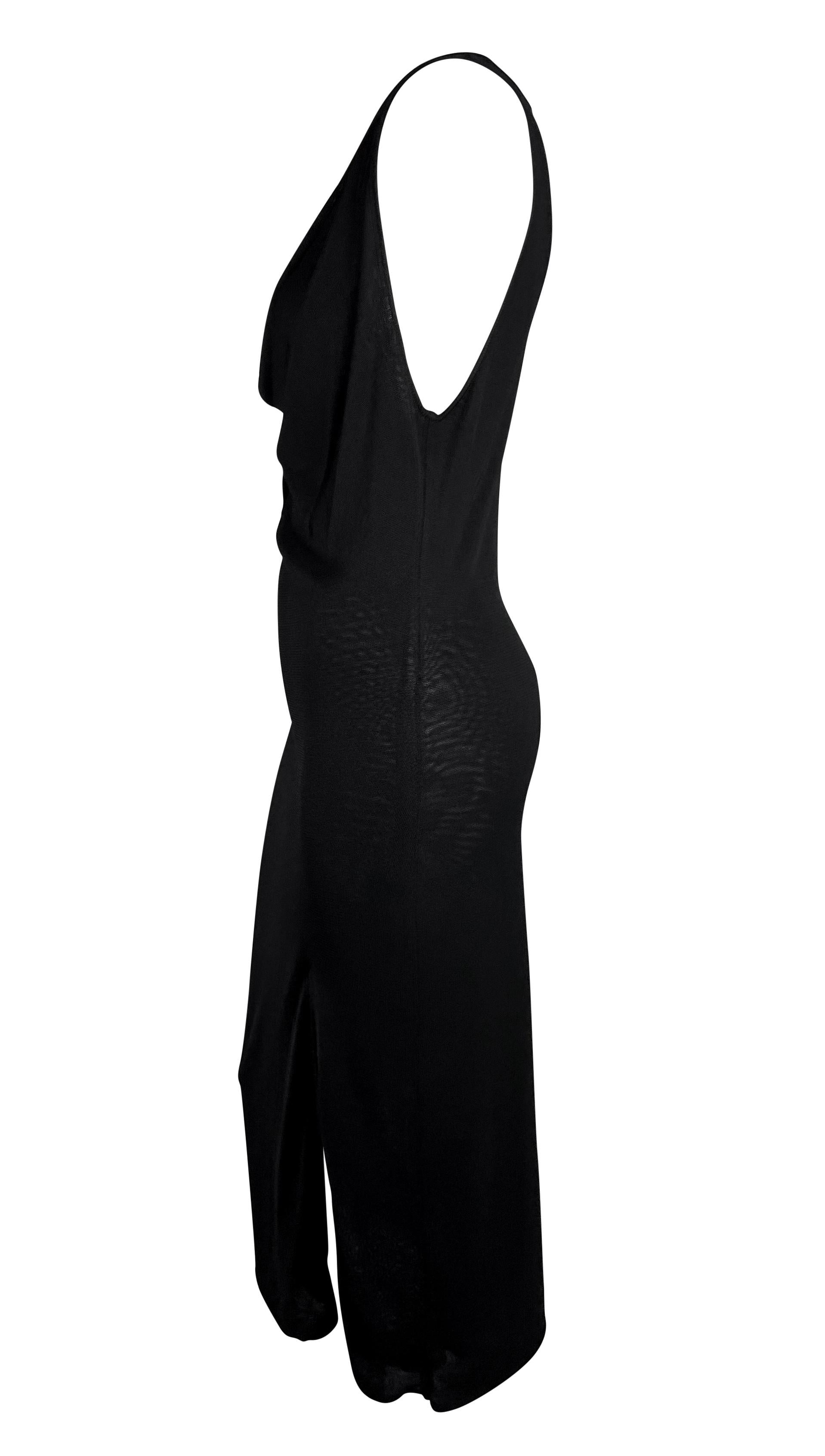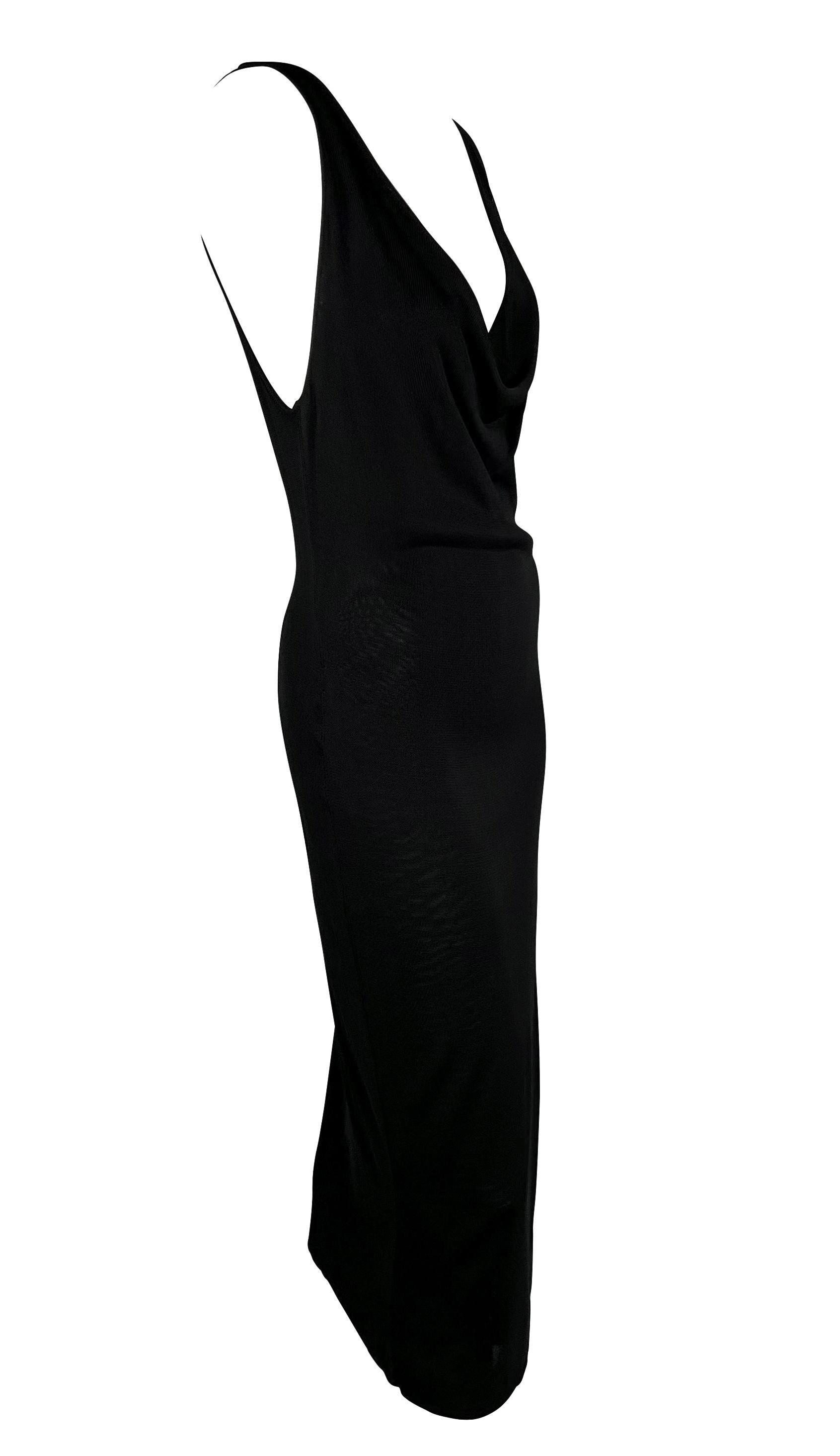 This fabulous black knit Gucci dress, designed by Tom Ford in the early 2000s, features a sleek sleeveless silhouette with a deep plunging cowl neckline and a high front slit. Simple yet chic, this dress is a perfect elevated take on a classic wardrobe staple.
