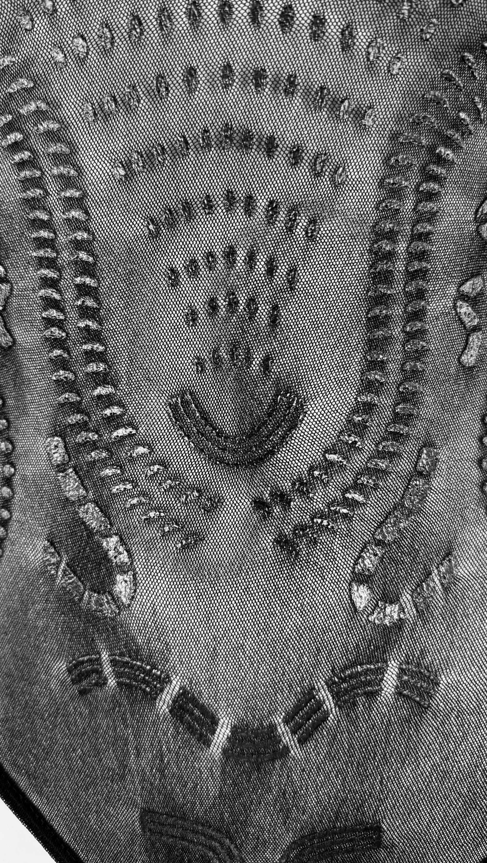 This 2000s Krizia bodysuit is crafted from sheer black mesh with an abstract anatomical design. The sleeveless silhouette features intricate embroidery and subtle texture.