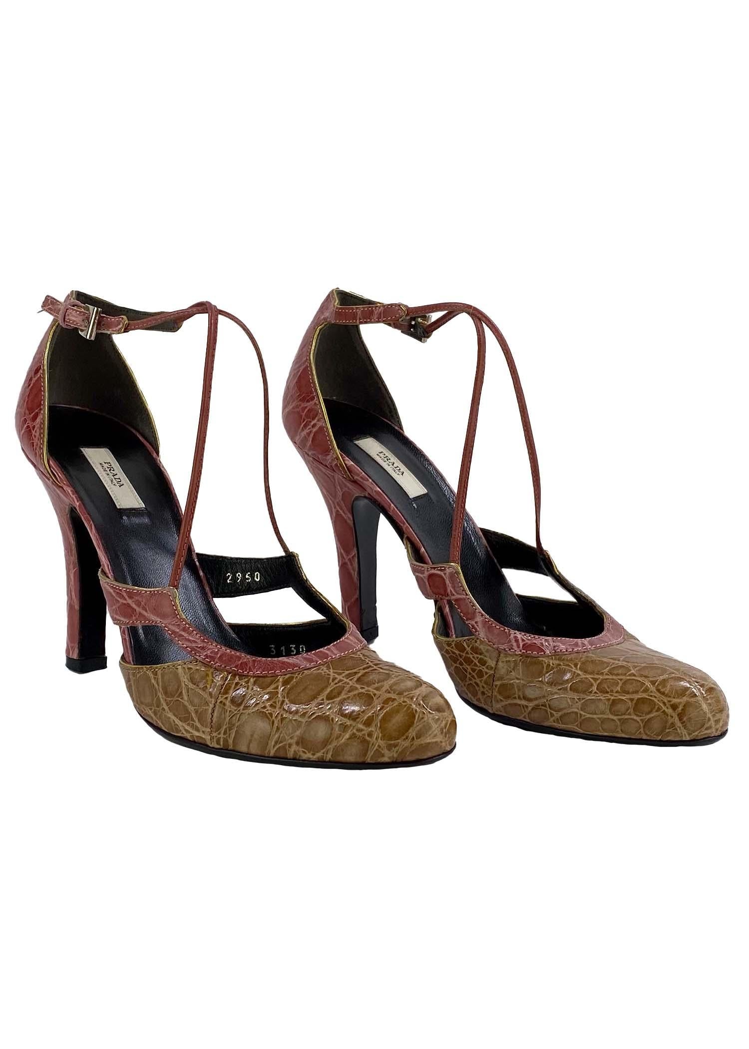 TheRealList presents: a beautiful pair of two tone Prada alligator pumps. This vintage pair of pumps feature a closed toe, a 3.5" heel, and a small buckle closure. Follow us on Instagram! @_the_reallist_