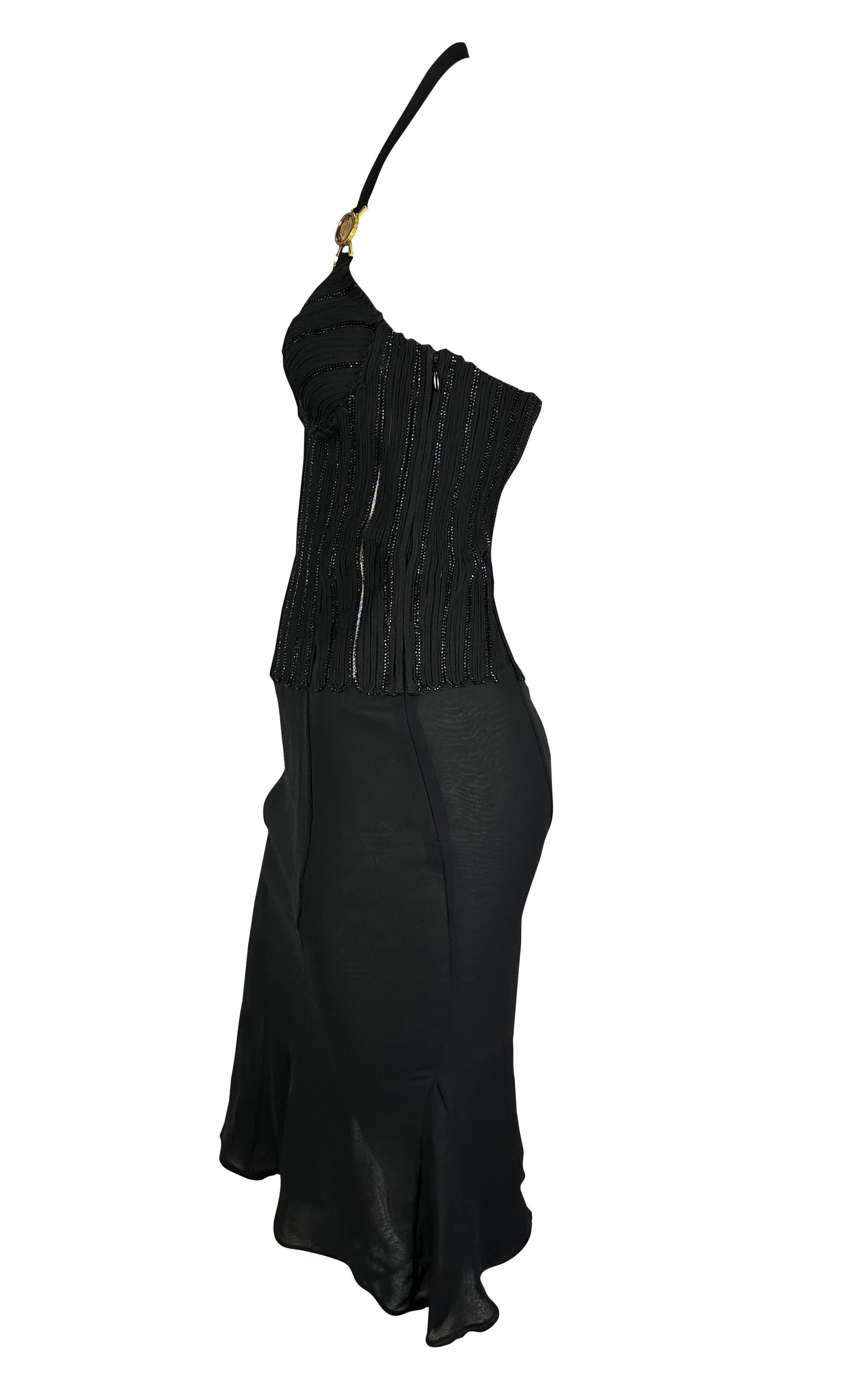Presenting a fabulous black beaded Versace mini dress designed by Donatella Versace. From the late 2000s, this halterneck dress features a semi-sheer bodice covered in black caviar beads that playfully outline the female form with a cinched and corseted effect. A gown version of this beaded dress appeared on Patsy Kensit at the 2006 British Academy Television Awards. The skirt of this fabulously sexy dress is constructed of light chiffon that playfully flares out. This dress will become a new go-to, complete with gold-tone Versace Medusa medallions that adorn the halterneck strap.