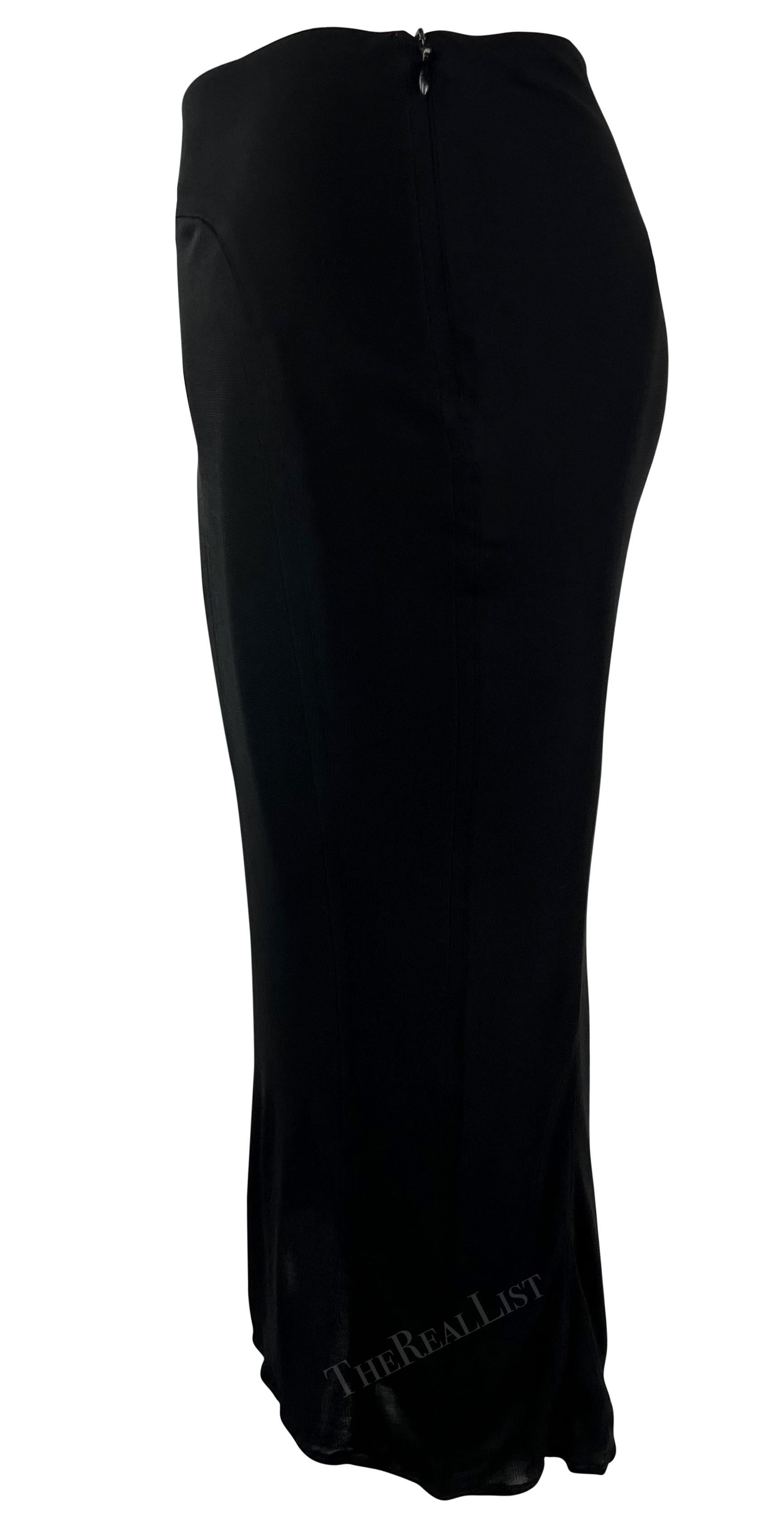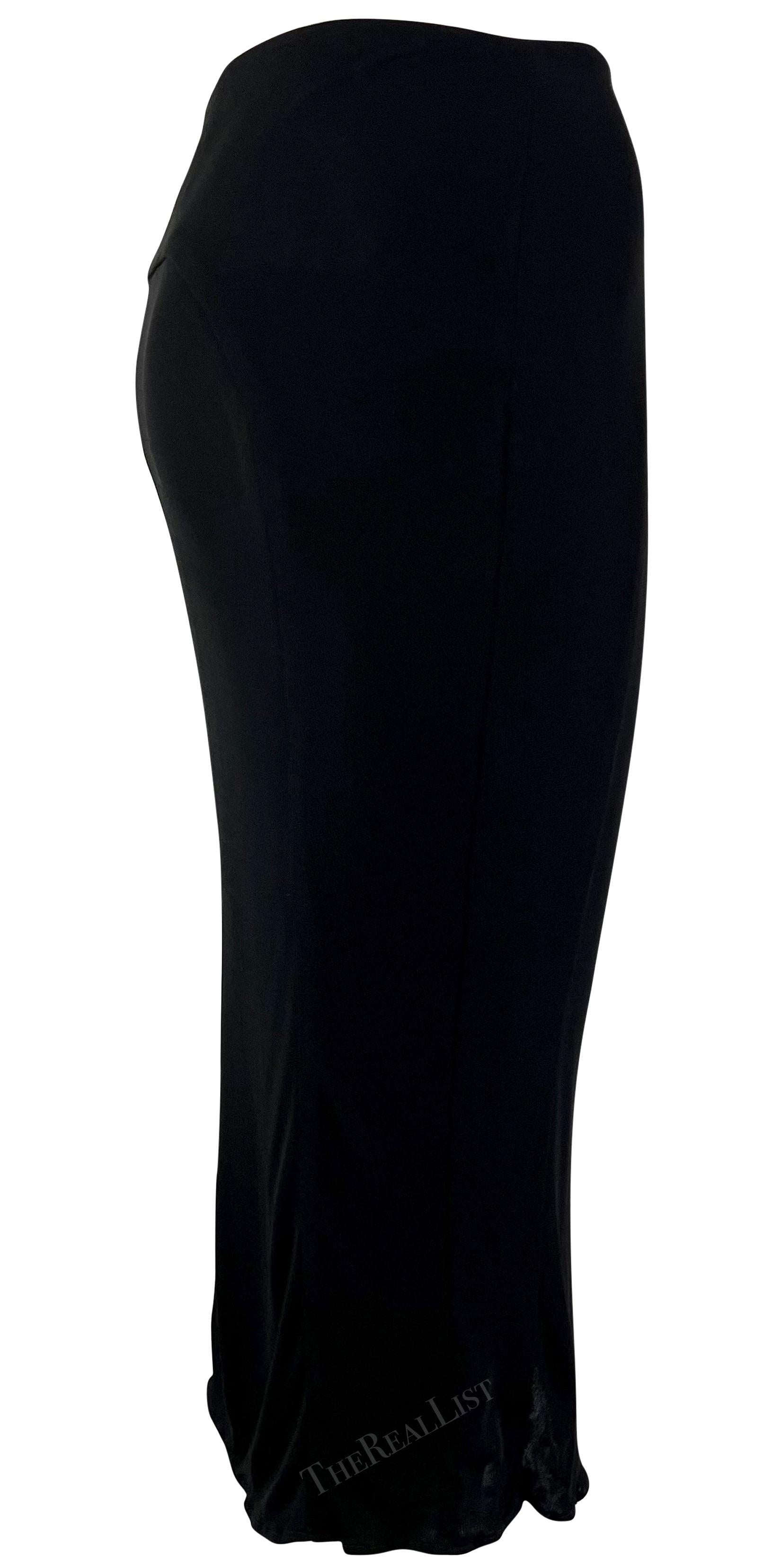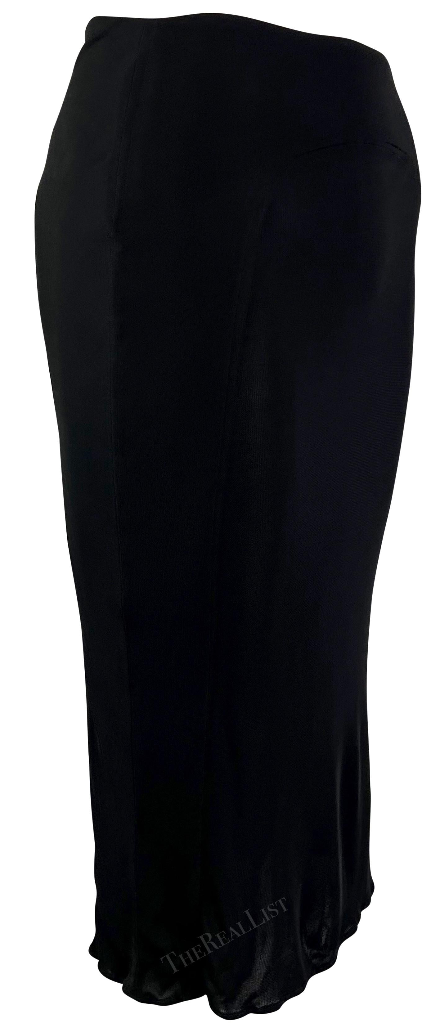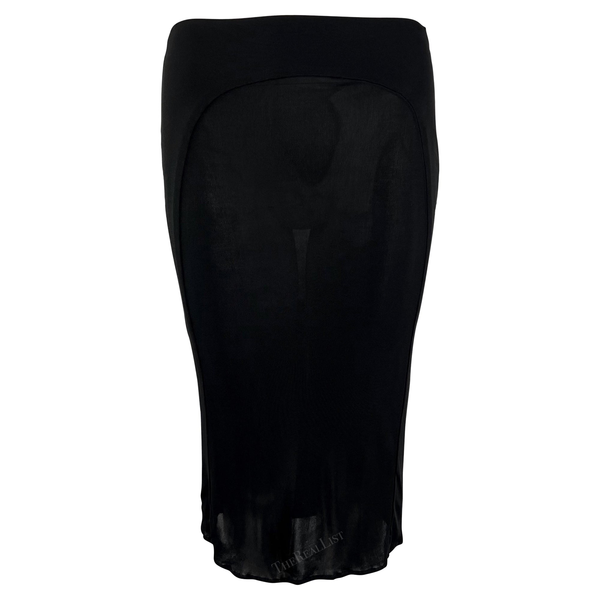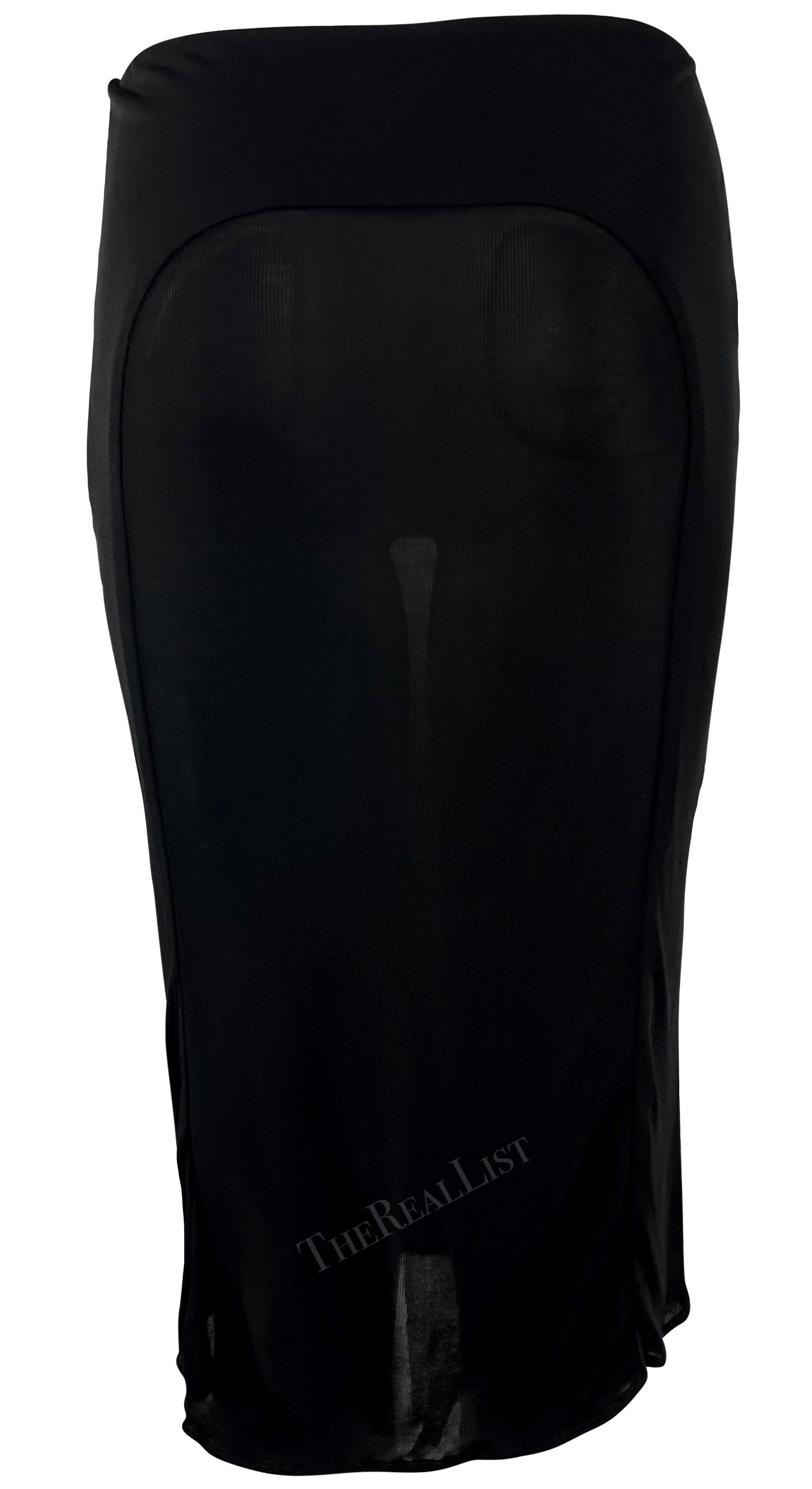 From the early 2000s, this black Yigal Azrouel semi-sheer skirt falls just below the knee. This form-fitting skirt stretches to fit the body and is the perfect elevated closet staple.