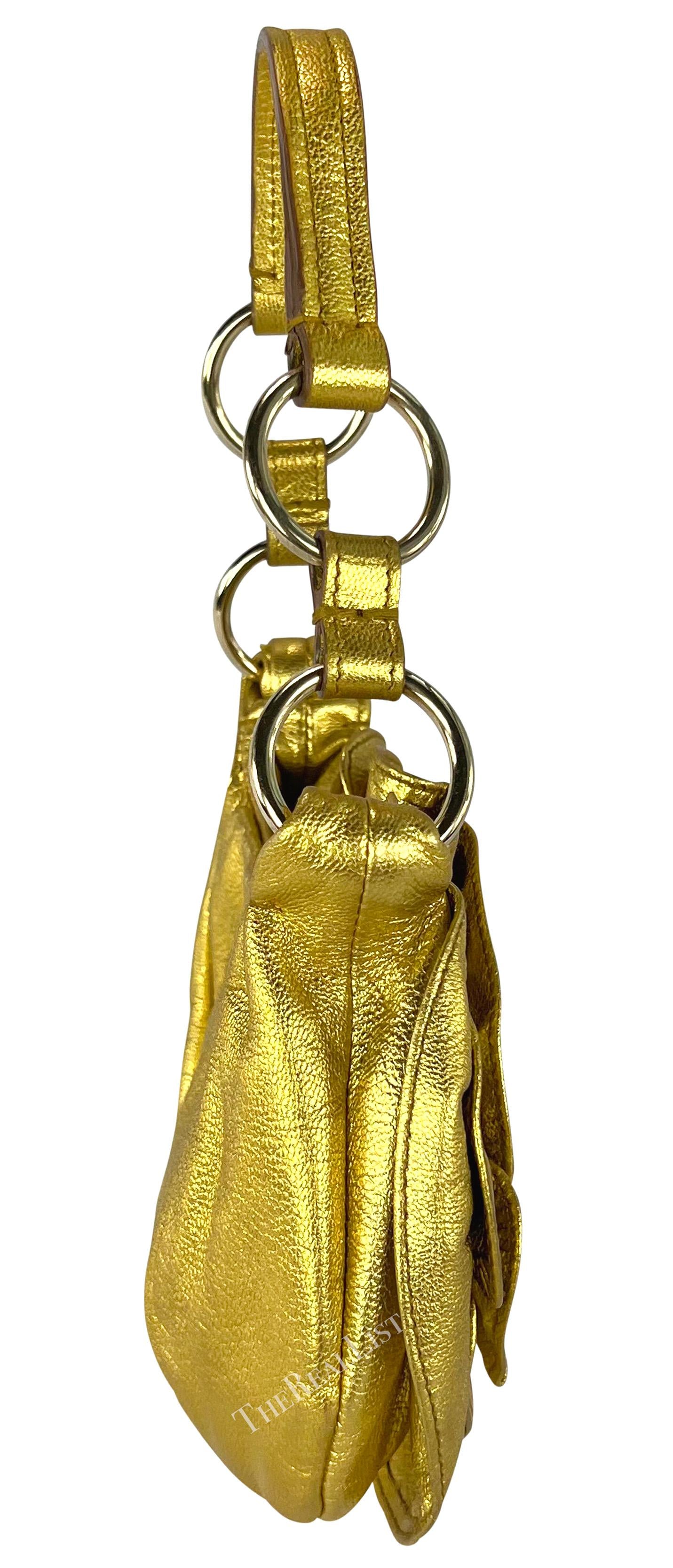 Introducing a stunning gold-tone leather Yves Saint Laurent Rive Gauche mini bag designed by Tom Ford from the early 2000s. Crafted entirely from metallic gold leather, this mini bag showcases an exquisite ruffle floral design, adding an elegant touch to its style. The perfect bag for a night out, this YSL by Tom Ford mini bag is a must-have addition to any elevated wardrobe.