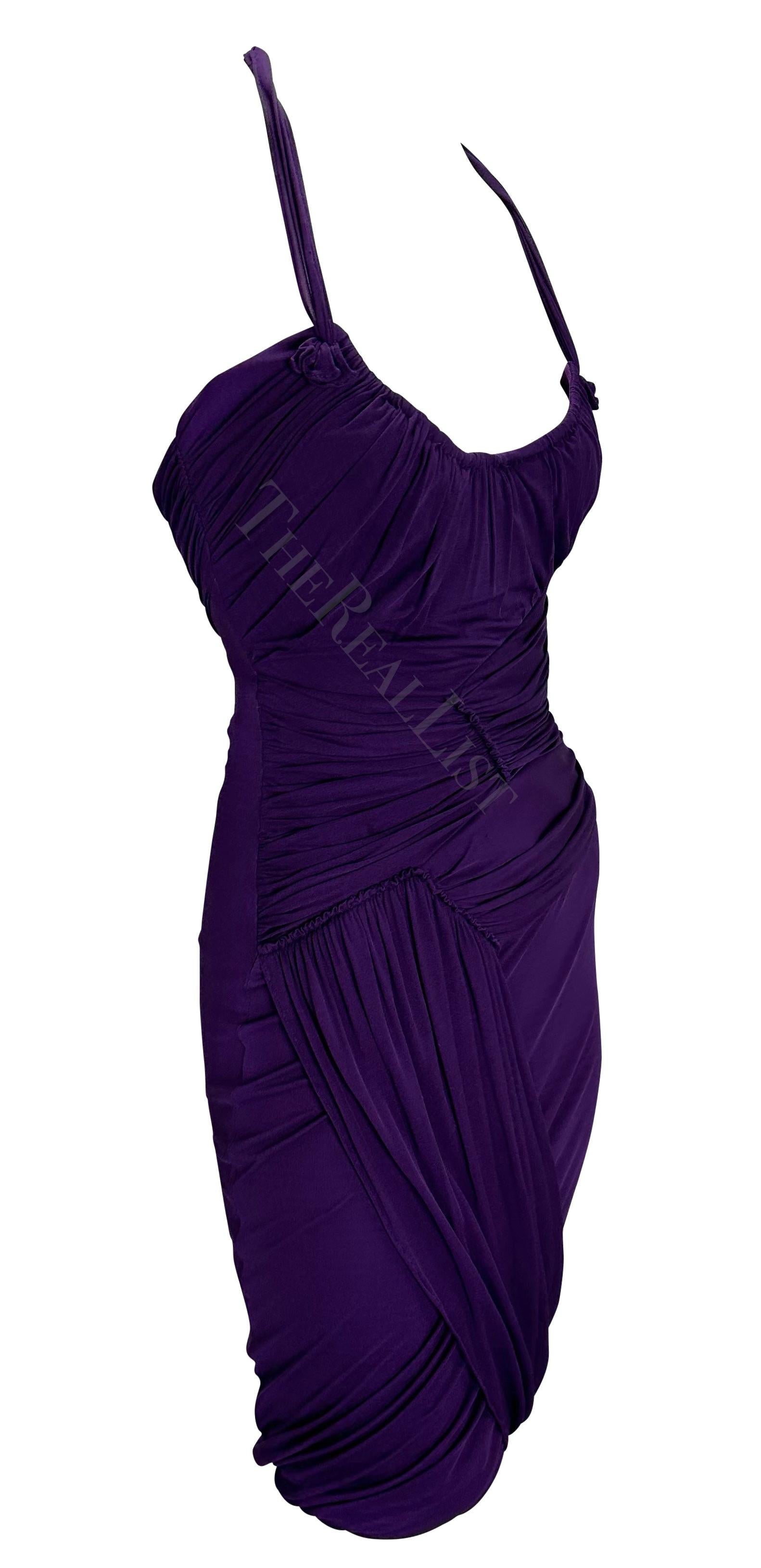 2002 Gucci by Tom Ford Ruched Purple Bandage Faux Wrap Silk Bodycon Mini Dress
