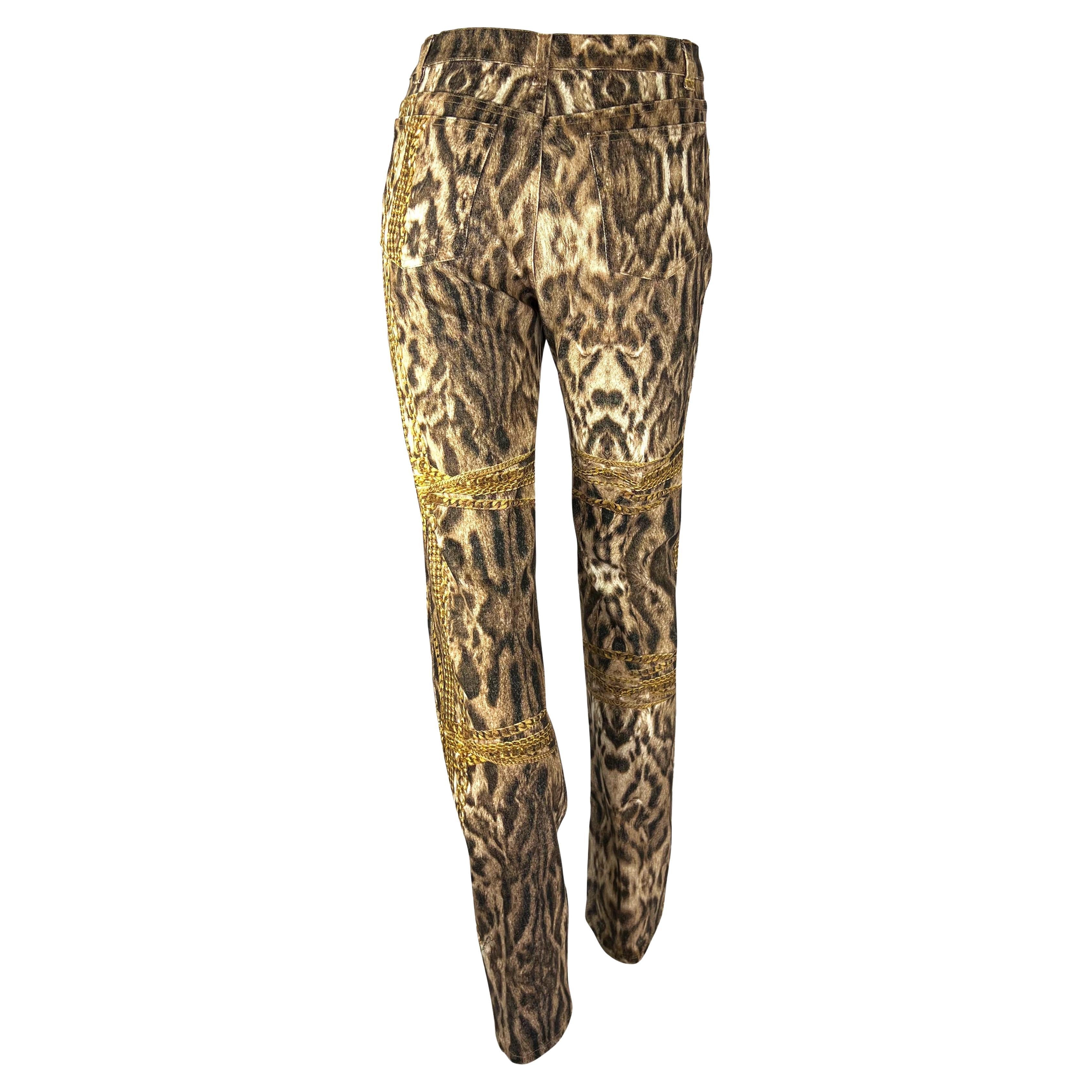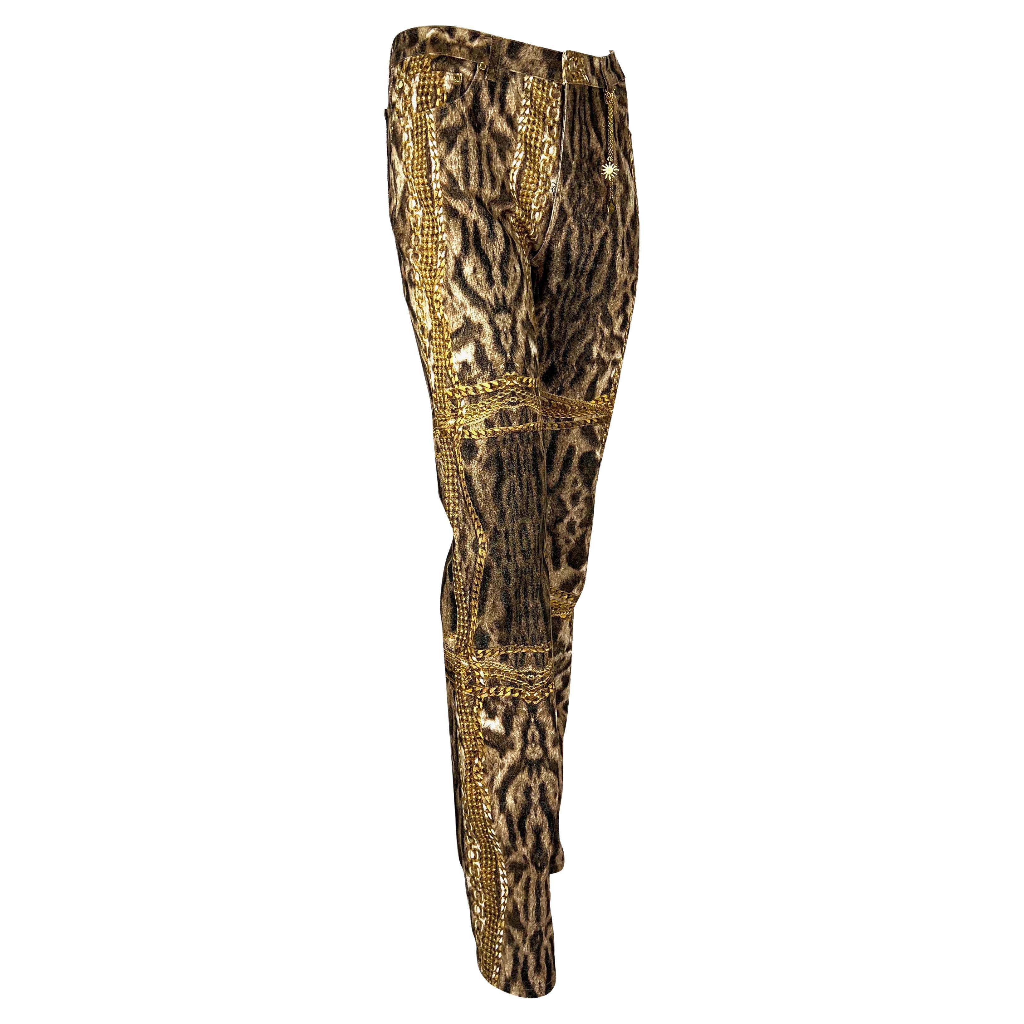 Presenting a pair of cheetah print denim Roberto Cavalli pants. From 2003, these fabulous pants feature a cheetah print with gold chains throughout. These pants are made complete with a metal gold-tone sun and heart charm at the front belt loop. The perfect encapsulation of early 2000s Roberto Cavalli, these cheetah print pants are a must-have!