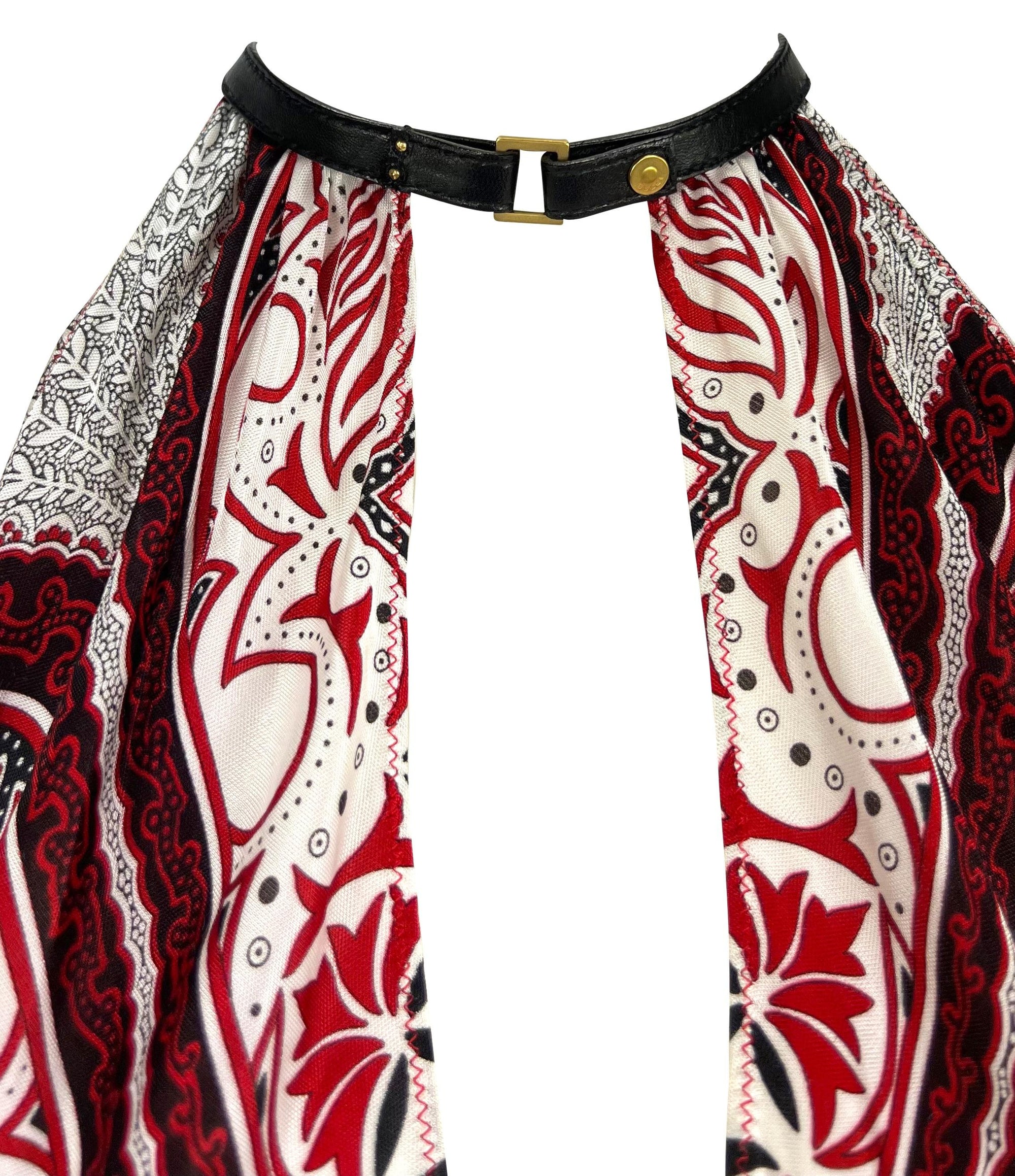 This red paisley bandana print halterneck scarf blouse from Gucci’s 2004 Cruise collection, designed by Tom Ford, captures the bold sensuality of the era. The top features a plunging neckline, a brown leather halterneck strap, and an open tie-back finish. Covered in a striking red paisley print, this archival Gucci piece is a standout example of Tom Ford’s provocative yet refined design approach.