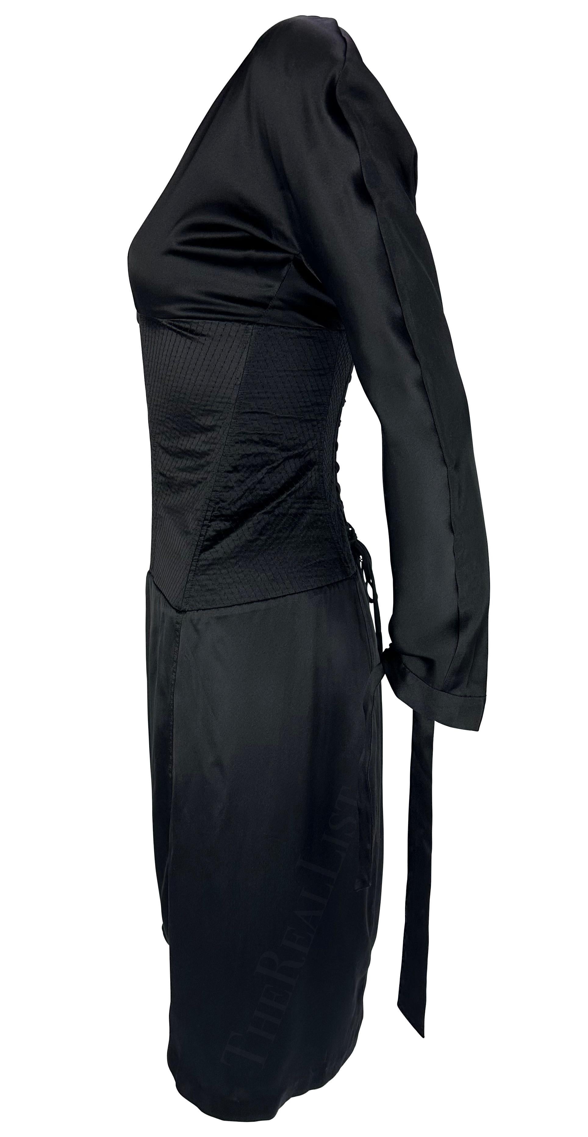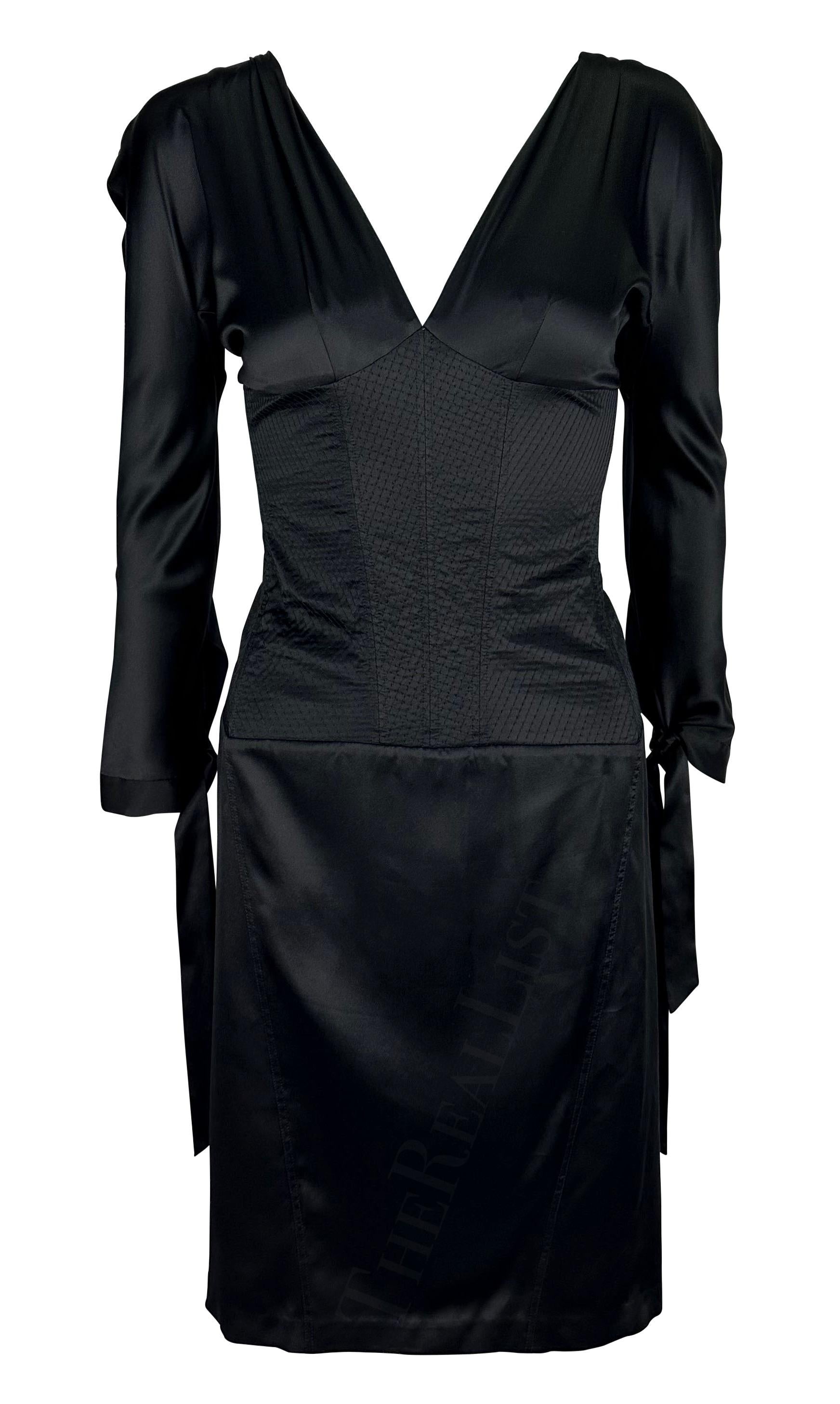 Presenting a black silk Roberto Cavalli dress. From 2004, this dress is constructed entirely of silk and features a v-neckline, ties at the wrists, and is made complete with a lace-up corset detail at the back. Effortlessly sexy and chic, this little black dress is the perfect addition to any wardrobe.