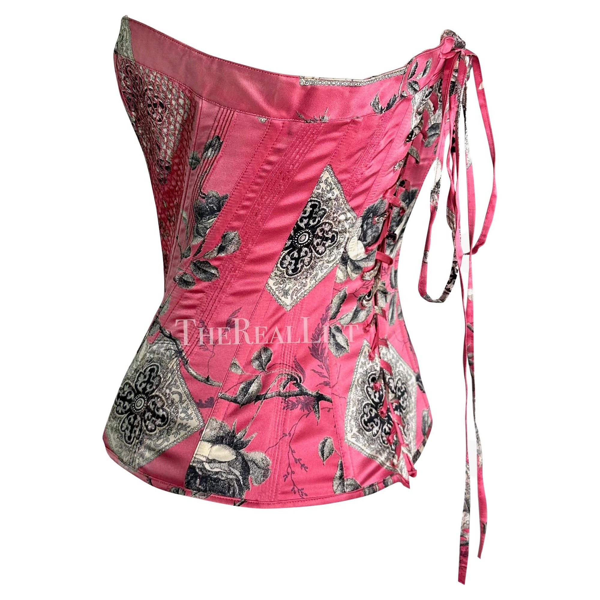 2004 Roberto Cavalli Pink Floral Quilted Silk Lace-Up Corset Bustier Top