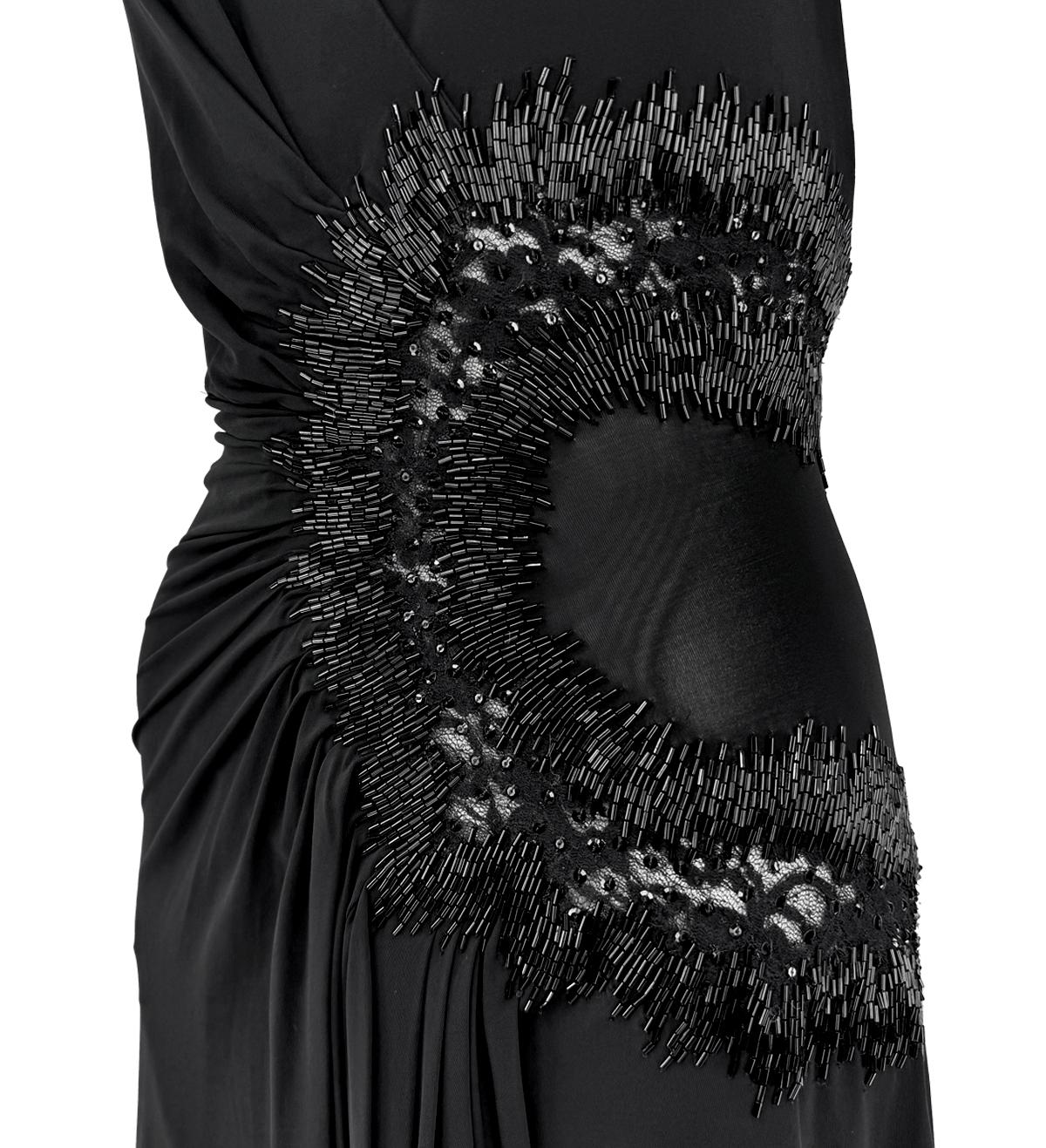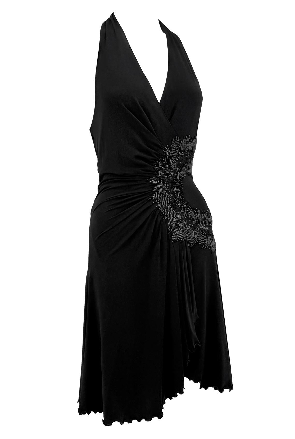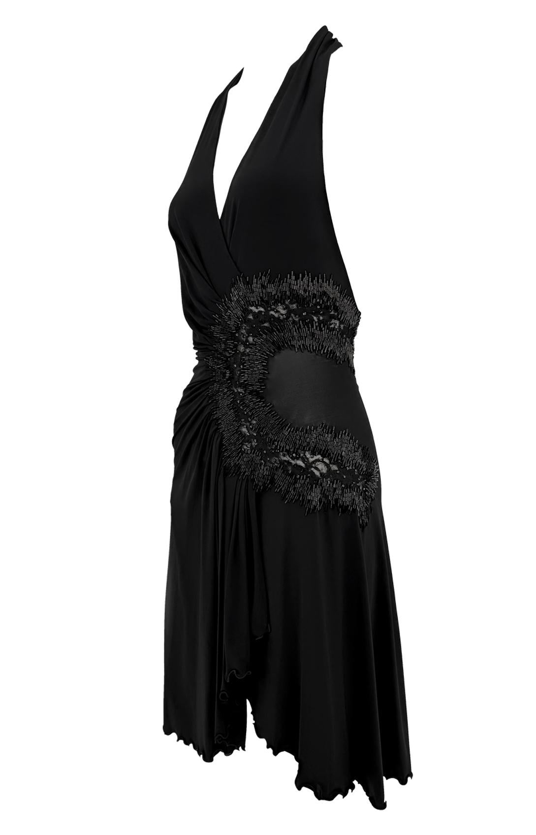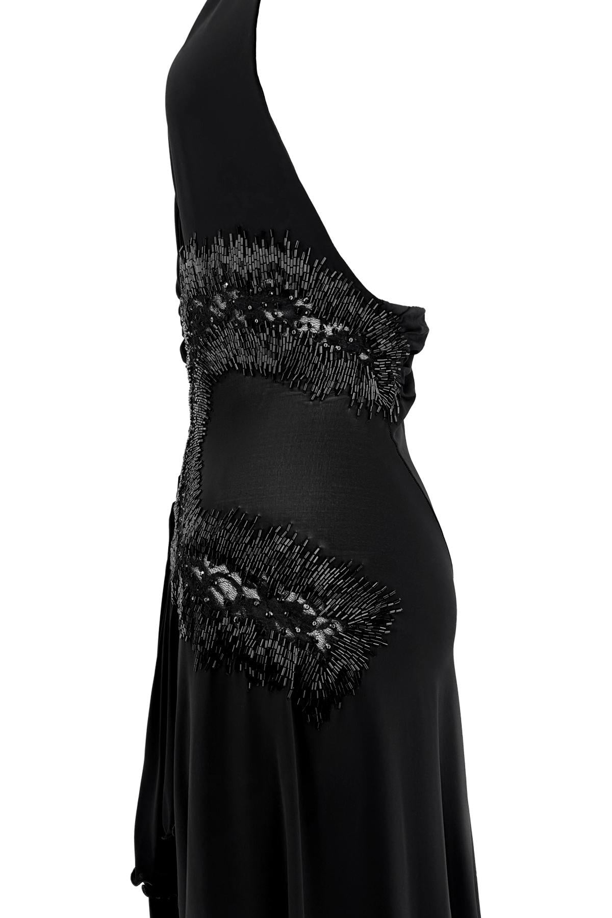 From Roberto Cavalli’s 2006 collection, this semi-sheer black halter dress features a plunging neckline and an asymmetric back with gold-tone hardware at the neck. Sheer black lace and semi-sheer viscose are intricately embellished with rhinestones and tonal beading in a sunburst pattern at the hip, the design gathers and drapes around the waist before flaring into a fluid skirt.