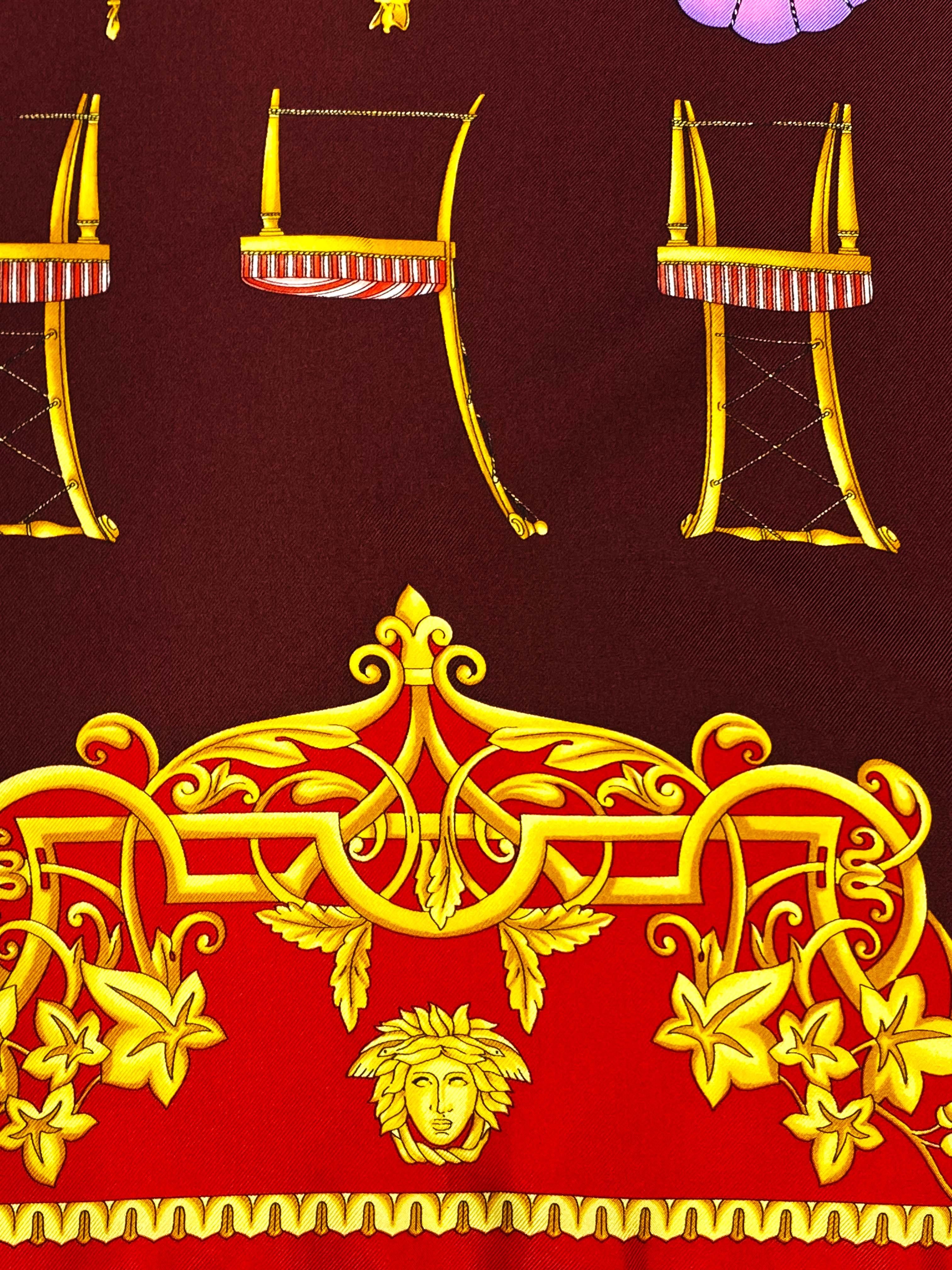 Presenting a beautiful baroque Atelier Versace square silk scarf designed by Gianni Versace. This scarf features several chairs surrounded by a floral baroque pattern. A small Versace Medusa logo is situated opposite the Atelier Versace signature.
