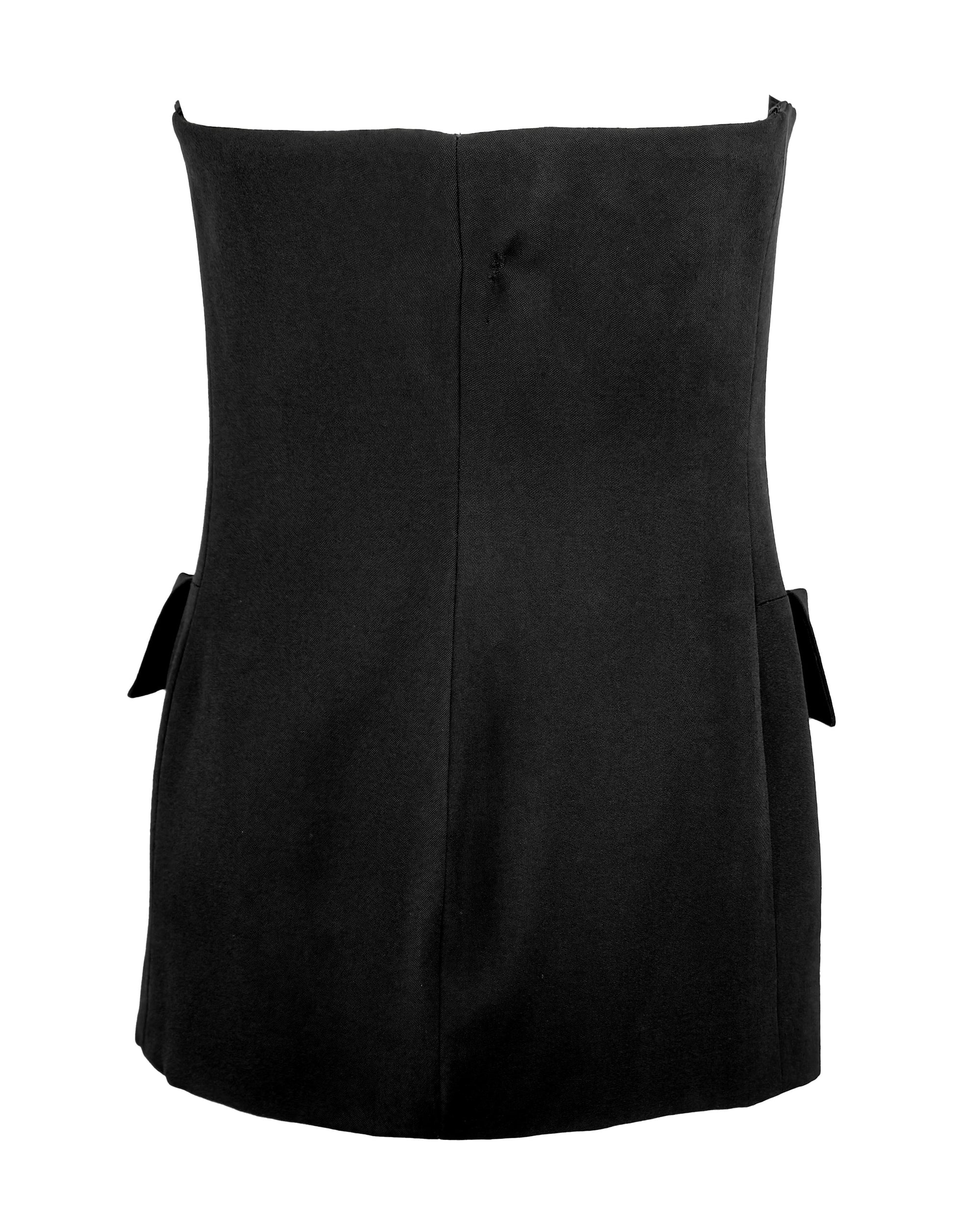 Presenting a striking black mini dress from Yves Saint Laurent Rive Gauche’s Cruise 1989 collection. This tailored piece is designed with a structured double-breasted front, and exaggerated flap pockets. The sleek, silhouette is nipped at the waist for a sculpted, hourglass fit.