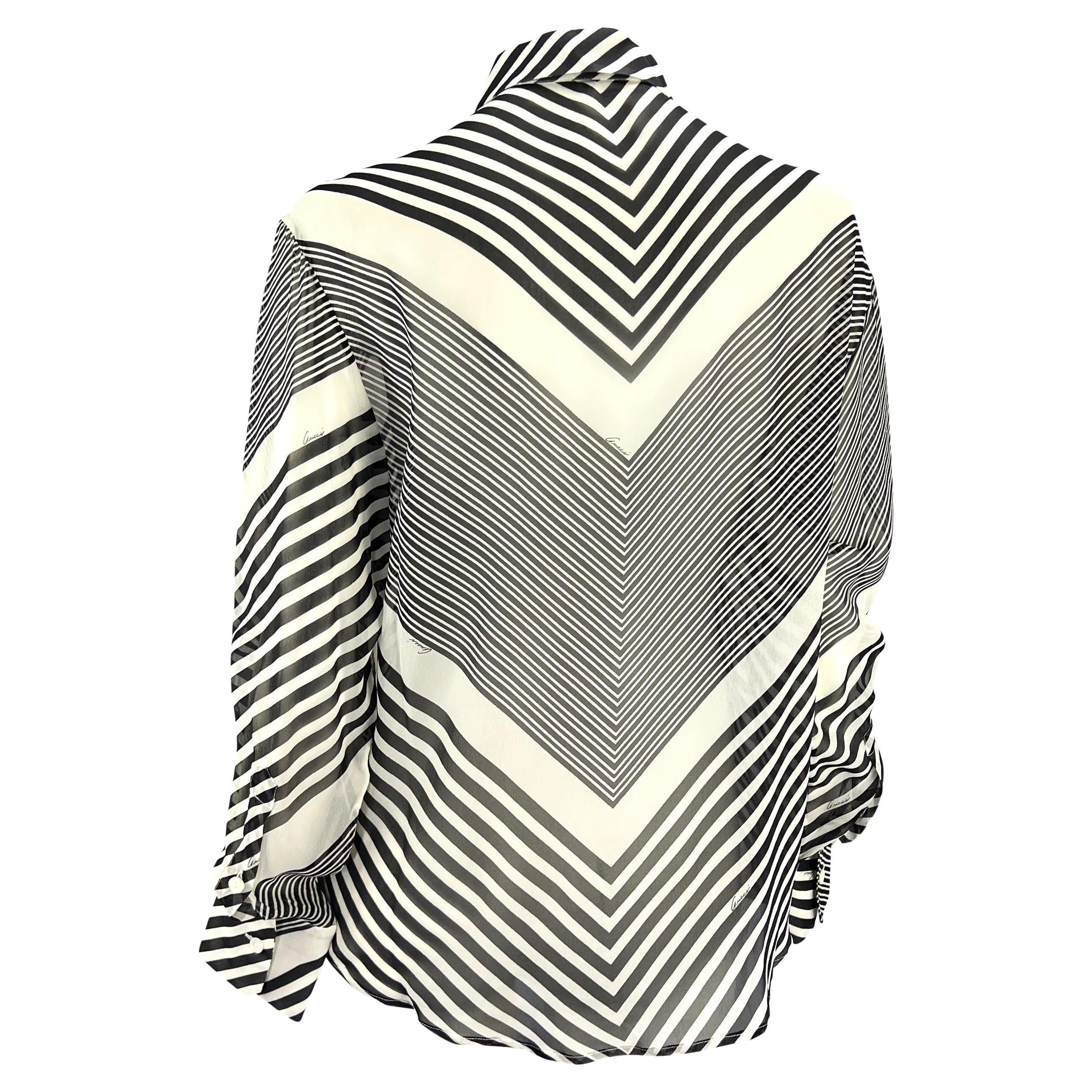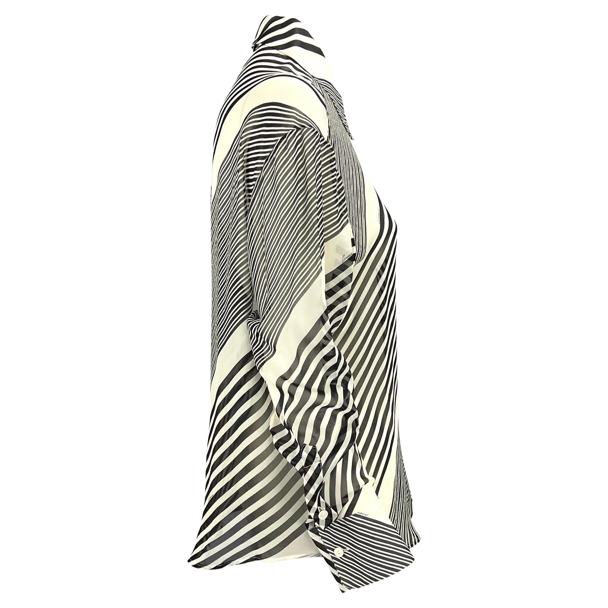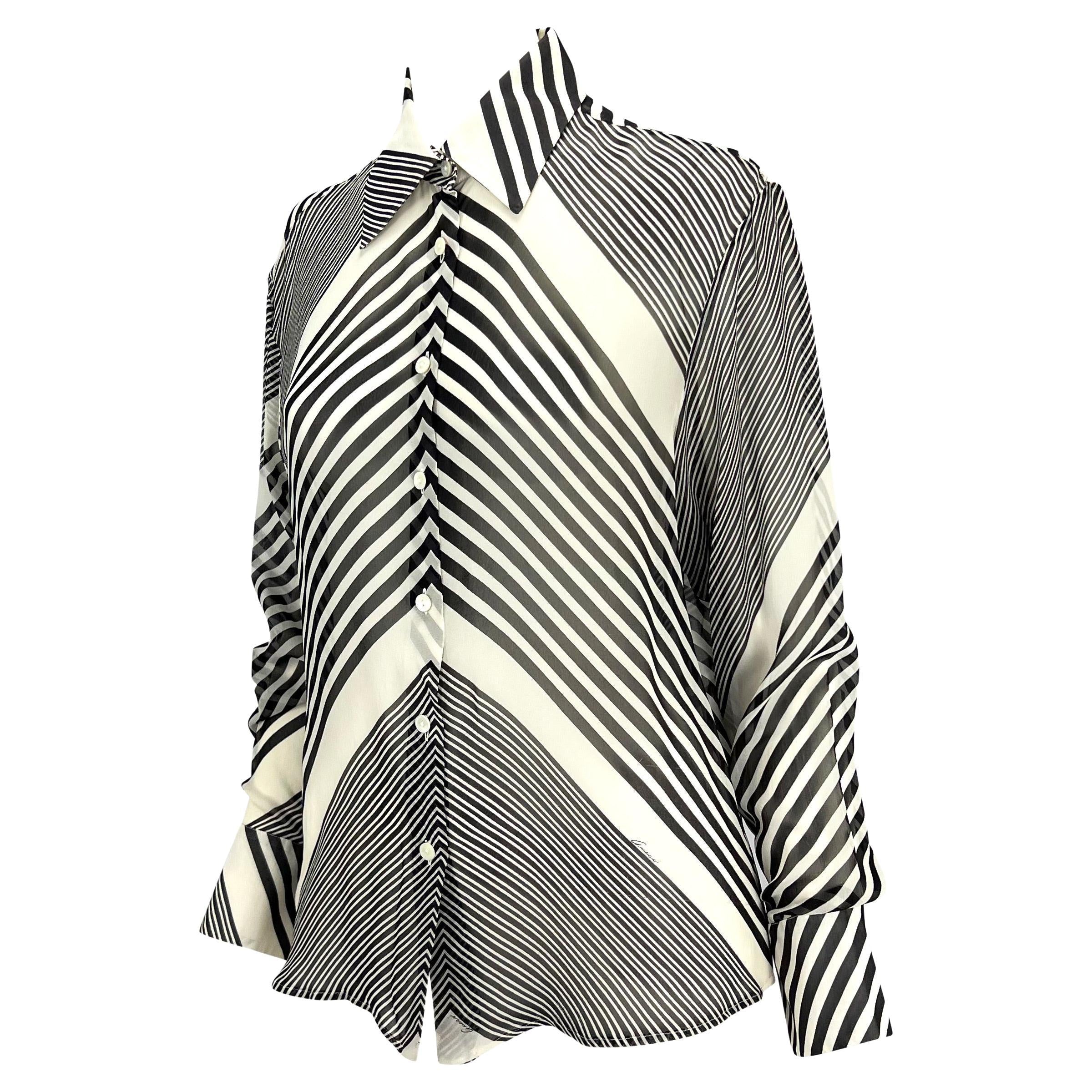 Tom Ford designed this black and white striped Gucci button-down top for the Cruise 2000 collection. With a similar top highlighted in the collection's visuals, this semi-sheer collared top is the perfect Gucci by Tom Ford addition to any wardrobe.