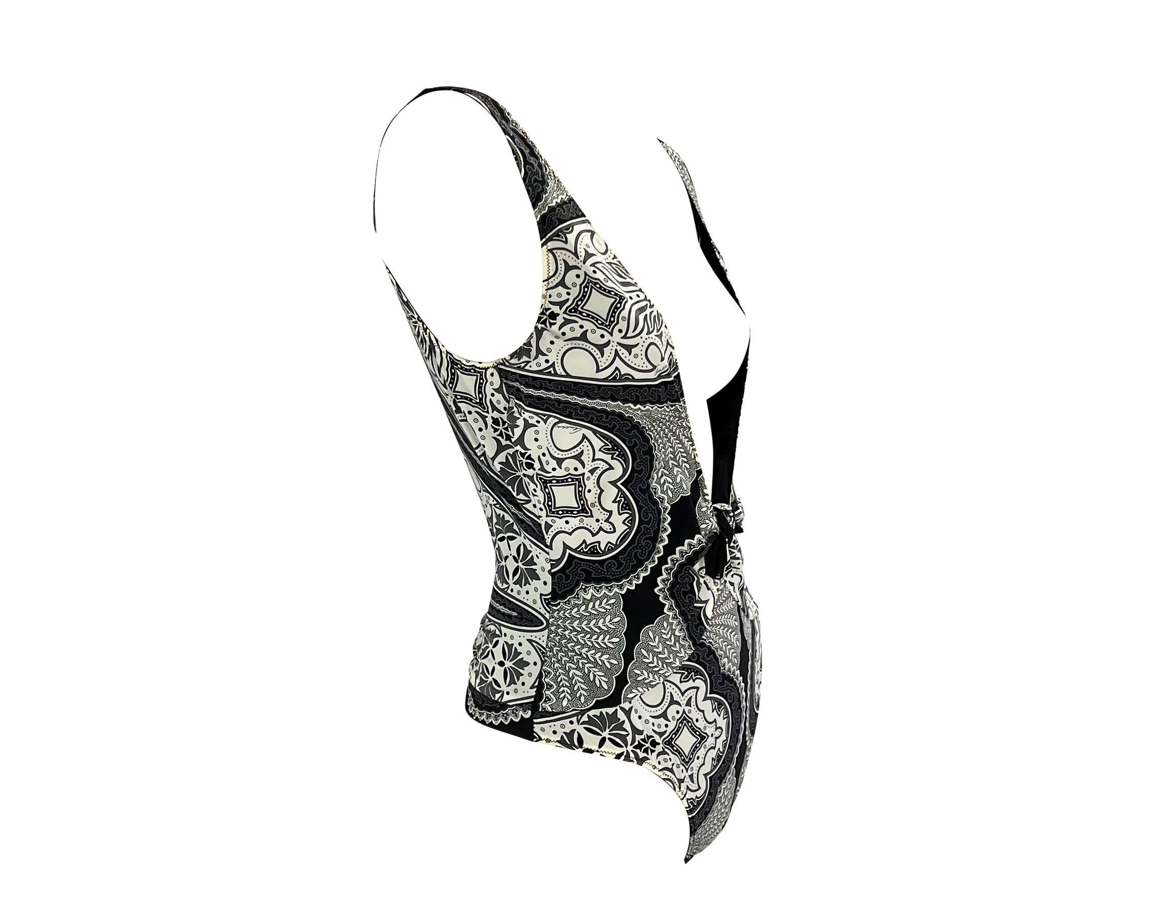 Presenting a black bandana-print one-piece thong Gucci swimsuit designed by Tom Ford. From the 2004 cruise collection, this ultra-sexy one-piece features a plunging neckline with a slight bow and a low-exposed back. This piece in Tom Ford's sought-after bandana print is perfect for any Gucci by Tom Ford lover.