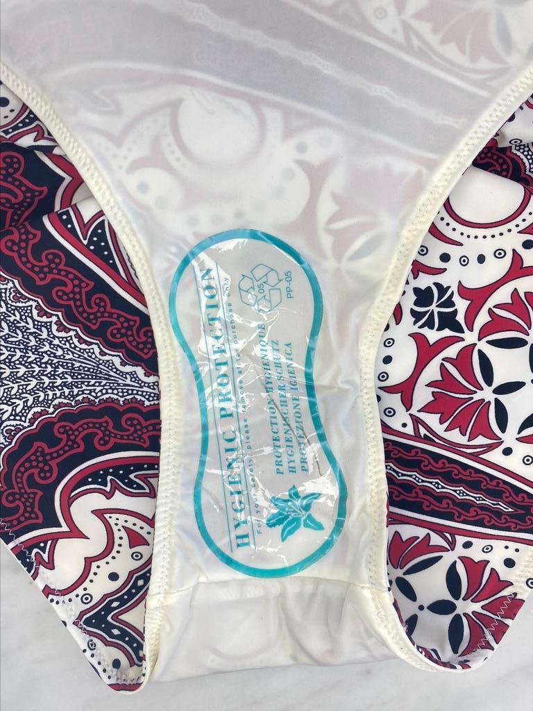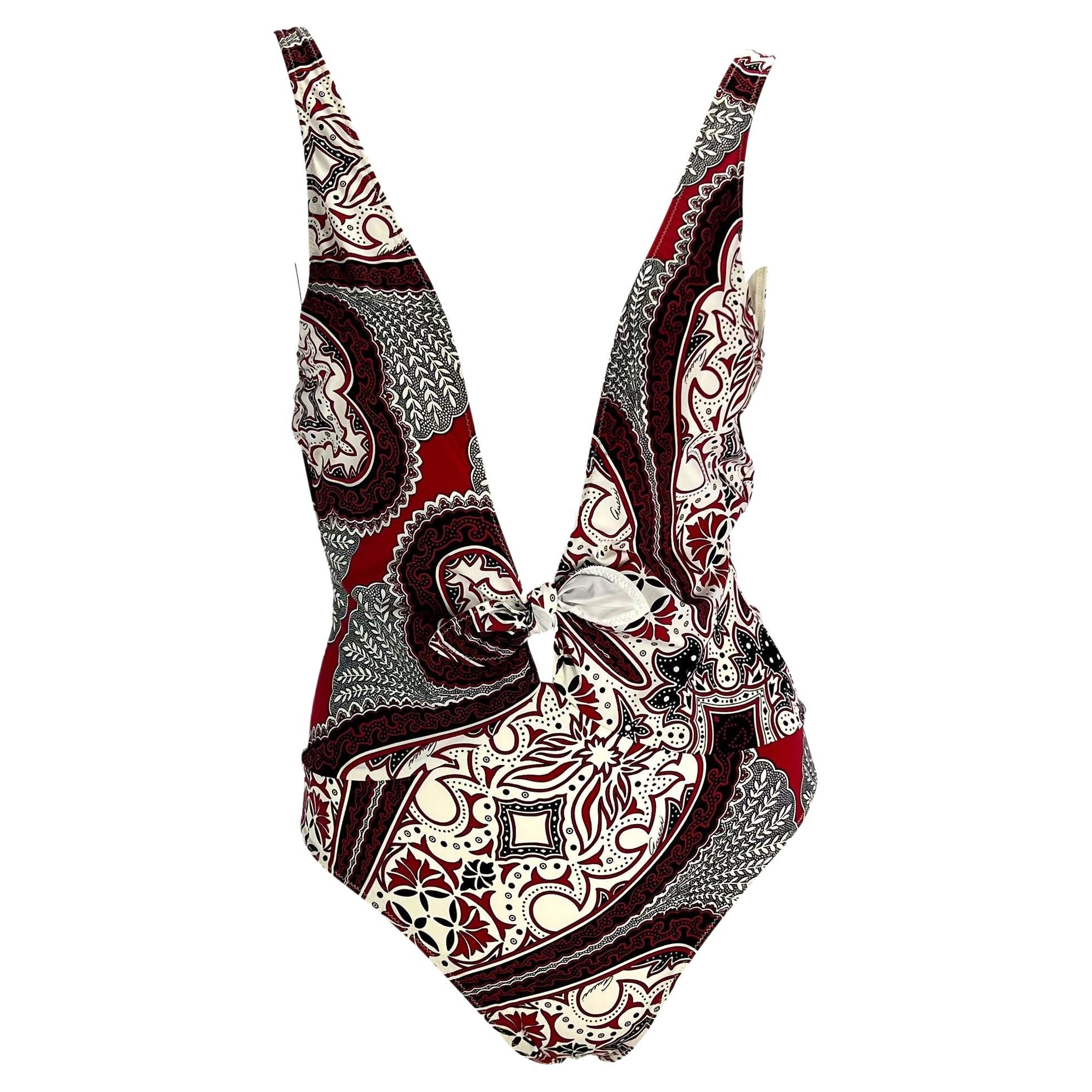 Presenting a red bandana-print one-piece Gucci swimsuit designed by Tom Ford. From the 2004 cruise collection, this ultra-sexy one-piece features a plunging neckline with a small bow and a low-exposed back. Nearly 20 years old and unused, this piece in Tom Ford's sought-after bandana print is perfect for any Gucci by Tom Ford lover.