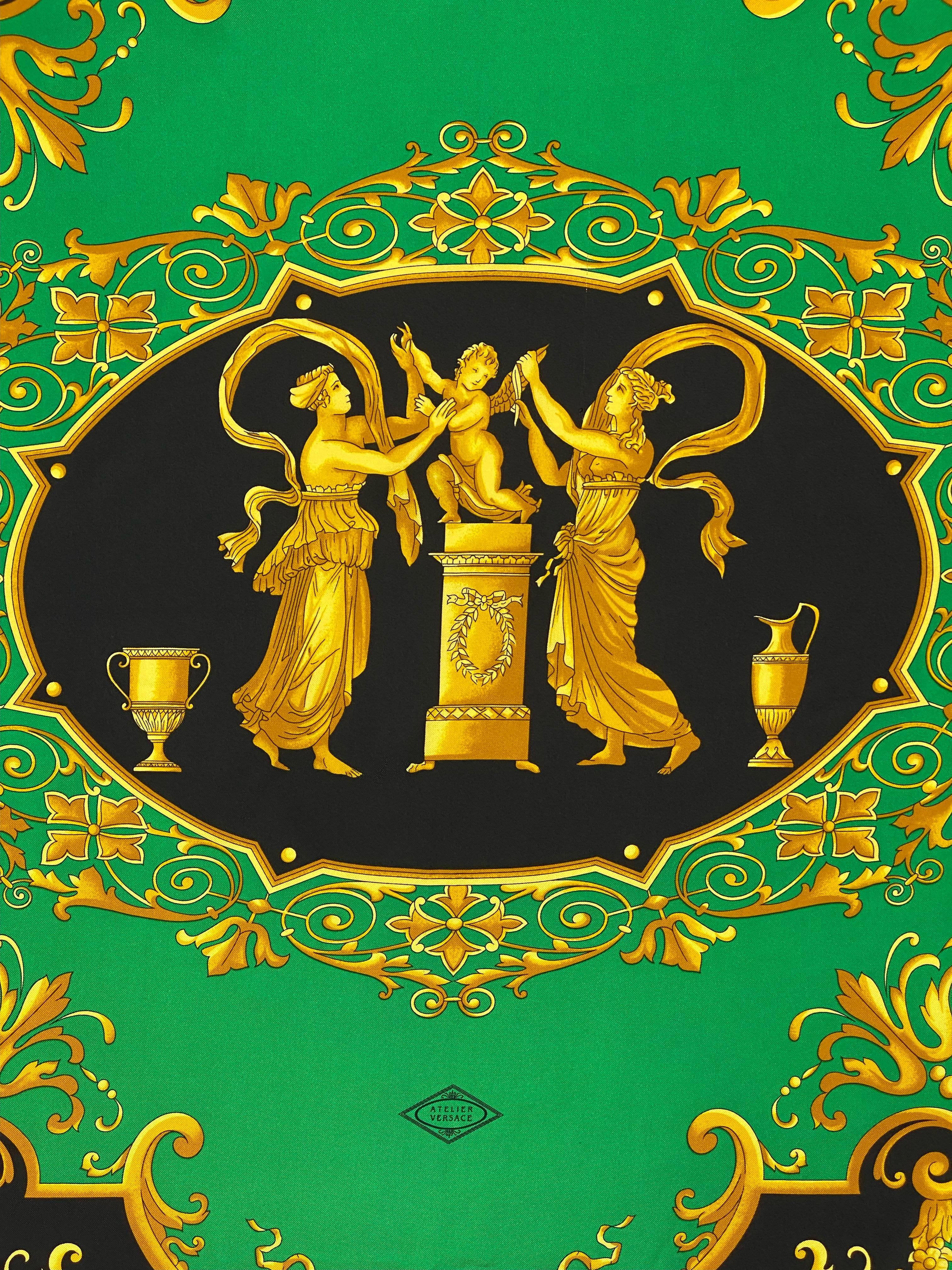 Presenting a beautiful baroque Atelier Versace square silk scarf designed by Gianni Versace. This scarf features Roman/Greek mythological scenes with a bright green backdrop and floral baroque pattern.