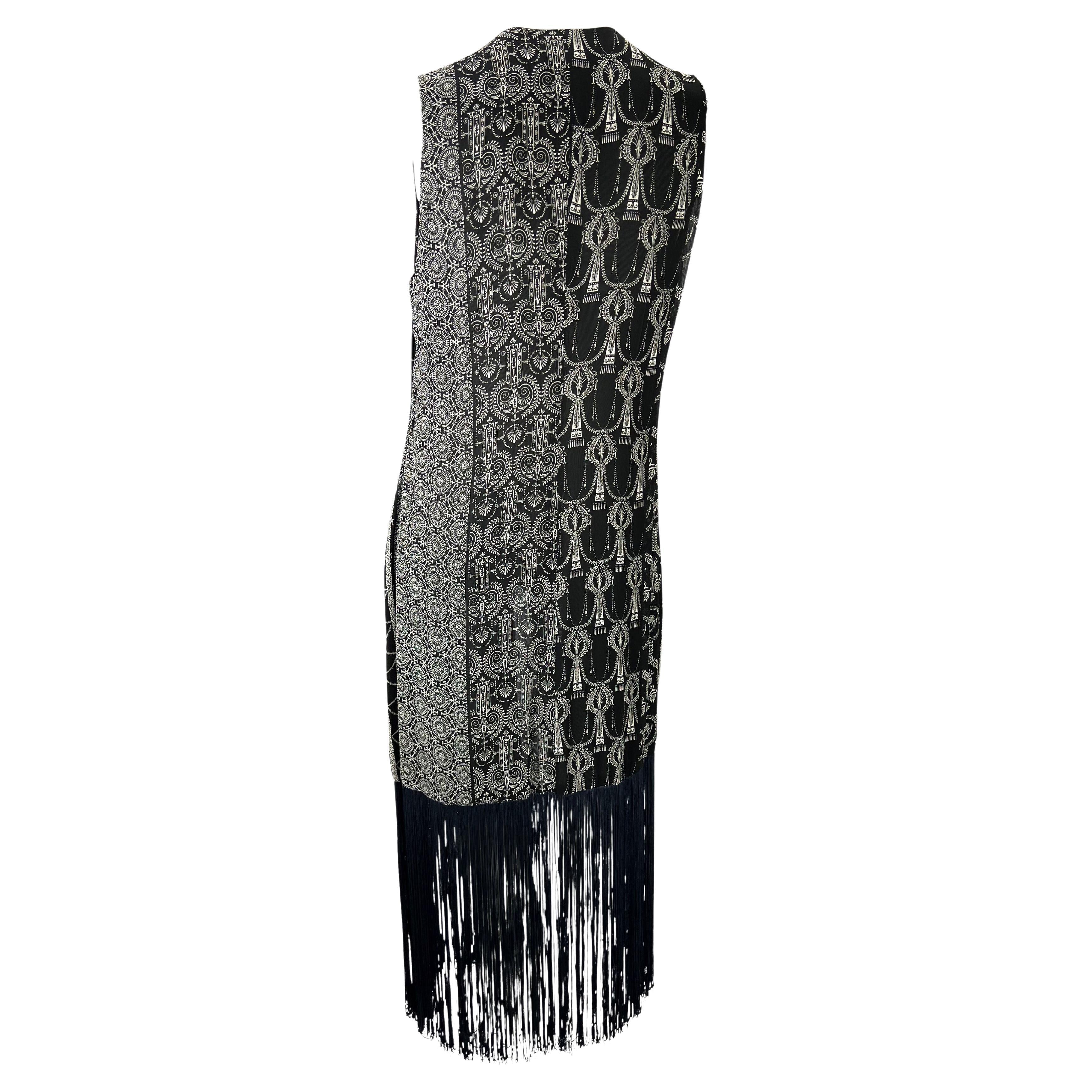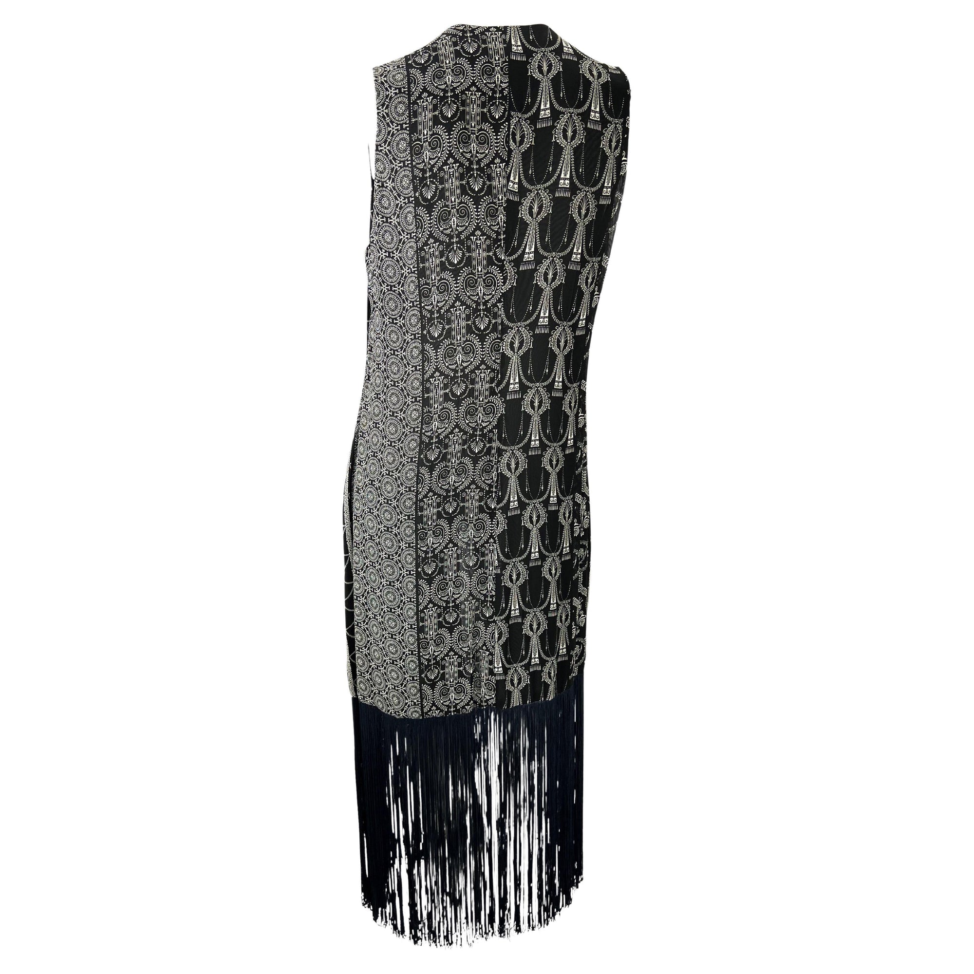 Presenting a vintage Dolce and Gabbana black and white fringe duster. From the 1990s, this lightweight tie vest features black and white monochrome Bohemian-inspired patterns and fringe at the hem. This beautiful piece is perfect for layering and can be dressed up or down. *Jacket measurements do not include the fringe, which is 14 inches long at the bottom of the coat.*