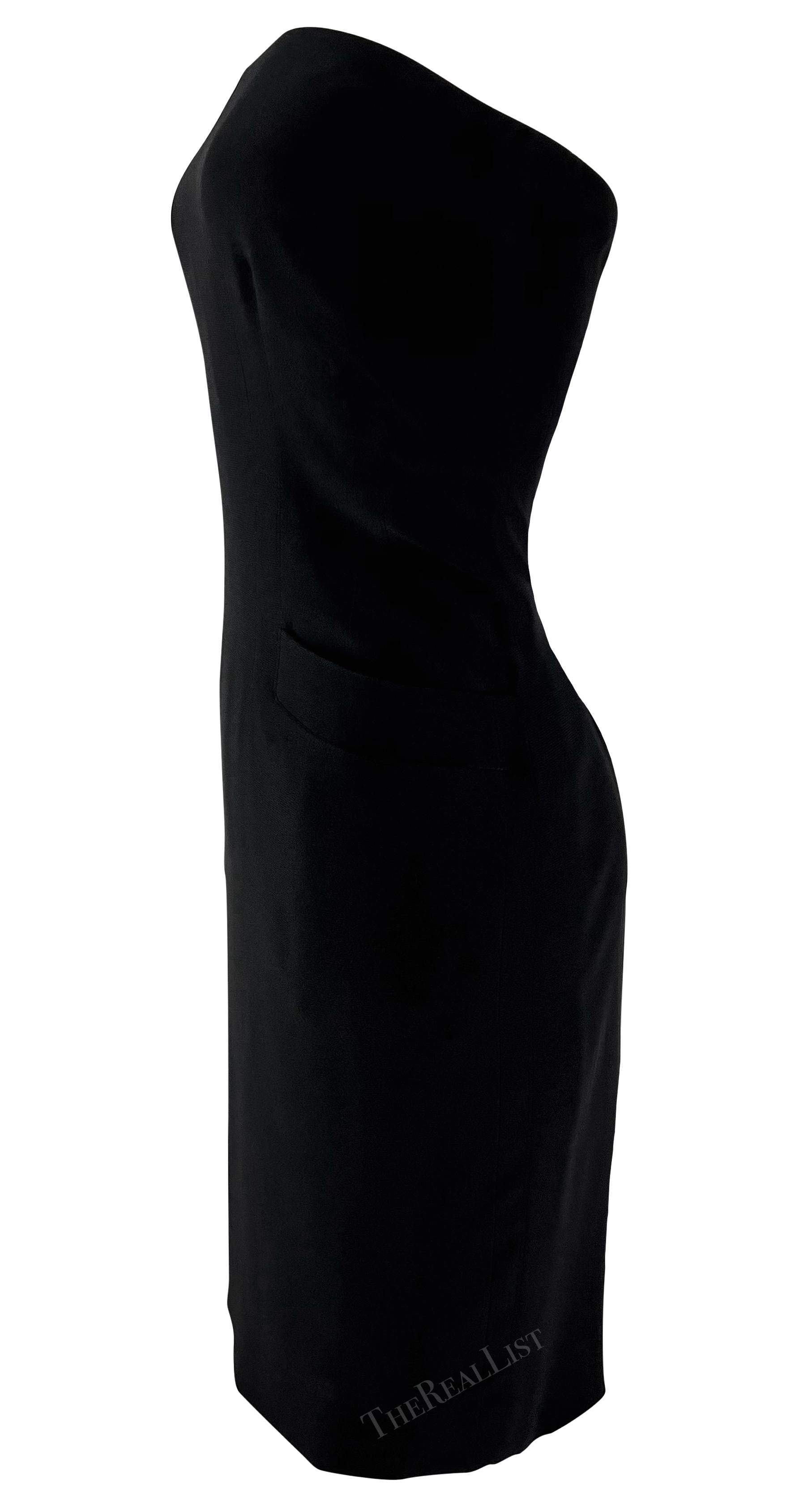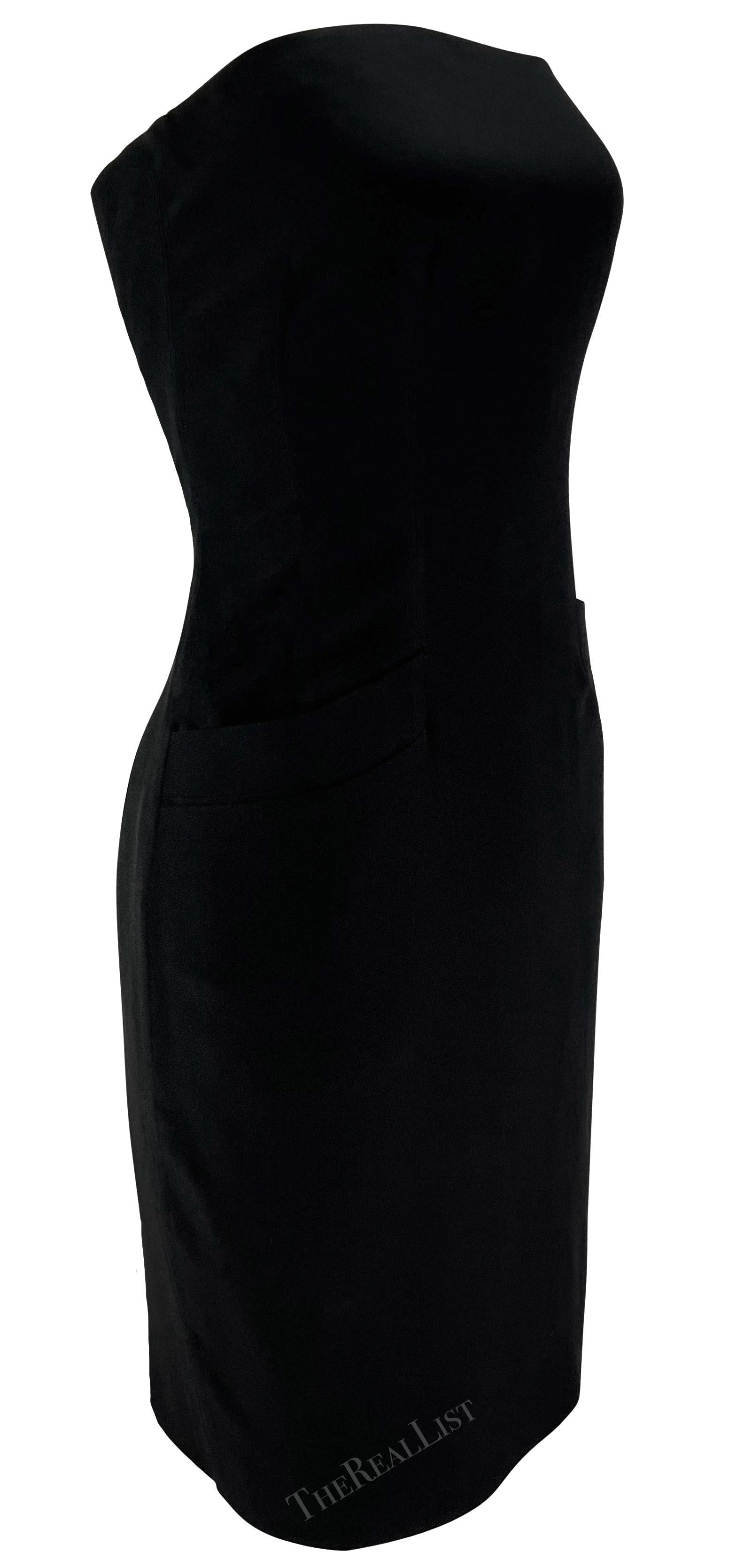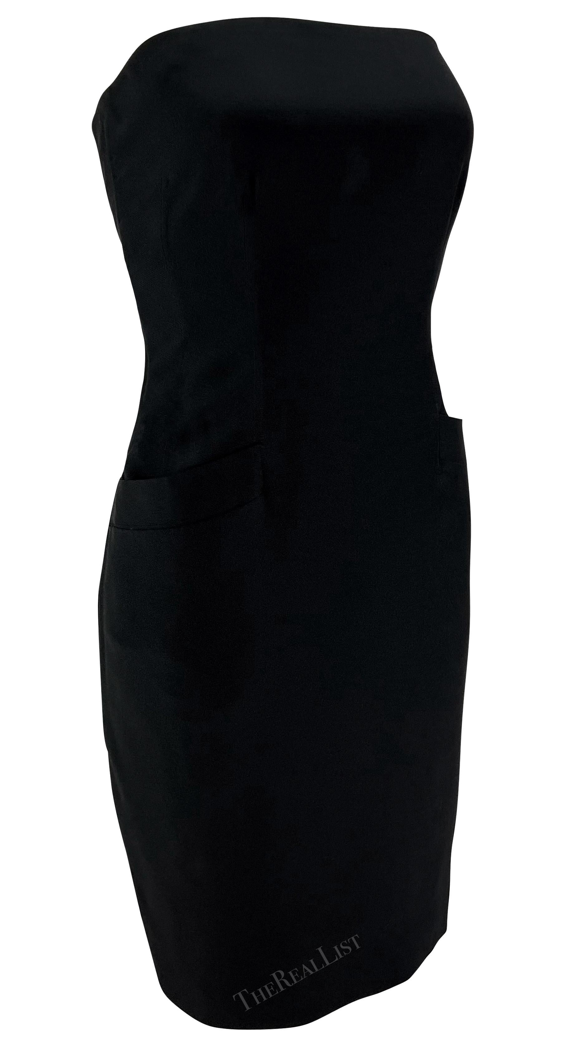 Early 1990s Donna Karan Boned Strapless Black Pocket Mini Dress