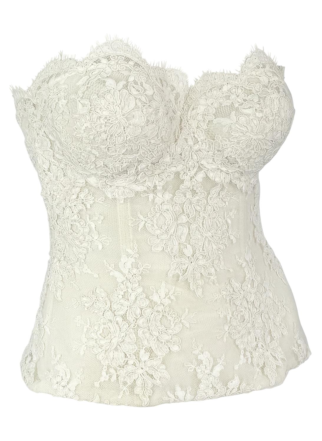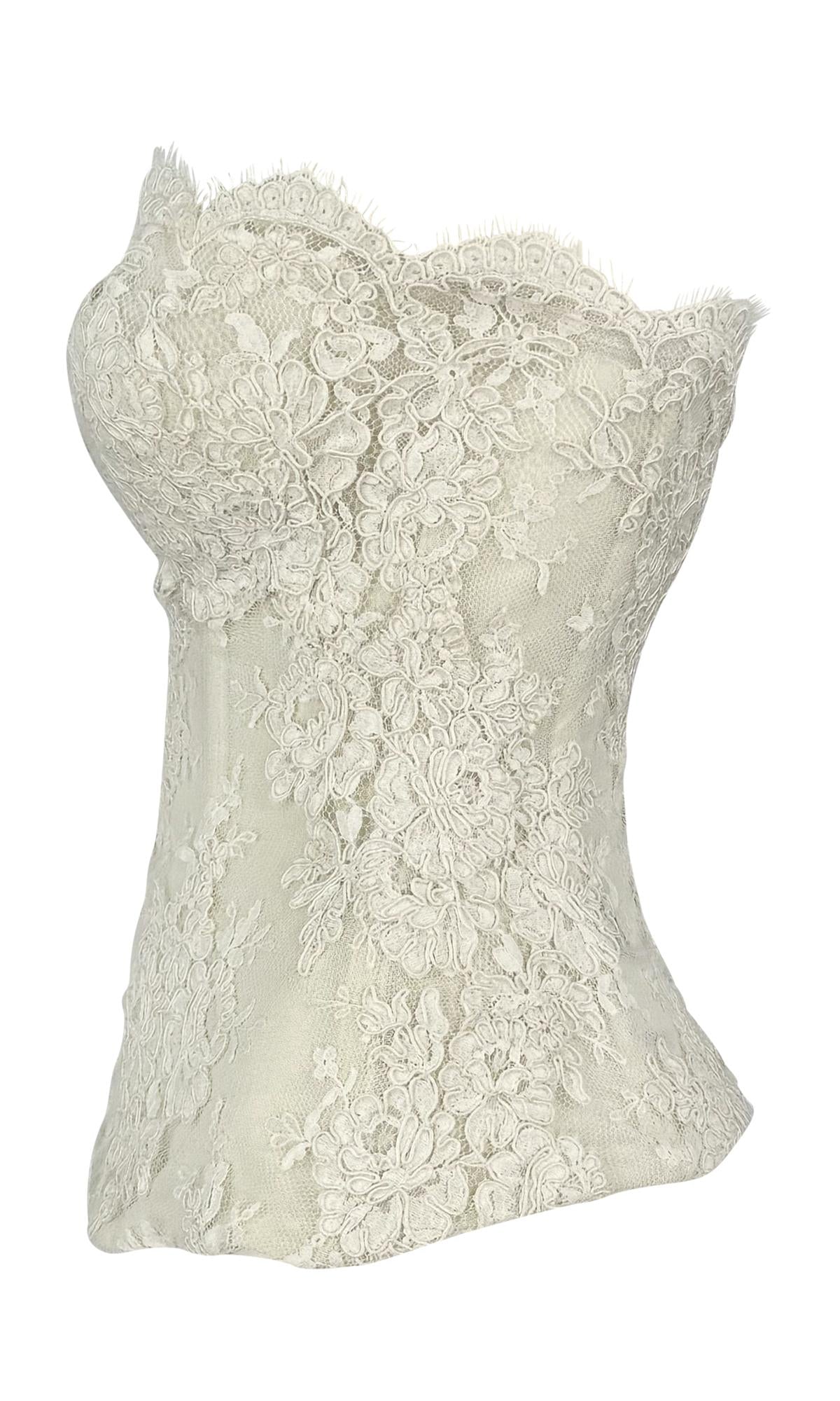 From the early 1990s, this Donna Karan strapless bustier top is crafted from sheer white lace with intricate an floral motif. Structured with internal boning for a sculpted, corset-like fit, the design features a sweetheart neckline and scalloped lace edging.