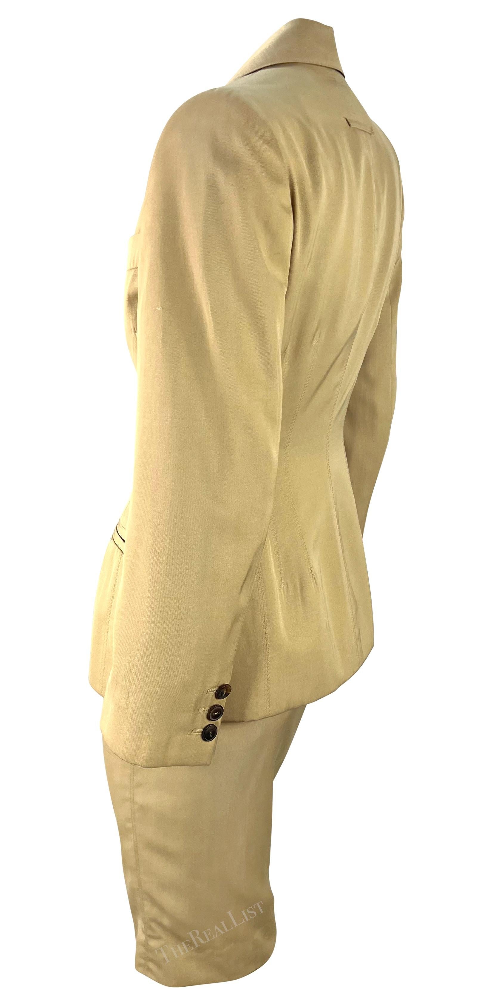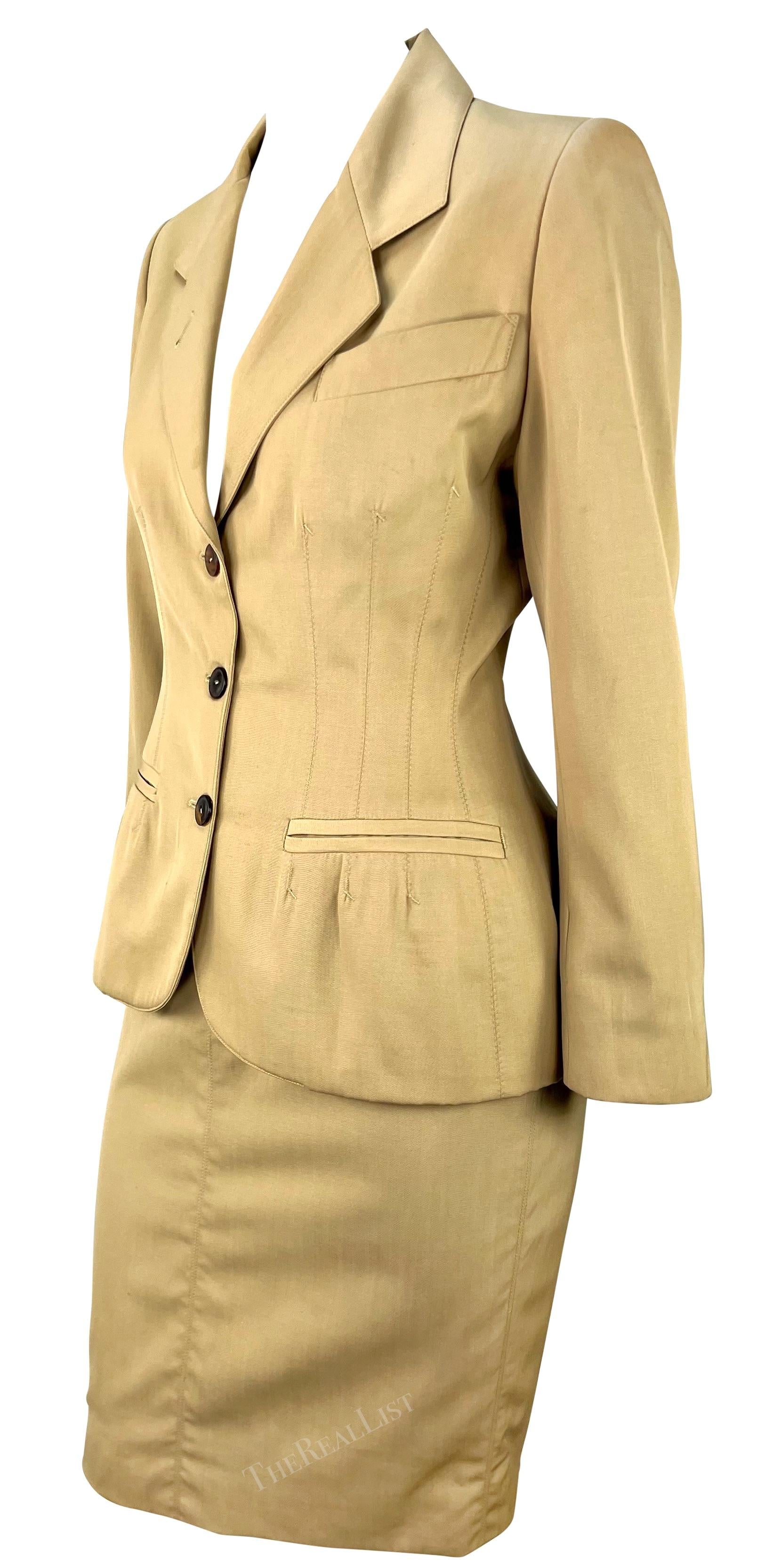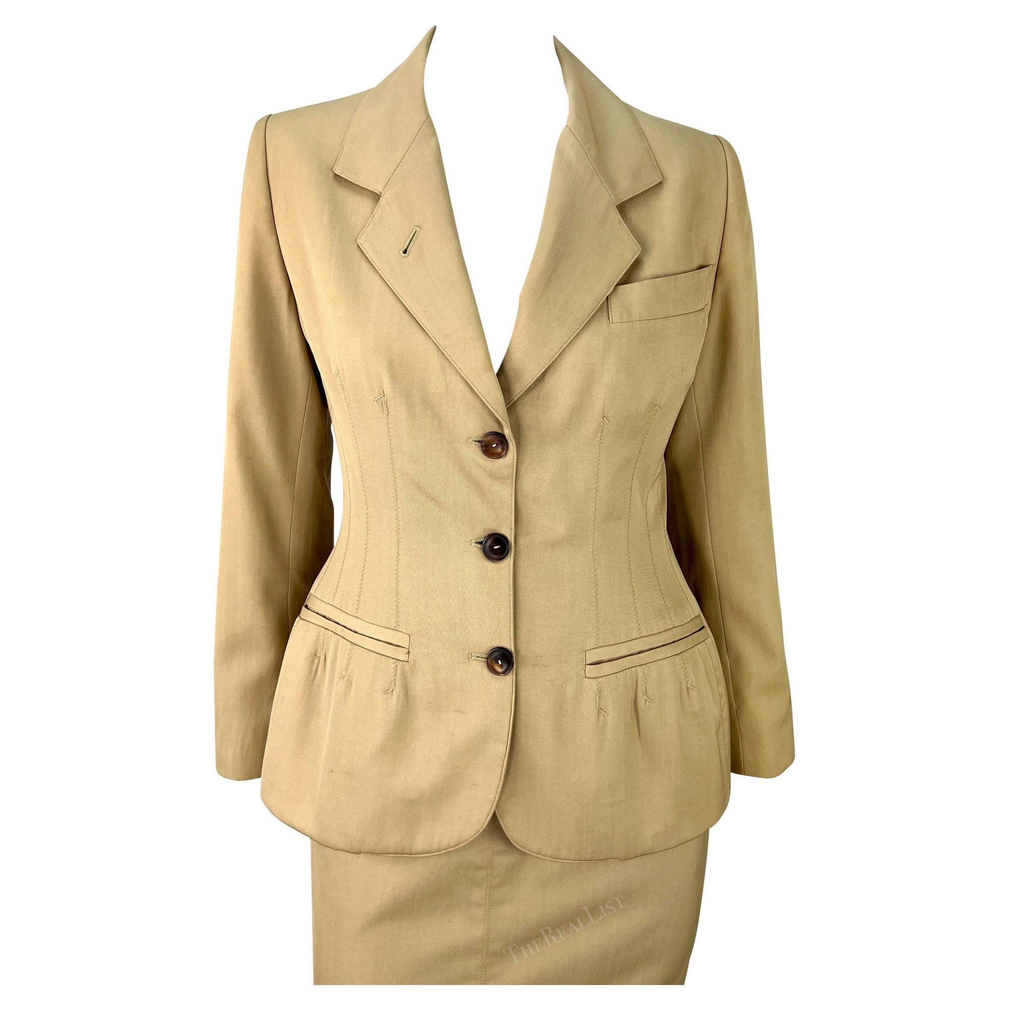 Presenting a sleek beige Jean Paul Gaultier skirt suit. From the early 1990s, this suit consists of a fitted blazer and matching pencil skirt. The blazer features a peak lapel, darts at the waist, and light padding at the hem.