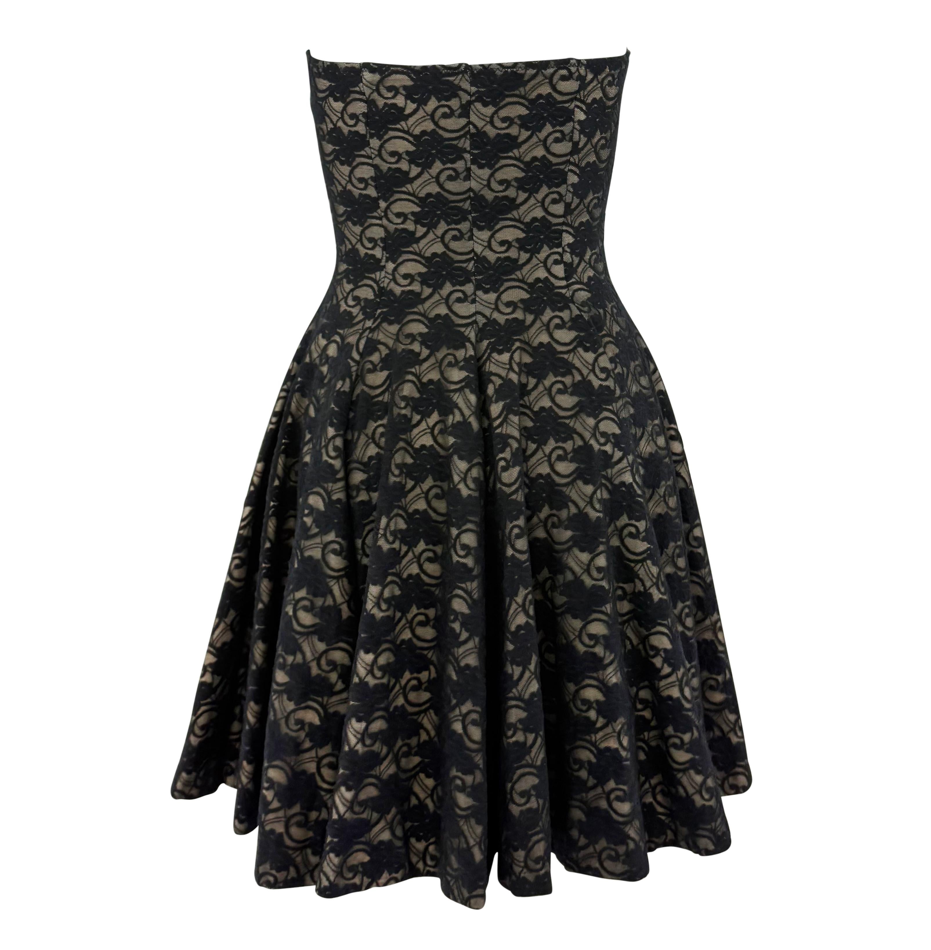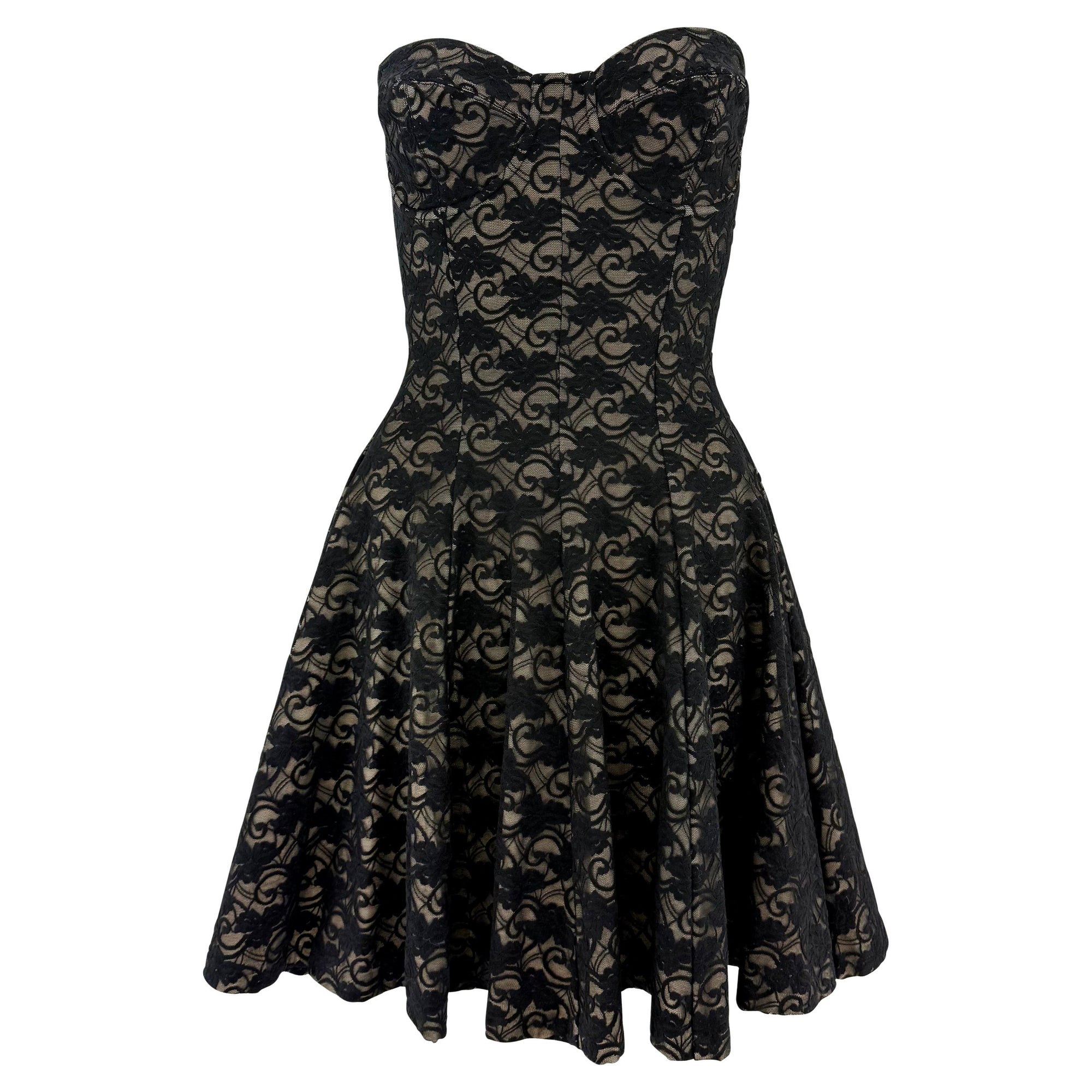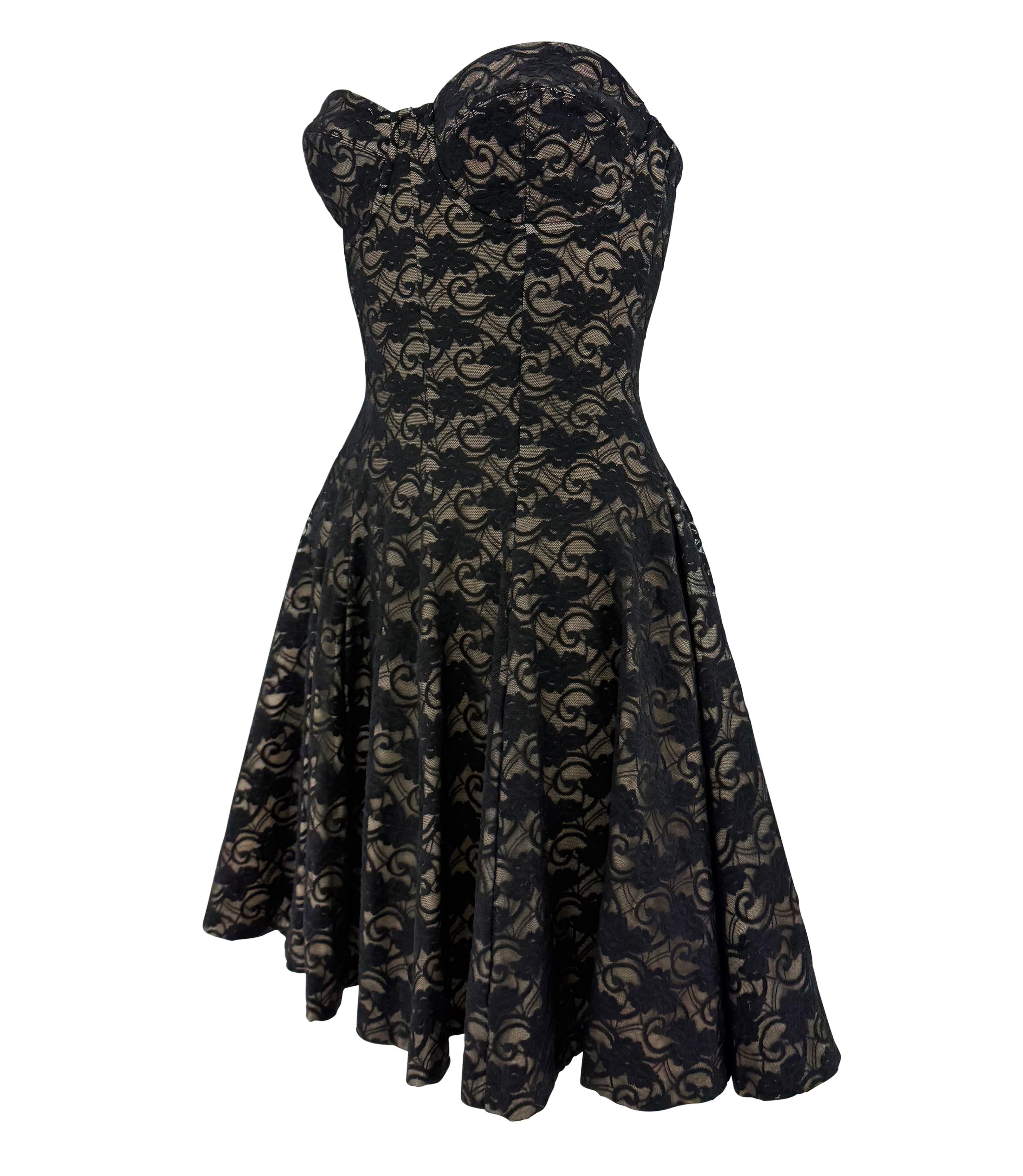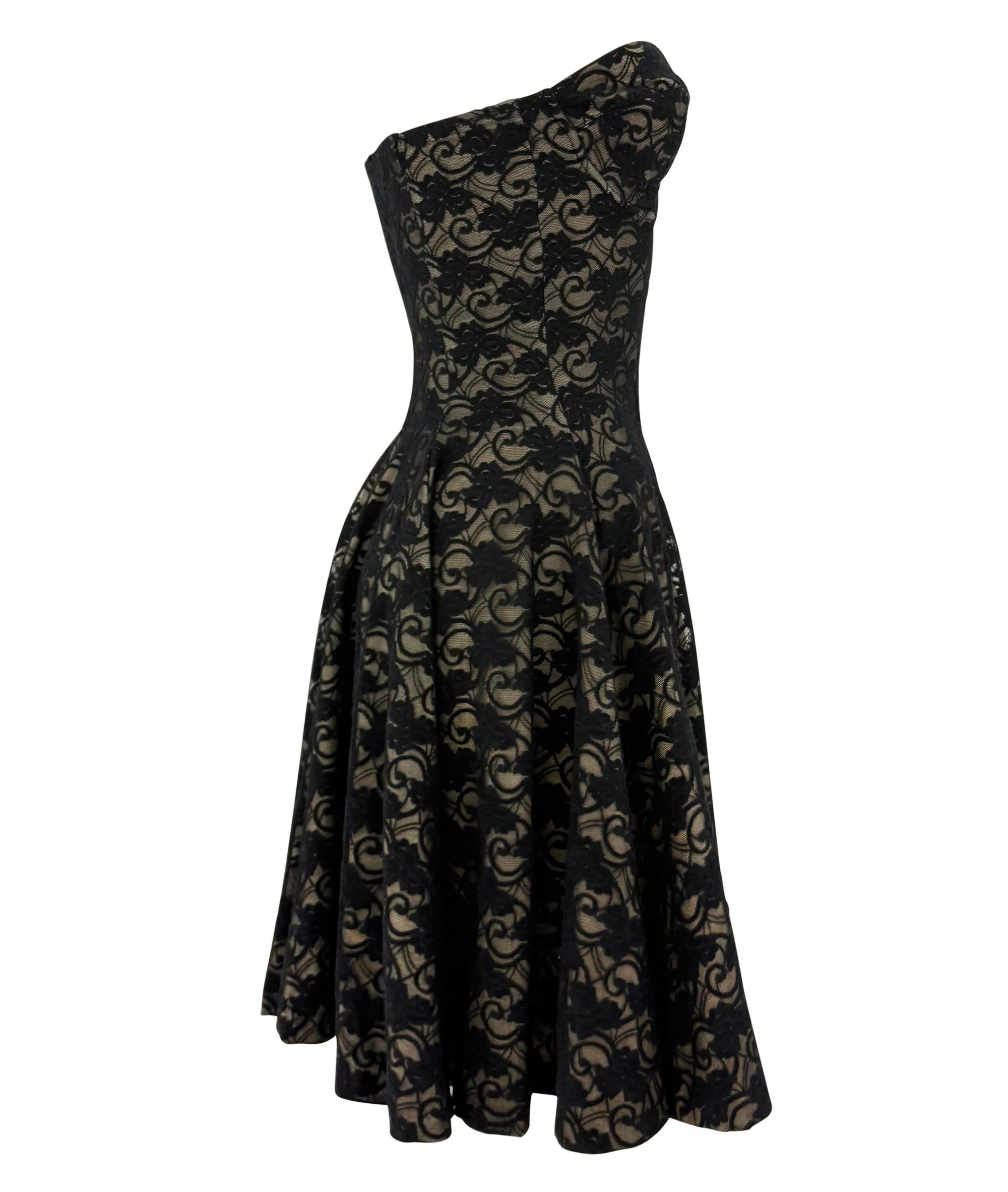 This early 1990s Norma Kamali mini dress features a structured strapless bodice and a flared skirt. The design is crafted with a black lace overlay atop a nude under layer.