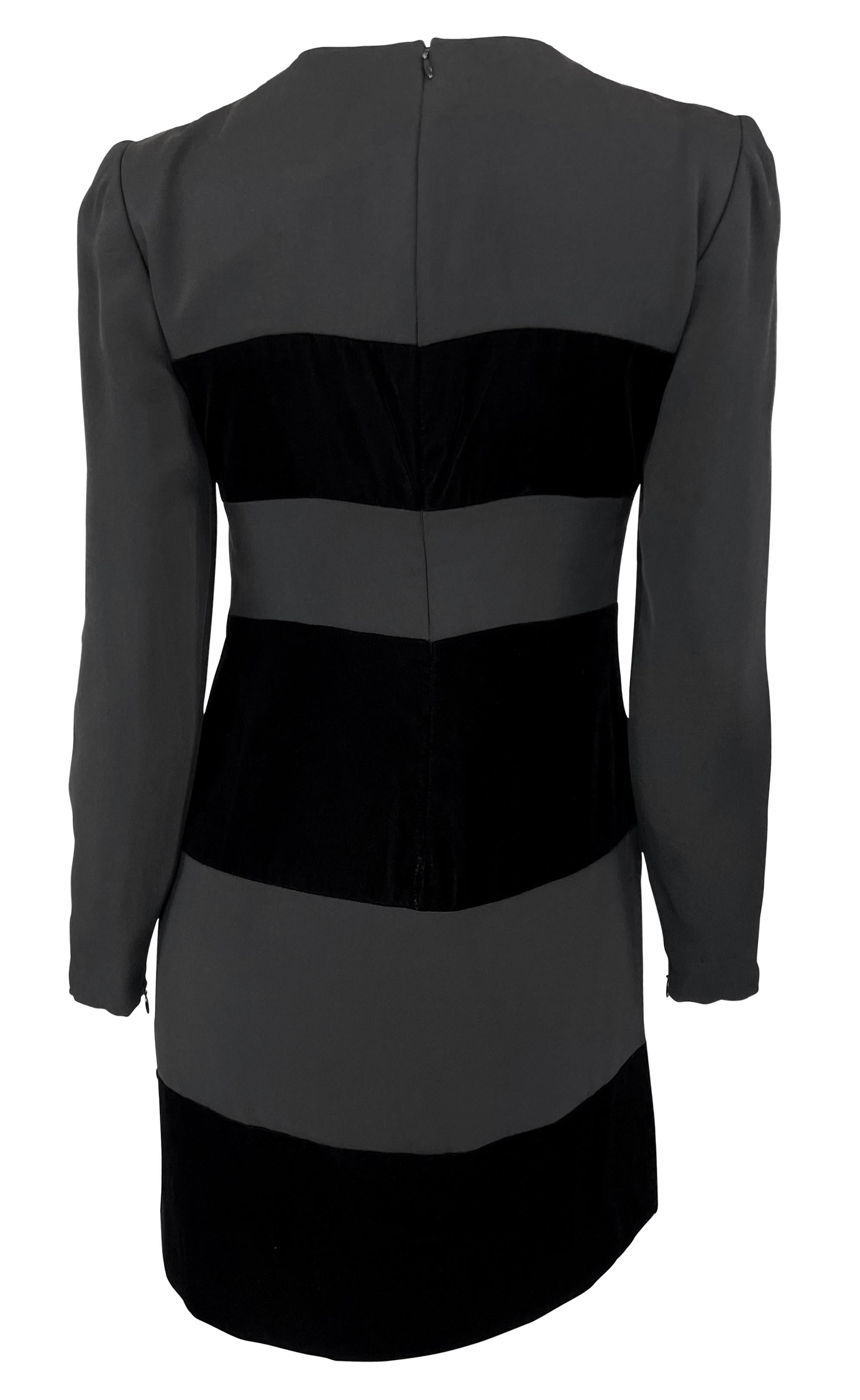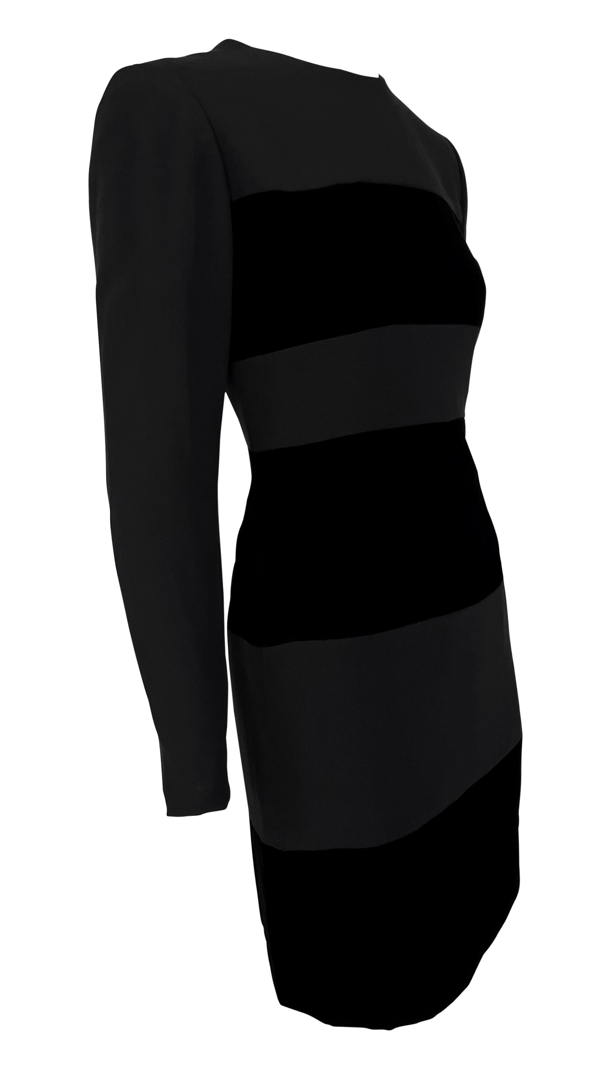This Oscar de la Renta dress from the 1990s features a sophisticated design with alternating black velvet and matte fabric panels. The dress has a long-sleeved, fitted silhouette with a round neckline and a back zipper closure.