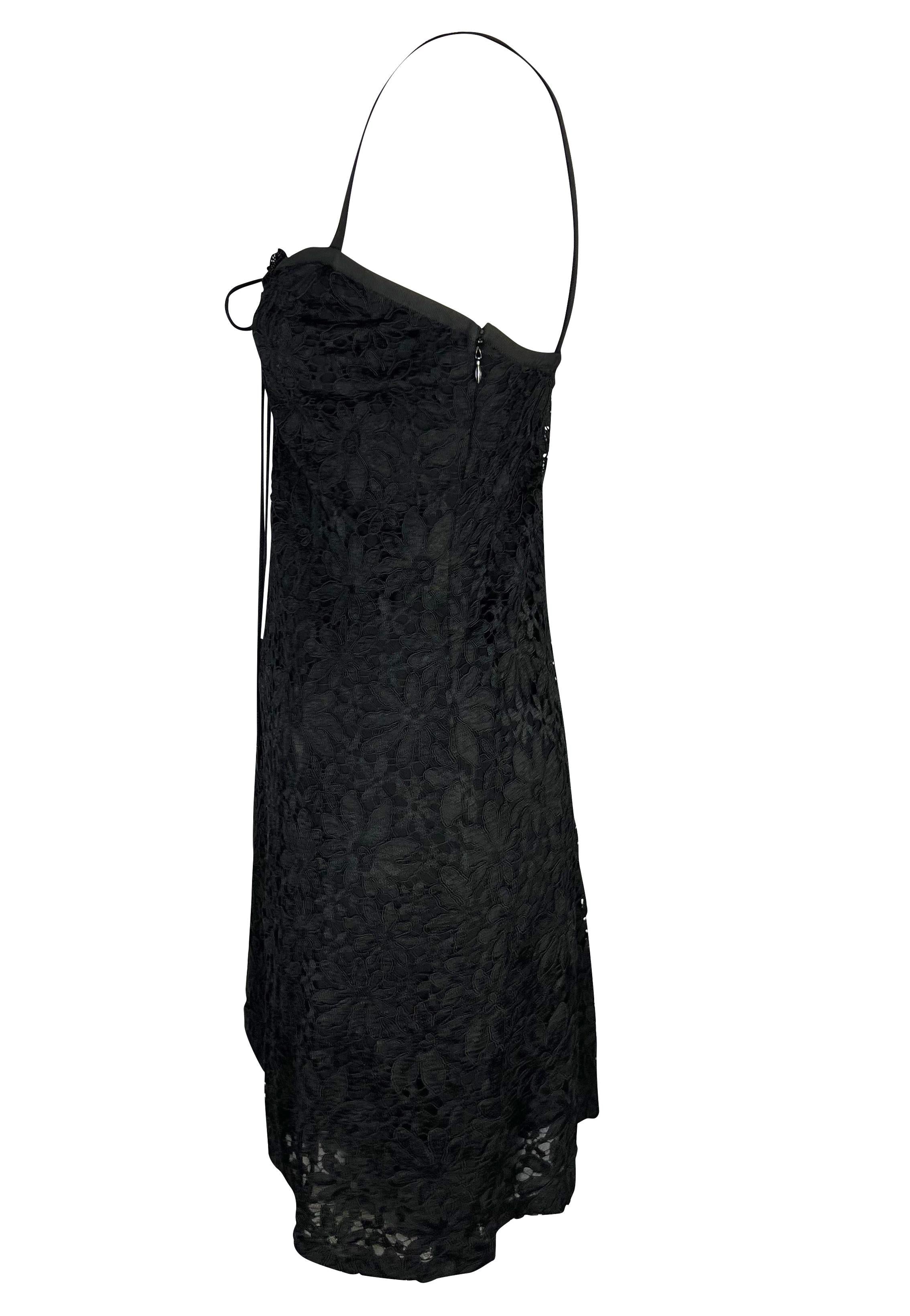 Presenting a black lace Yves Saint Laurent Rive Gauche mini dress. From the early 1990s, this beautiful dress is covered in lace and features a sweetheart-style neckline with spaghetti straps and a plunging lace-up detail at the front. Effortlessly chic and timeless, this little black dress is the perfect addition to any wardrobe!