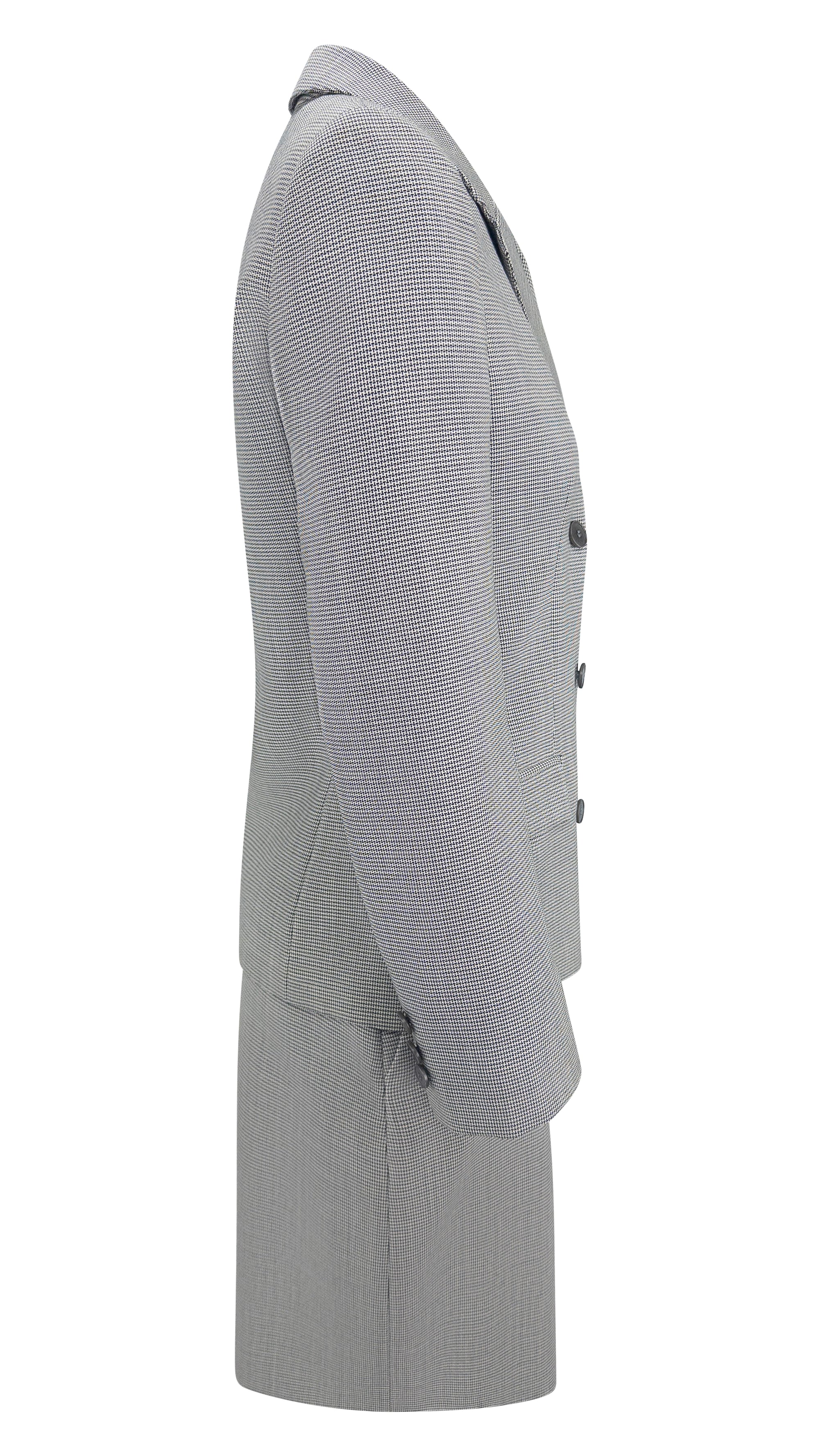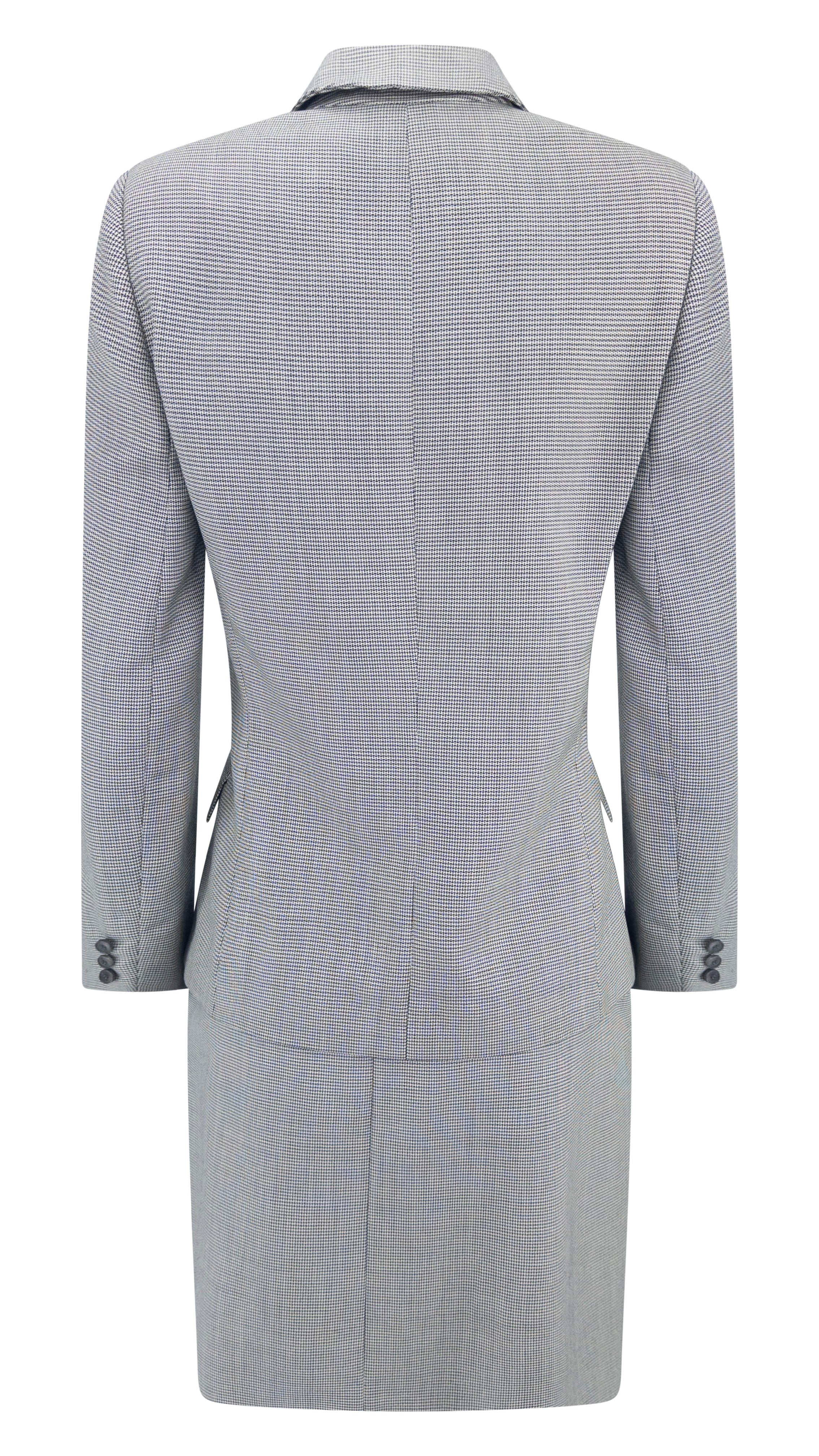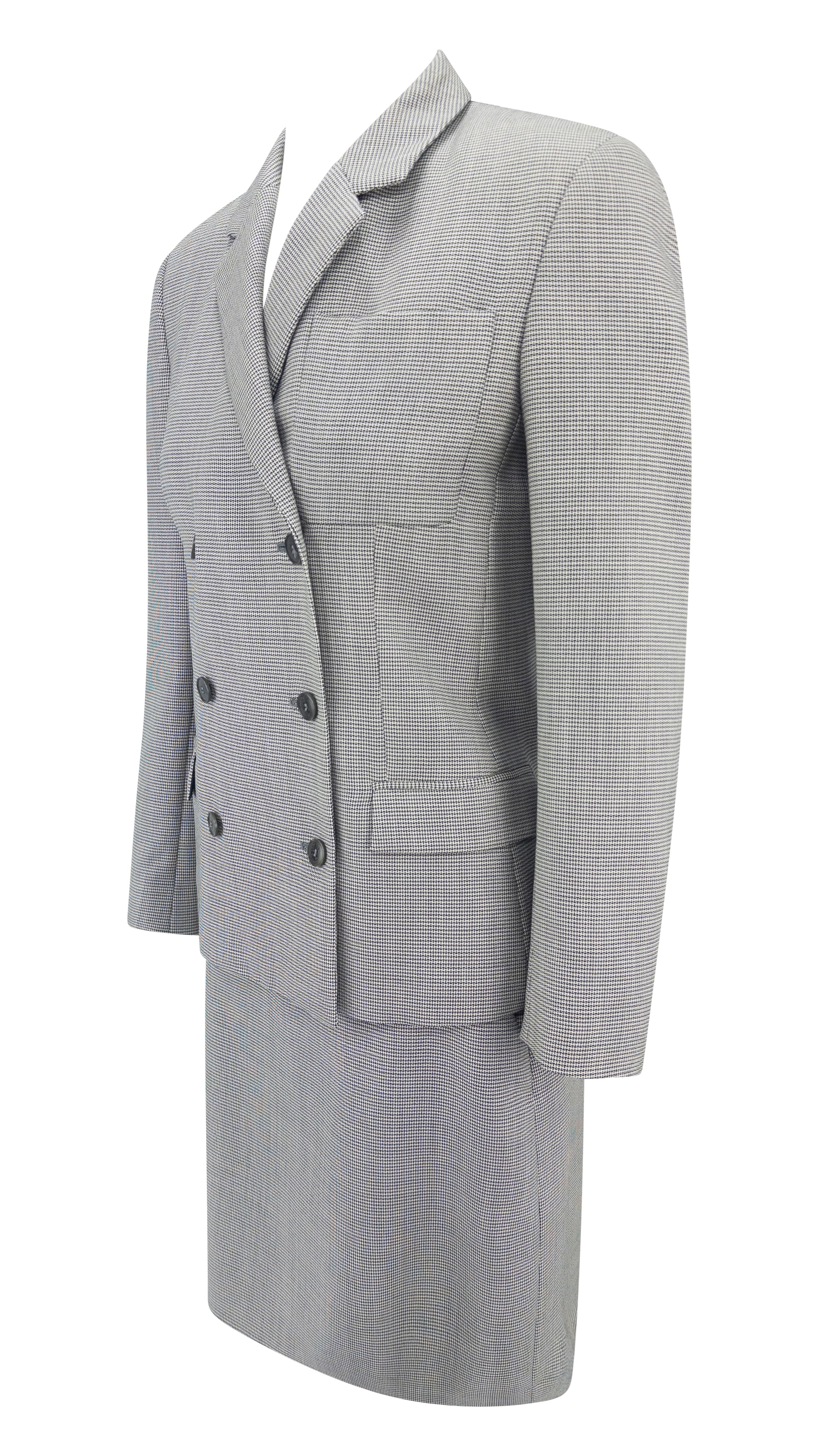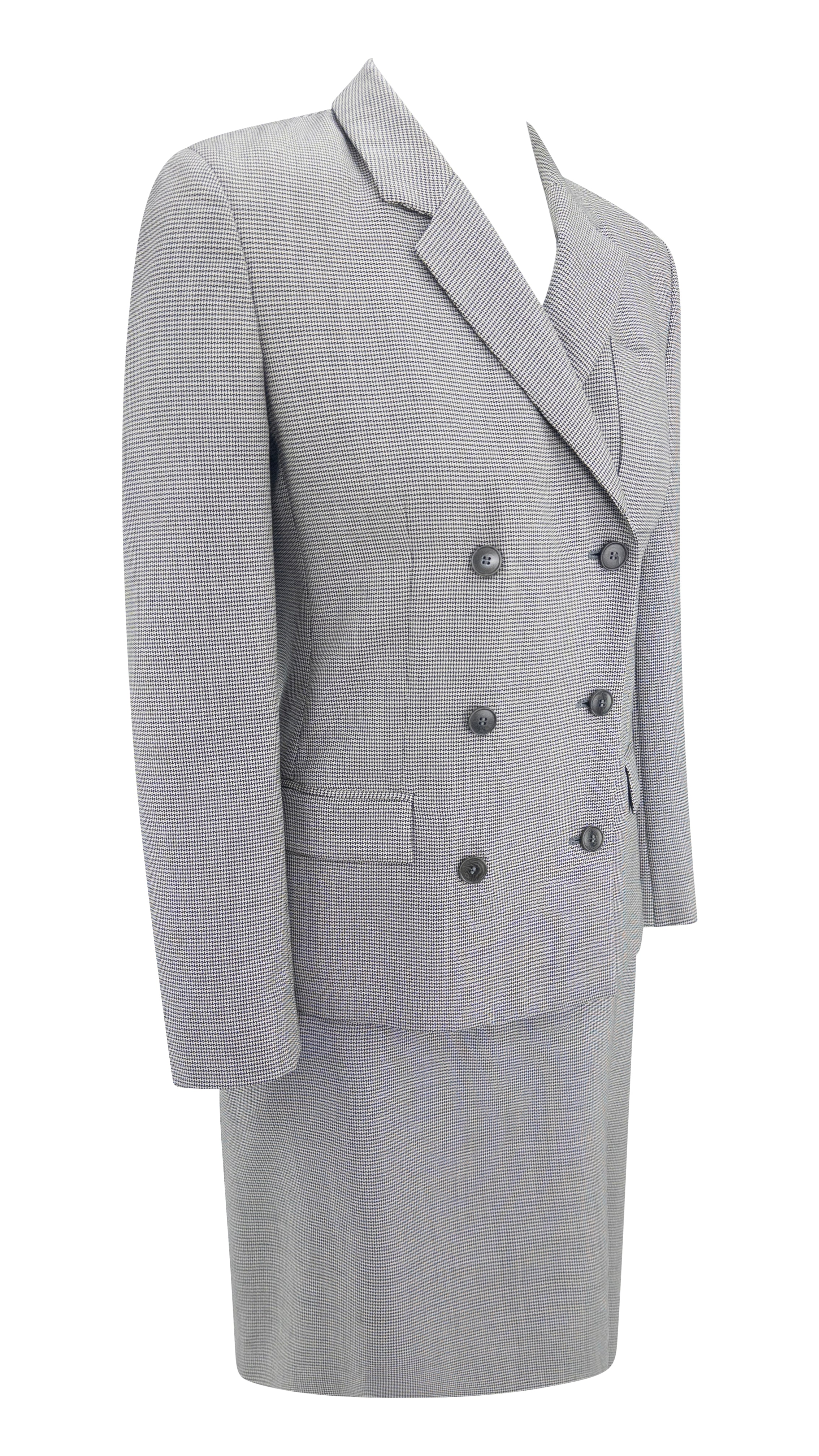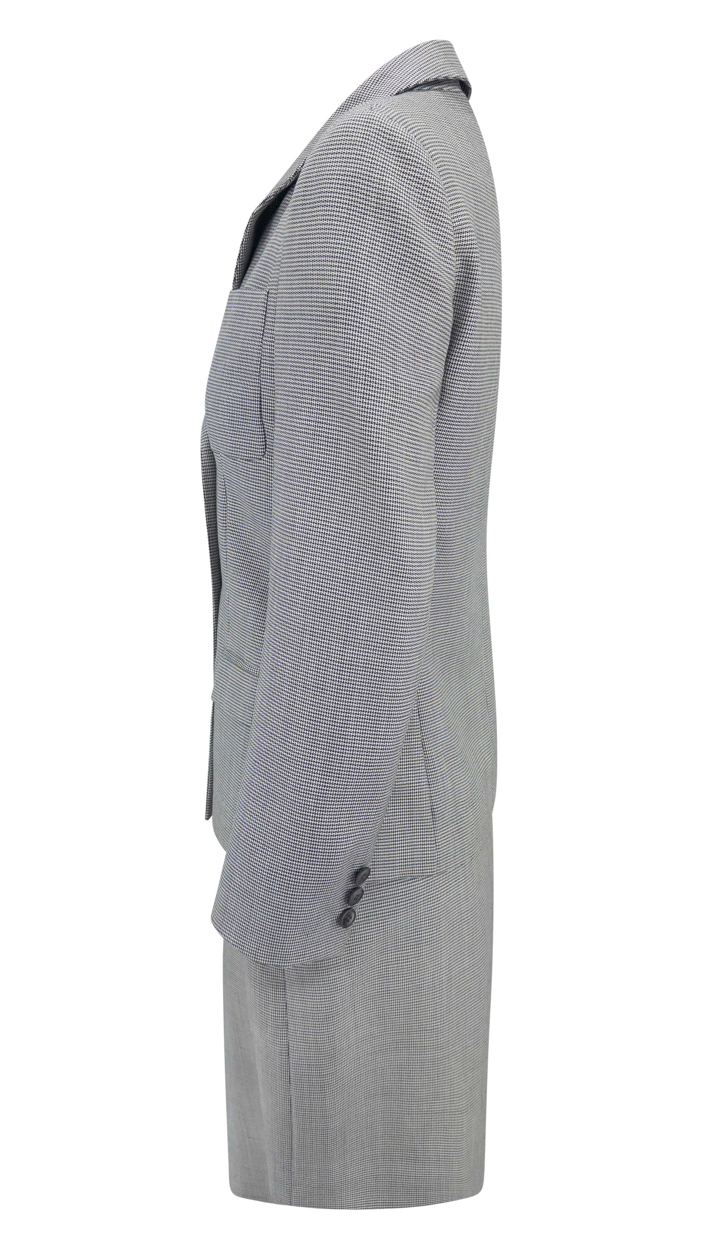 This Calvin Klein grey wool-mohair skirt suit from the early 2000s is tailored with a subtle check pattern. The double-breasted jacket features a notched lapel, structured shoulders, and a defined waist, paired with a matching mini skirt. Finished with flap pockets and buttoned cuffs, the set reflects the minimalist, precision-cut tailoring that defines Klein’s aesthetic.